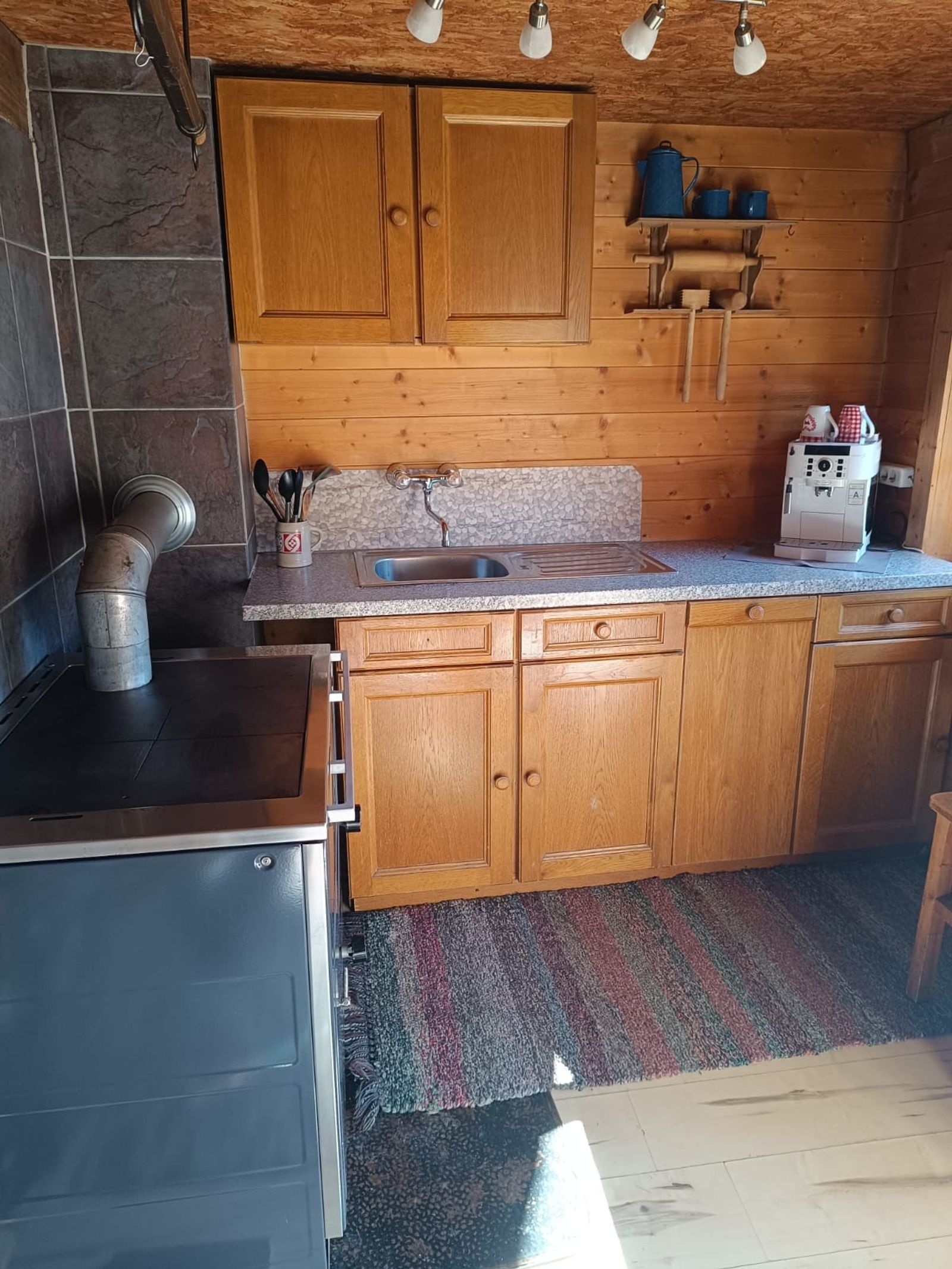 - Küche mit Holzherd, Backrohr, Kühlschrank mit Gefrierfach, Kaffeemaschine und Wasserkocher