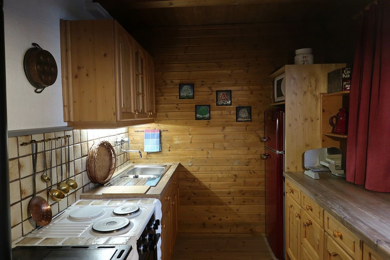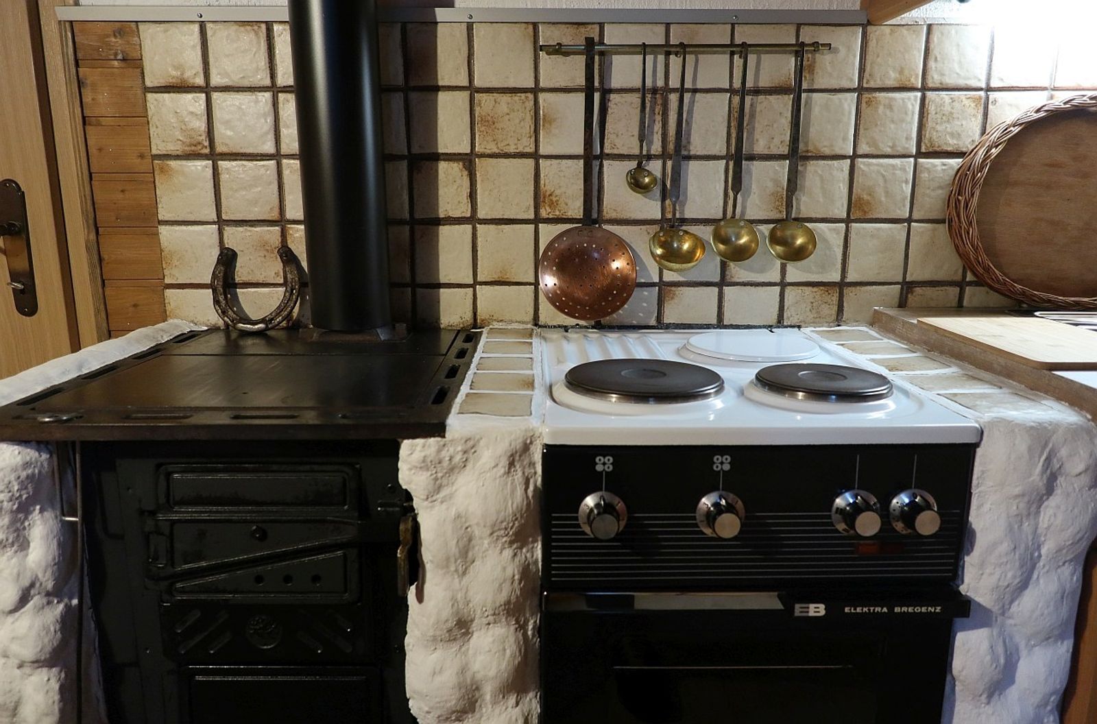 - Küche: Aufschnittmaschine, Elektroherd mit Backofen, Kaffeemaschine, Kühlschrank, Mikrowelle, Spülmaschine und Holzherd