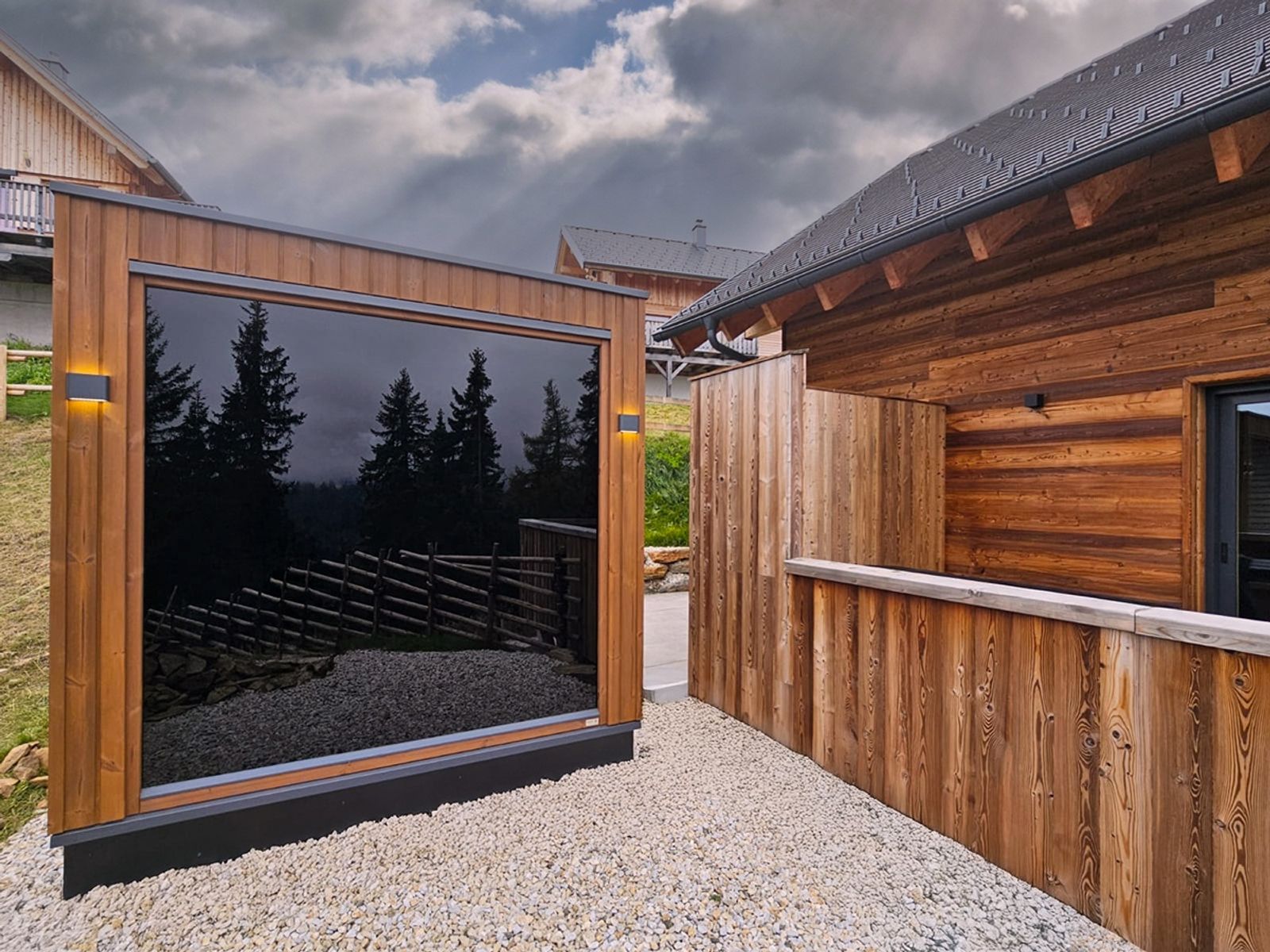 jedes Chalet verfügt über eine Panorama Sauna mit Farblichttherapie