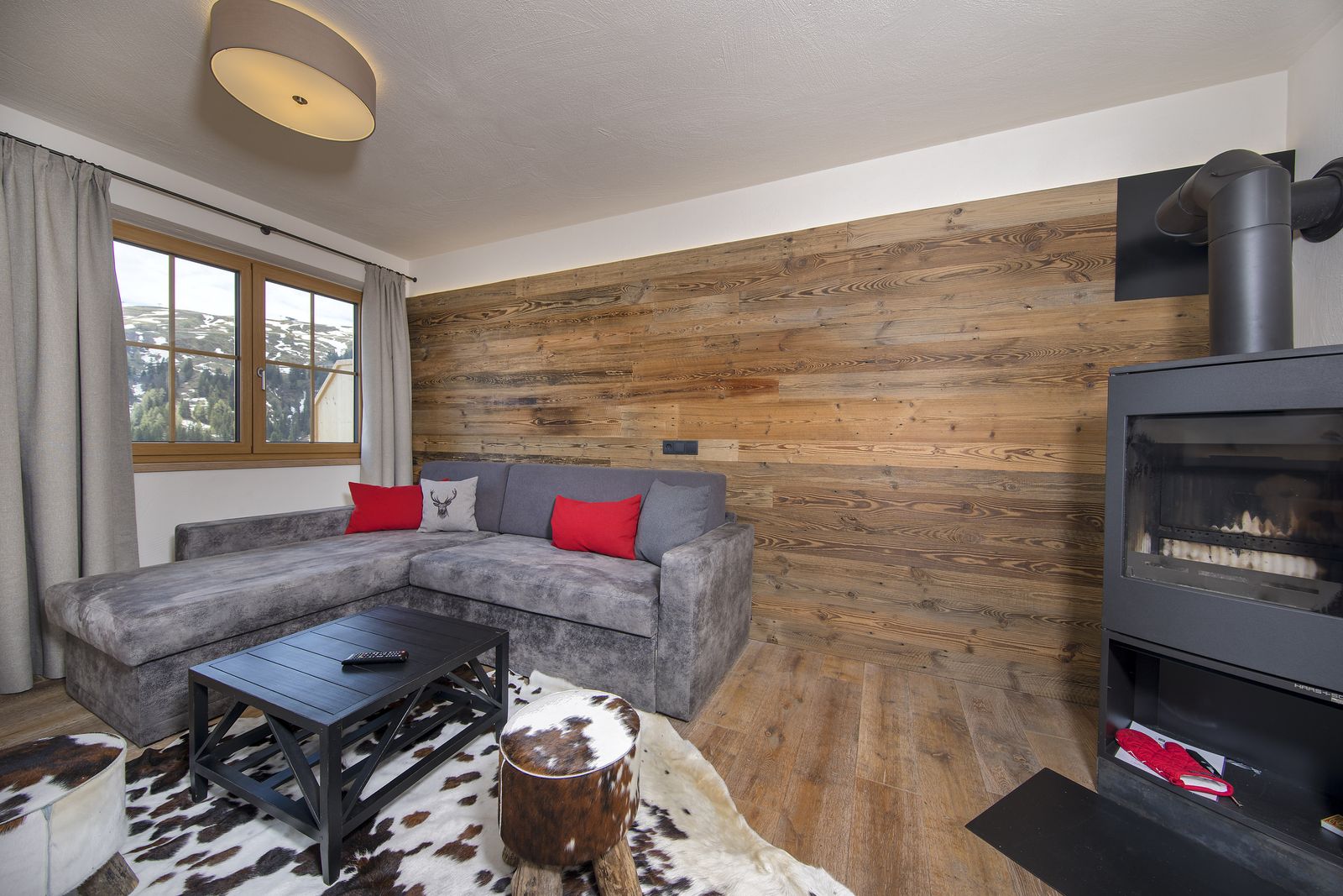 - Wohnbereich mit gemütlicher Sitzecke und Kamin mit Sichtfenster