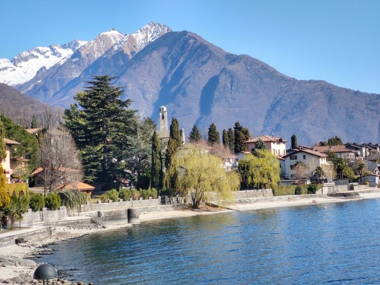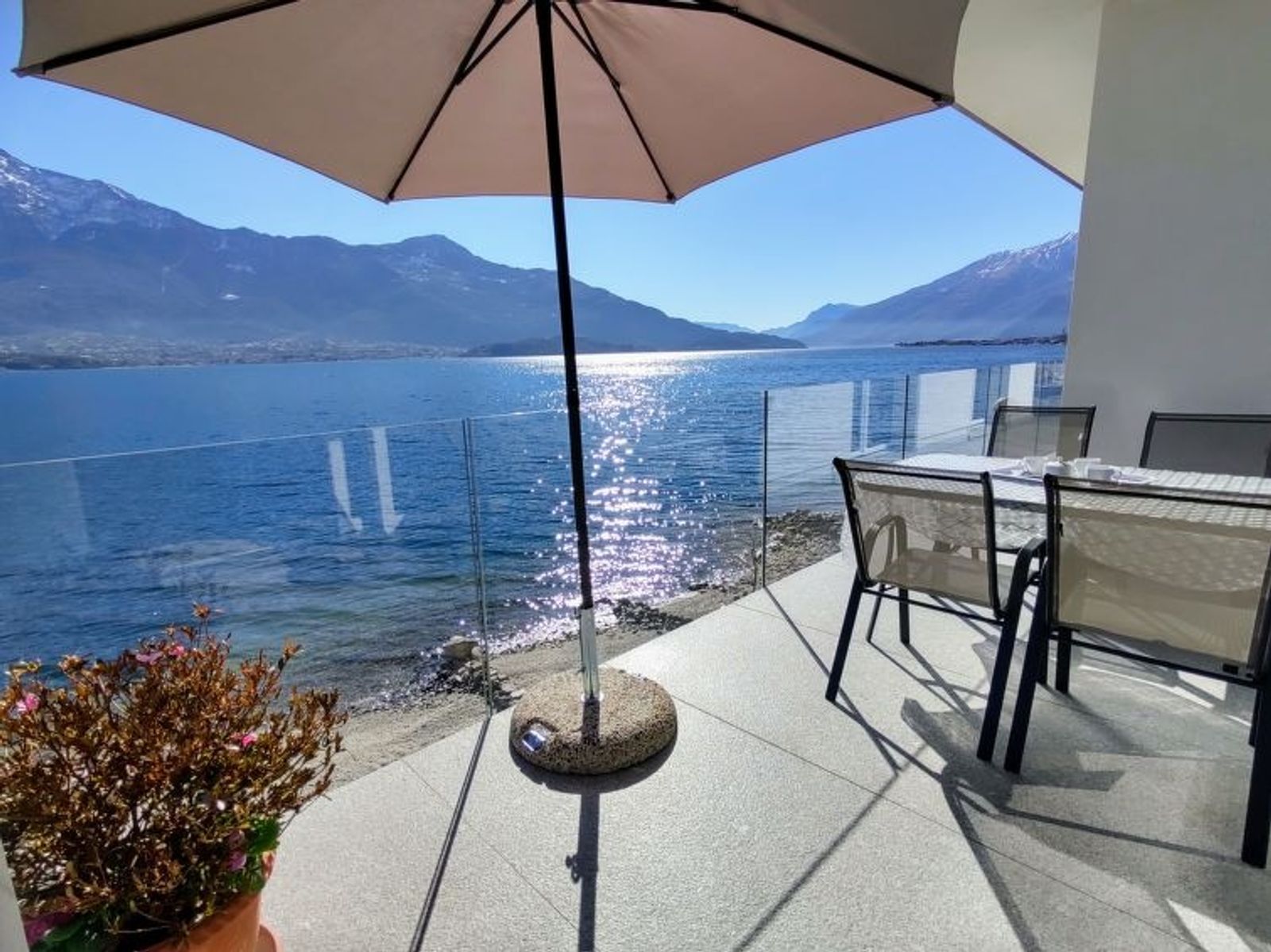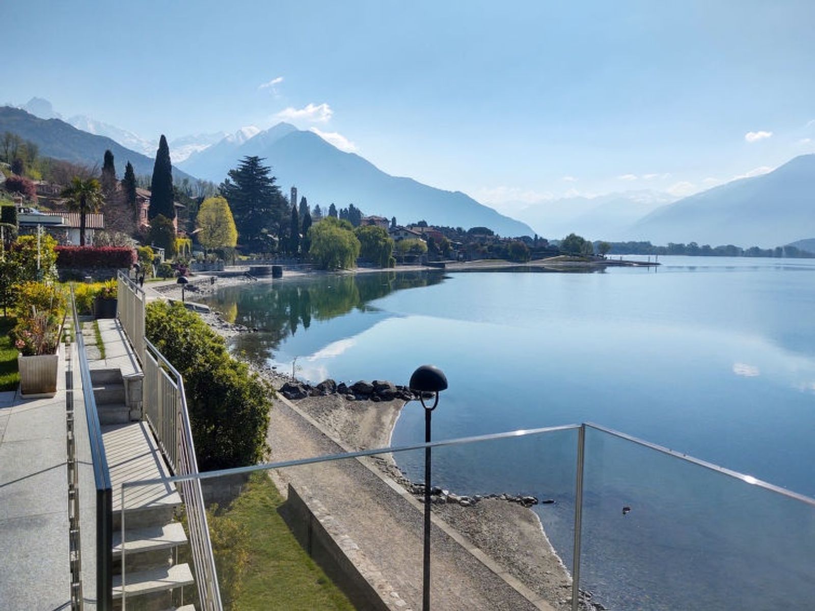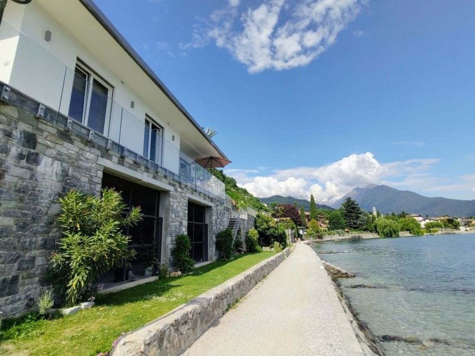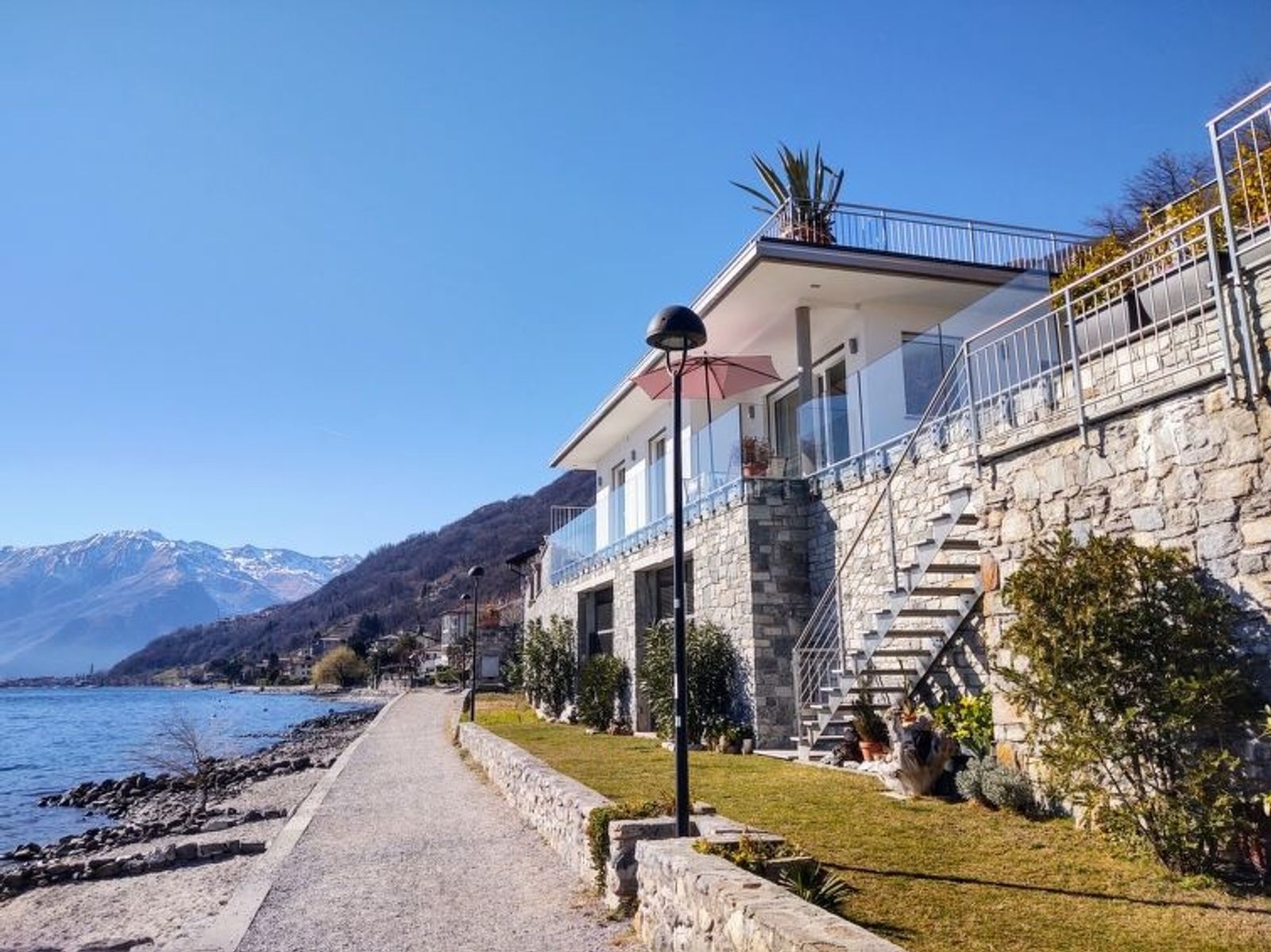 Modernes, komfortables Einfamilienhaus "Gelsomino", Baujahr 2018. Im Ortsteil Cinque Case, 1 km vom Zentrum von Gera Lario, am Ortsrand, 50 km vom Zentrum von Lugano, 58 km vom Zentrum von Como, 5 m vom See, direkter Zugang zum Strand, an einer Hauptstrasse. Zur Alleinbenutzung: Grundstück 210 m2 (eingezäunt) mit Rasen. Im Hause: Einstellraum für Fahrräder. Treppenweg (18 Stufen) bis zum Haus. Parkplatz beim Haus, Gemeinschaftsgarage (extra) in 20 m. Einkaufsgeschäft 1 km, Supermarkt 2.9 km, Bushaltestelle 400 m, Kieselstrand 5 m, Grasstrand "Acquaforte" 230 m. Jacht-Hafen 1 km, Golfplatz (18 Loch) 26 km, Radweg 5 m. Bitte beachten: Hauptstrasse 30 m vom Haus.