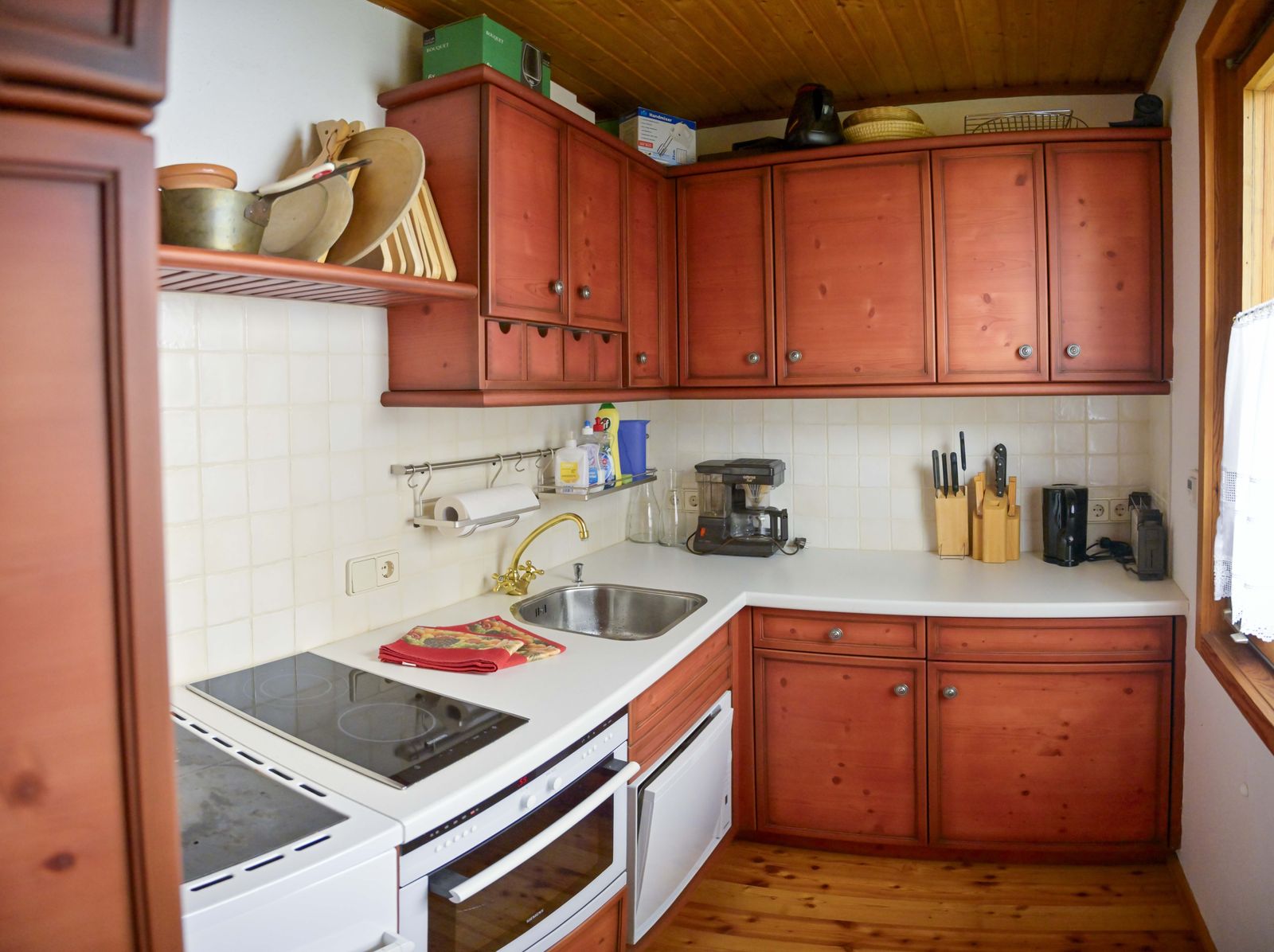 - Küche: E-Herd mit Backofen, Kühlschrank mit Gefrierfach, Geschirrspüler, Kaffeemaschine, Toaster und Wasserkocher