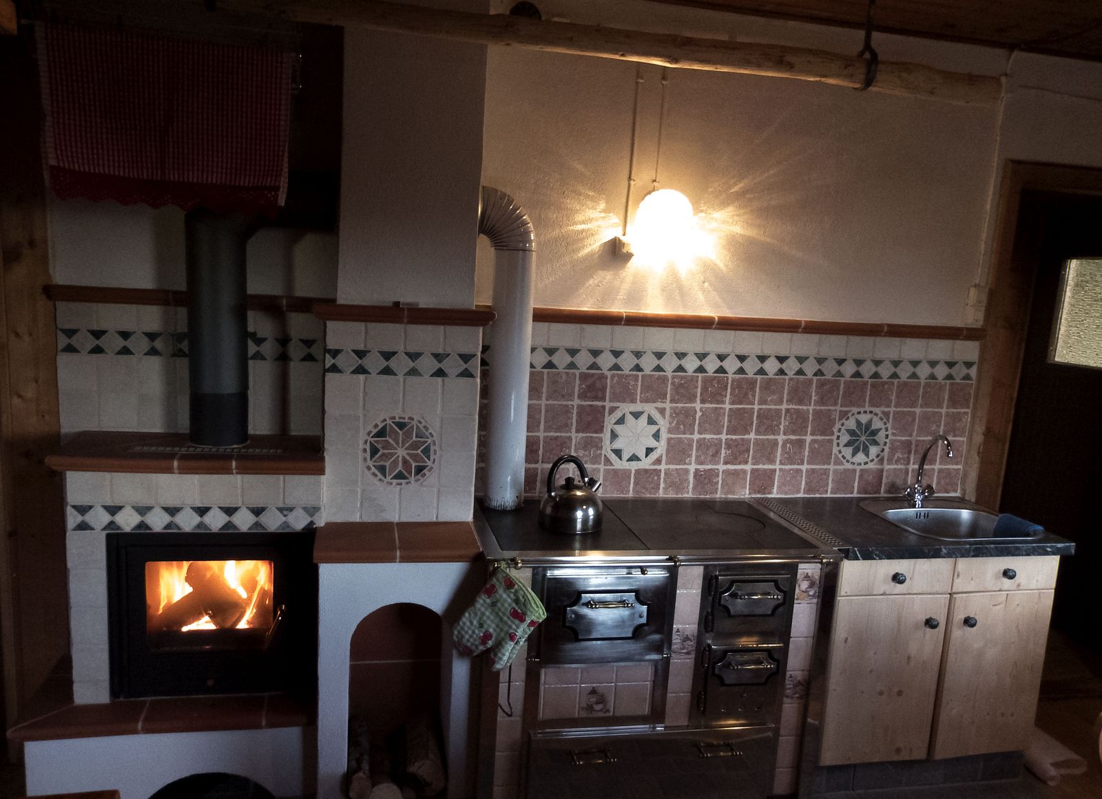 - Wohnküche mit Holzofenherd und Holzofen mit Sichtfenster