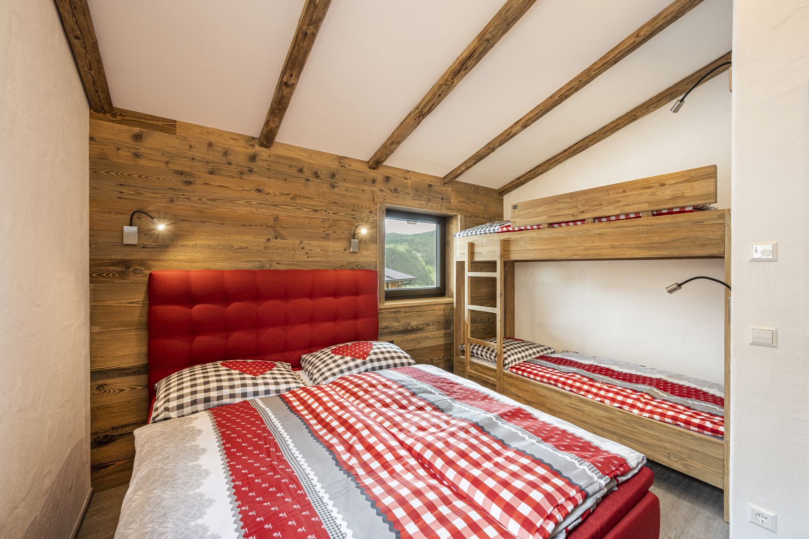 The bedrooms are on the upper floor. These are divided into three comfortable double rooms and a four-bed room with a bunk and a double beds. The double beds are very high-quality box spring beds, which guarantee a restful sleep. Two of the double bedrooms have access to the sunny balcony with a magnificent view. All bedrooms have a flat screen TV. On the upper floor there are also two bathrooms with a shower and washbasin as well as a separate toilet. Each chalet has a furnished terrace with a charcoal grill. The car is parked under a carport or in the chalet village parking lot. A washing machine and a tumble dryer are available at reception for an extra fee.