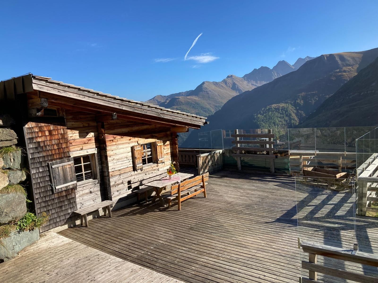 You return from a cabin holiday like this with unforgettable memories and positive feelings. Welcome to the Knapp-Kasa alpine cabin in the middle of the Hohe Tauern National Park on the Grossglockner High Alpine Road. It impresses with its high alpine and unique location that cannot be found anywhere else. If you are looking for something original, peaceful in nature, the Knapp-Kasa cabin is the perfect place for you. The heart of the cabin is a terrace protected by glass, where you can simply enjoy the views and relax for a moment. Pause, breathe in deeply, breathe out and smile. The next cabin with a restaurant is a few minutes' walk away. The Knapp-Kasa can be reached by car.