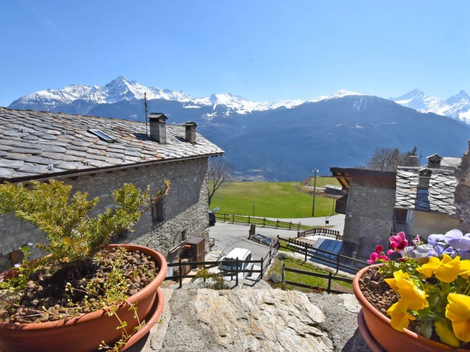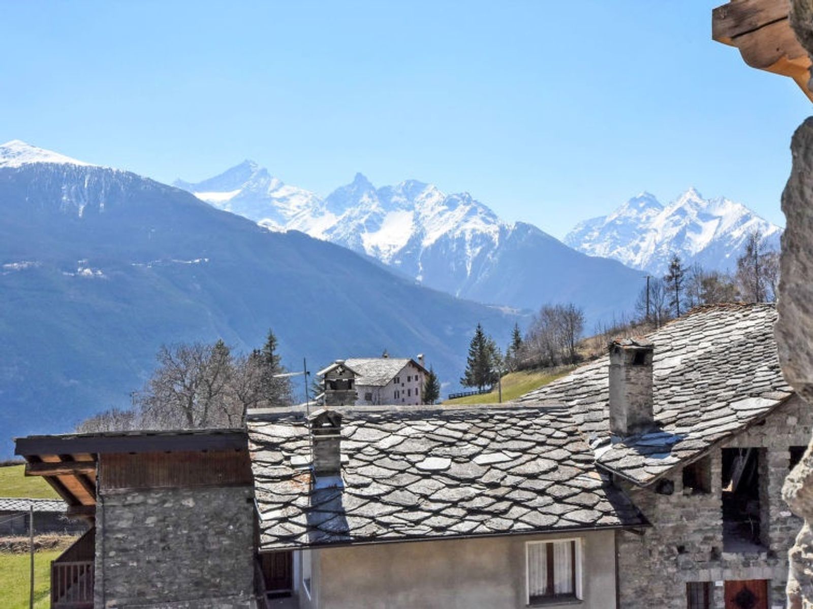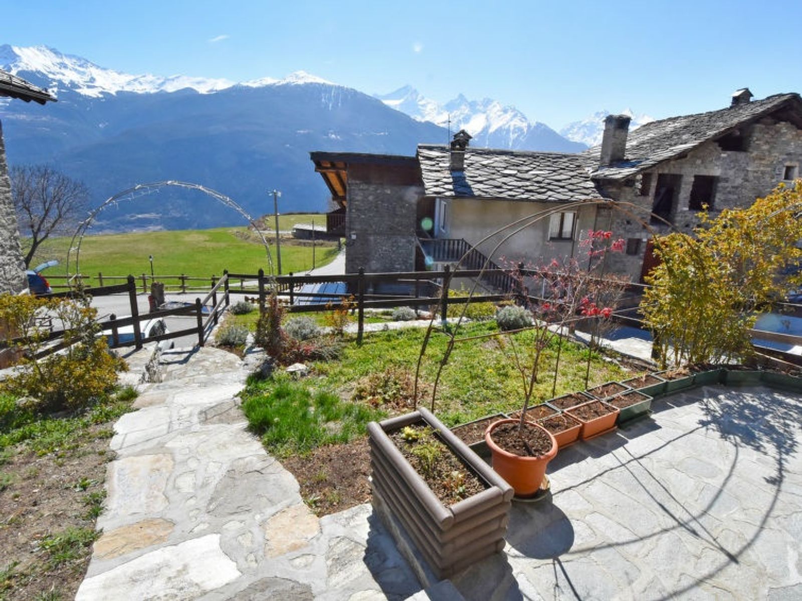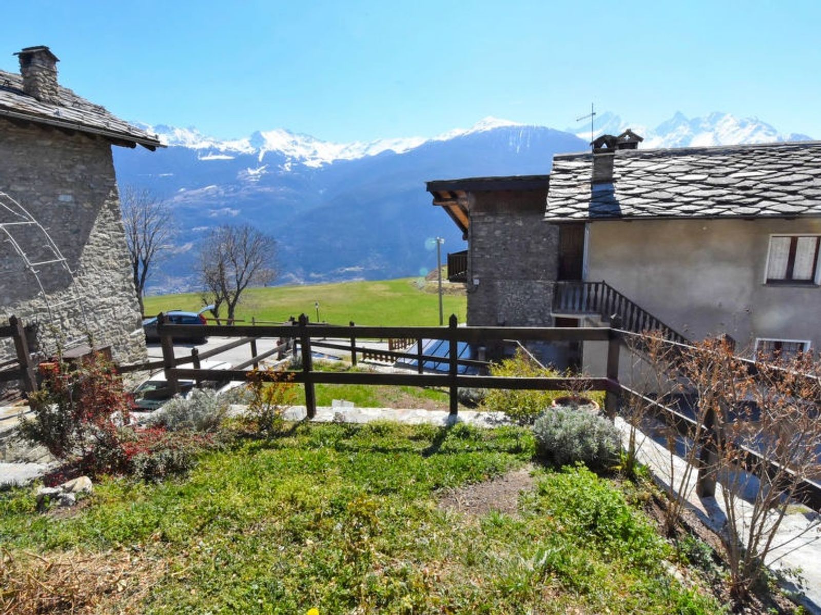 Rustic, historical 2-family house "Maison Chez Nous", 1'200 m a.s.l., 2 storeys. In the hamlet Caillod-Ville sur Sarre 8 km from the centre of Sarre, in a quiet, sunny position, south-east facing position. For shared use: garden 10 m2 (fenced). Garden furniture, public parking on the road. Supermarket 8 km, restaurant 8 km, bar 8 km, bus stop "Sarre" 8 km, thermal baths "Pre'-Saint-Didier" 36 km. Nearby attractions: Ovovia Aosta-Pila 13 km, Courmayeur Mont Blanc 36 km. Please note: car recommended.