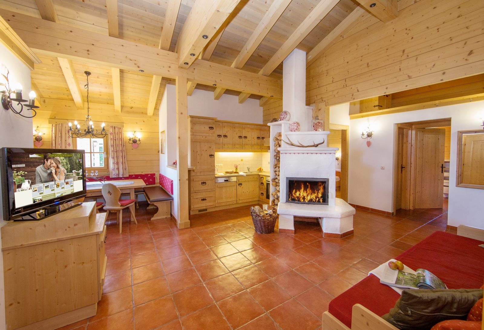 - Kitchen: oven, electric stove, fondue set, dishwasher, coffee machine, refrigerator with freezer, toaster and kettle