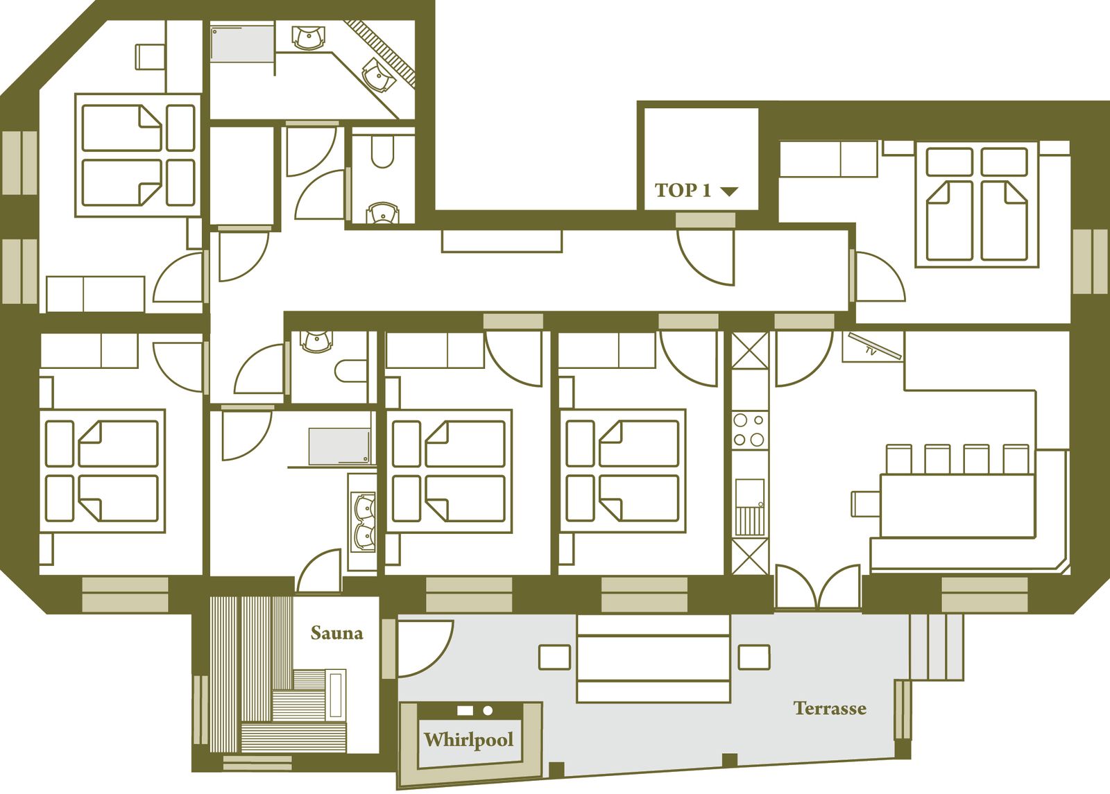 - 5 bedrooms with double beds