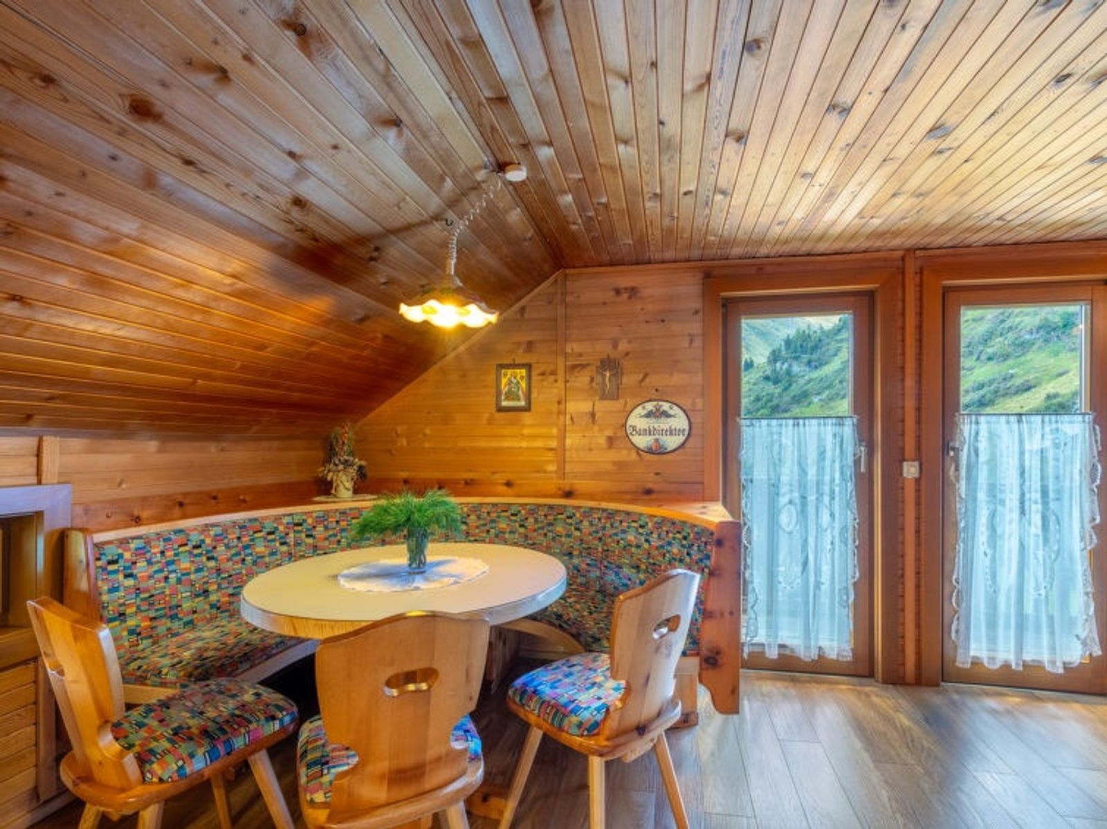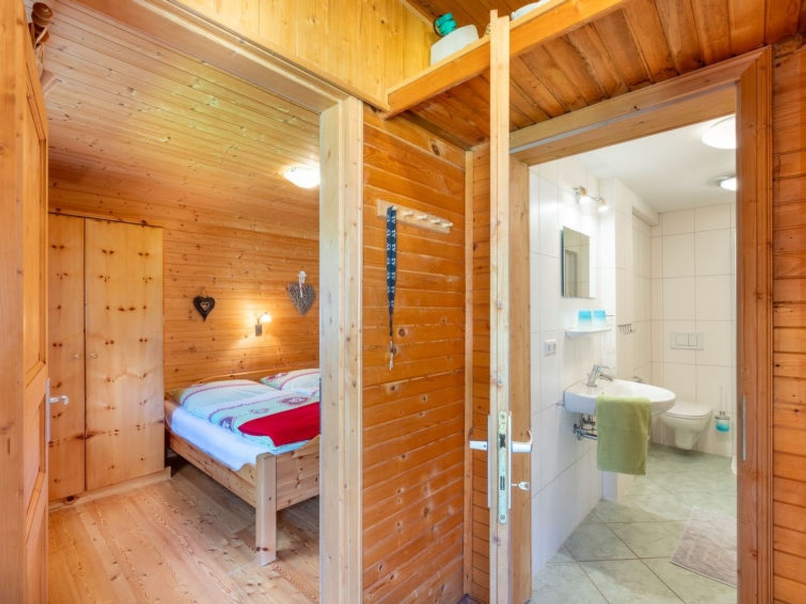 6-room house 130 m2 on 2 levels. Comfortable and cosy furnishings: 1 double bedroom. 1 room with 2 x 2 bunk beds. Living/dining room with 1 double sofabed, 1 double fold-away bed, dining nook, satellite TV and radio. Open kitchen (6 hot plates, oven, dishwasher, microwave). Shower/WC. Upper floor: with sloping ceilings, 1 double bedroom. With sloping ceilings, 1 room with 2 beds. Living/dining room with sloping ceilings with 1 double sofabed, dining nook, satellite TV and radio. With sloping ceilings, open kitchen (4 hot plates, oven, dishwasher, microwave). Bath/WC. Balcony, terrace. Terrace furniture, deck chairs (4). Marvellous view of the lake, the mountains and the countryside. Facilities: children's high chair. Internet (WiFi, free). Please note: maximum 1 pet/ dog allowed. Smoke alarm. Beautiful furnishings made of pine wood. Please note: The upper floor of the house can only be reached via an external staircase.