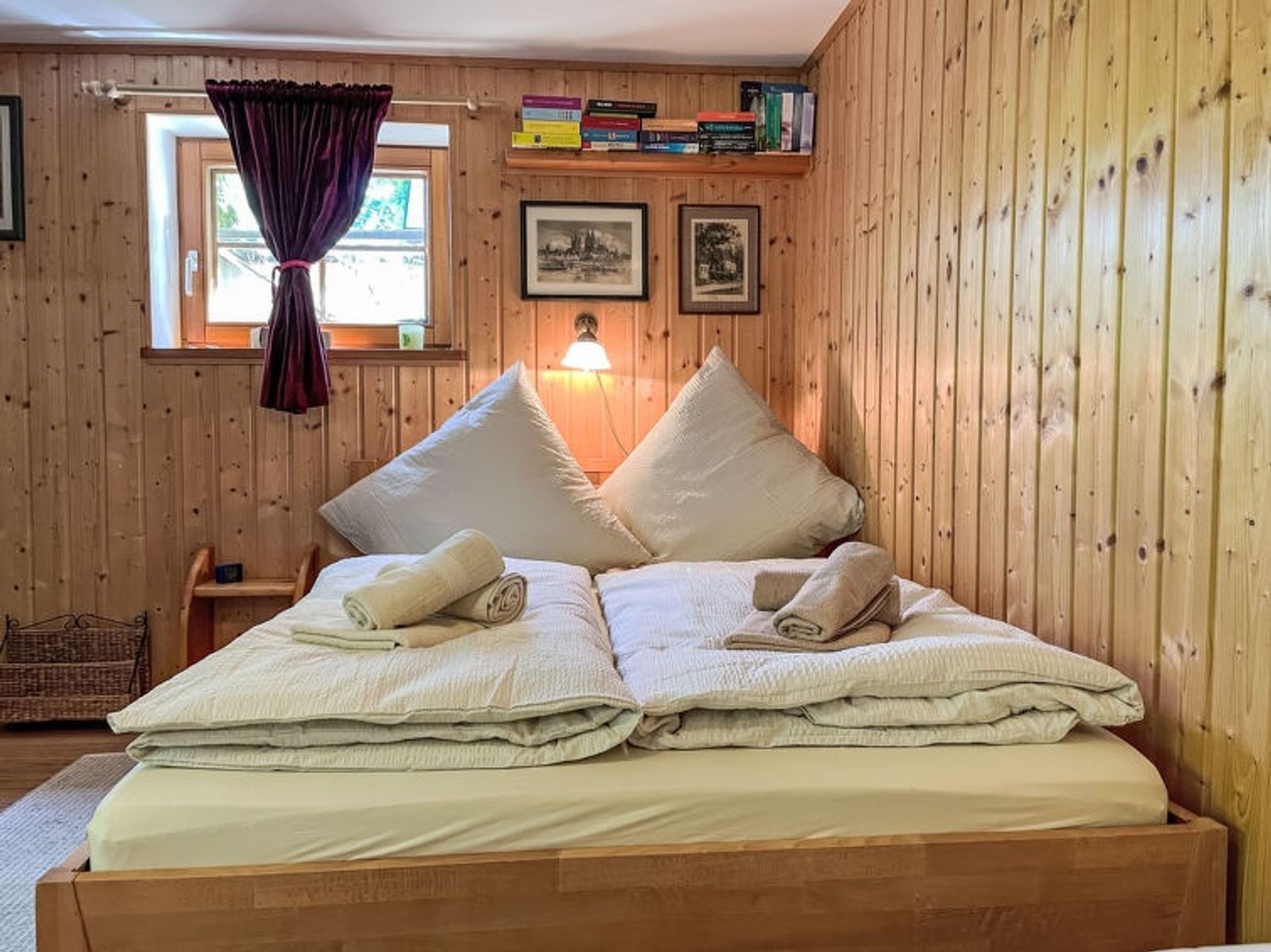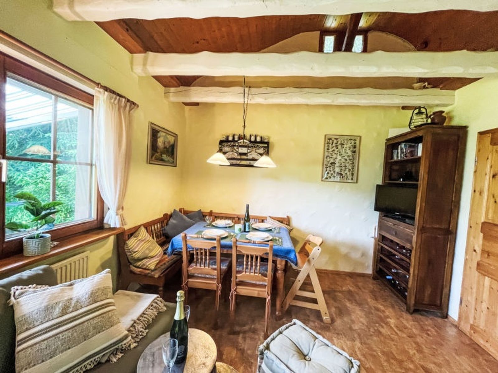 4-room house on 2 levels. Cosy and wooden furniture furnishings: living/dining room with Scandinavian wood stove, dining nook and satellite TV (flat screen). Exit to the terrace. 1 room with 1 double bed (2 x 90 cm, length 200 cm). 1 room with 1 x 2 bunk beds (90 cm, length 200 cm). Small kitchen (oven, dishwasher, 4 ceramic glass hob hotplates, kettle, electric coffee machine). Shower/WC. Heating. On the lower ground floor: (exterior staircase), 1 room with 1 french bed (140 cm, length 200 cm), shower/WC and satellite TV (flat screen). Exit to the garden. Sauna. Heating. 2 terraces. Terrace furniture, barbecue (portable). Beautiful view of the countryside and the forest. Facilities: sauna, children's high chair, hair dryer. Internet (WiFi, free). Garage at 50 m. Please note: non-smoking house. Smoke alarm. No internal connecting door between the floors. Please note: A steep staircase leads from the living room to a play gallery.