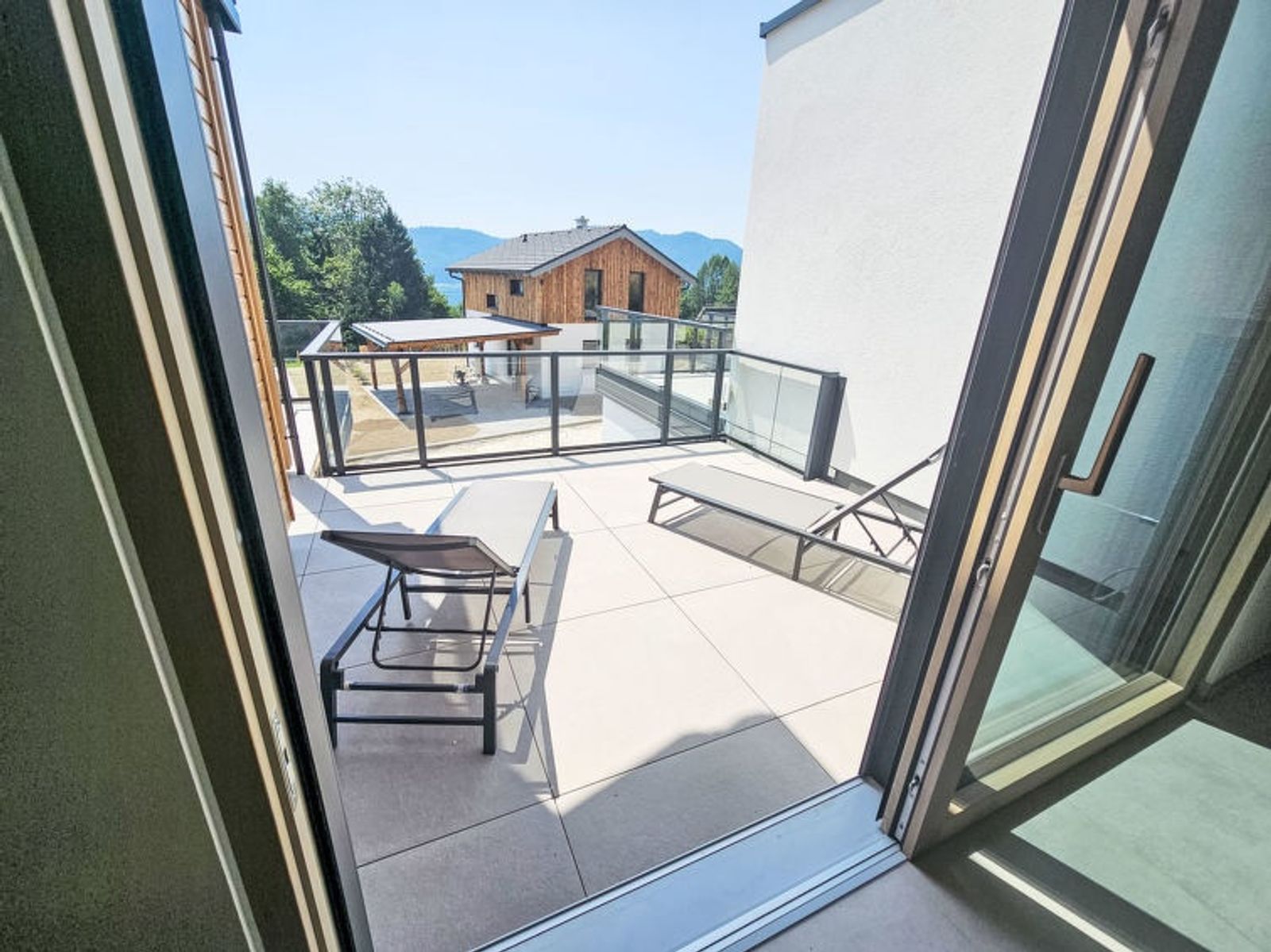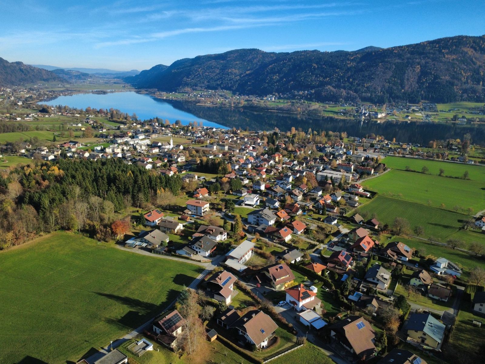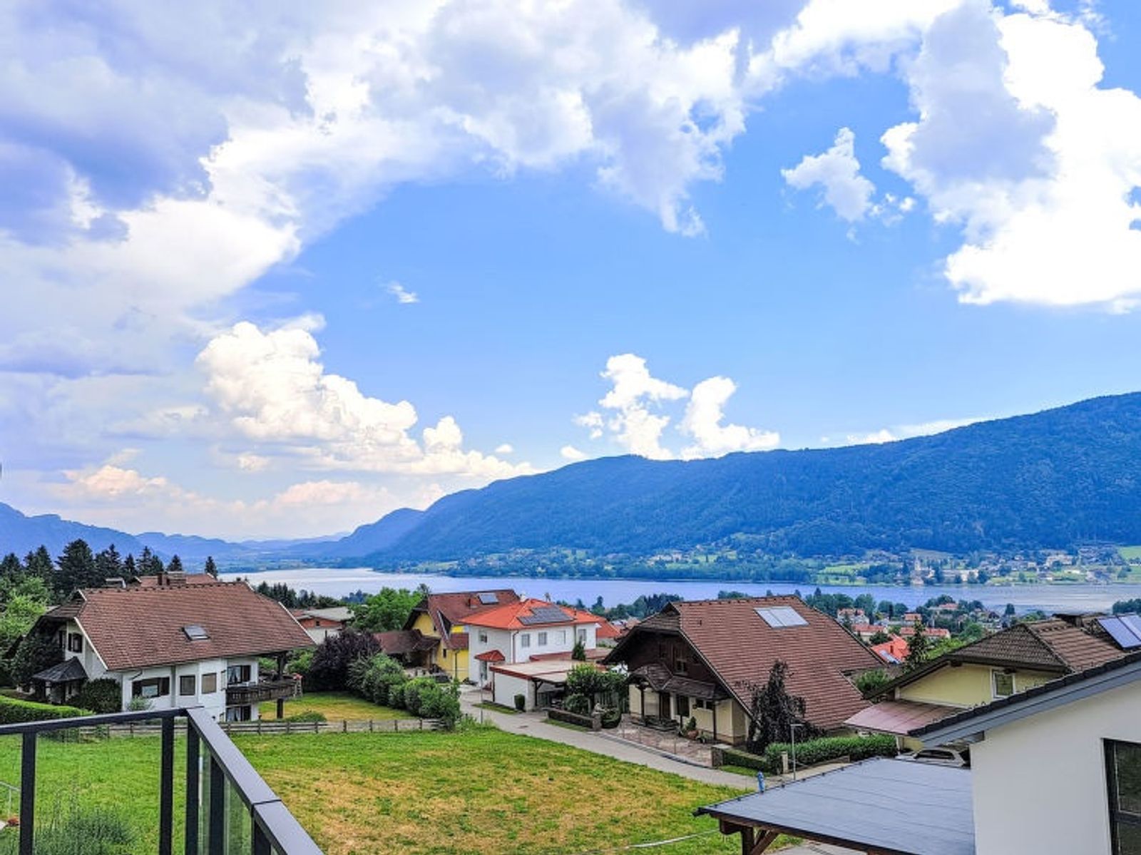 "Ossiacher See Chalet 1", 4-room chalet 128 m2 on 2 levels. Comfortable and modern furnishings: living room with open-hearth fireplace, Scandinavian wood stove, dining table and TV (flat screen). 3 double bedrooms. Open kitchen (oven, dishwasher, 4 ceramic glass hob hotplates, toaster, kettle, microwave, electric coffee machine). Shower, shower/WC, sep. WC, Sauna. Heating, forced-air heating. Balcony, large terrace. Terrace furniture, balcony furniture, deck chairs (2). Very beautiful panoramic view of the lake and the mountains. Facilities: washing machine, hair dryer. Internet (WiFi, free). Please note: non-smokers only. Maximum 2 pets/ dogs allowed. Smoke alarm. Warm air heating with cooling function in summer.