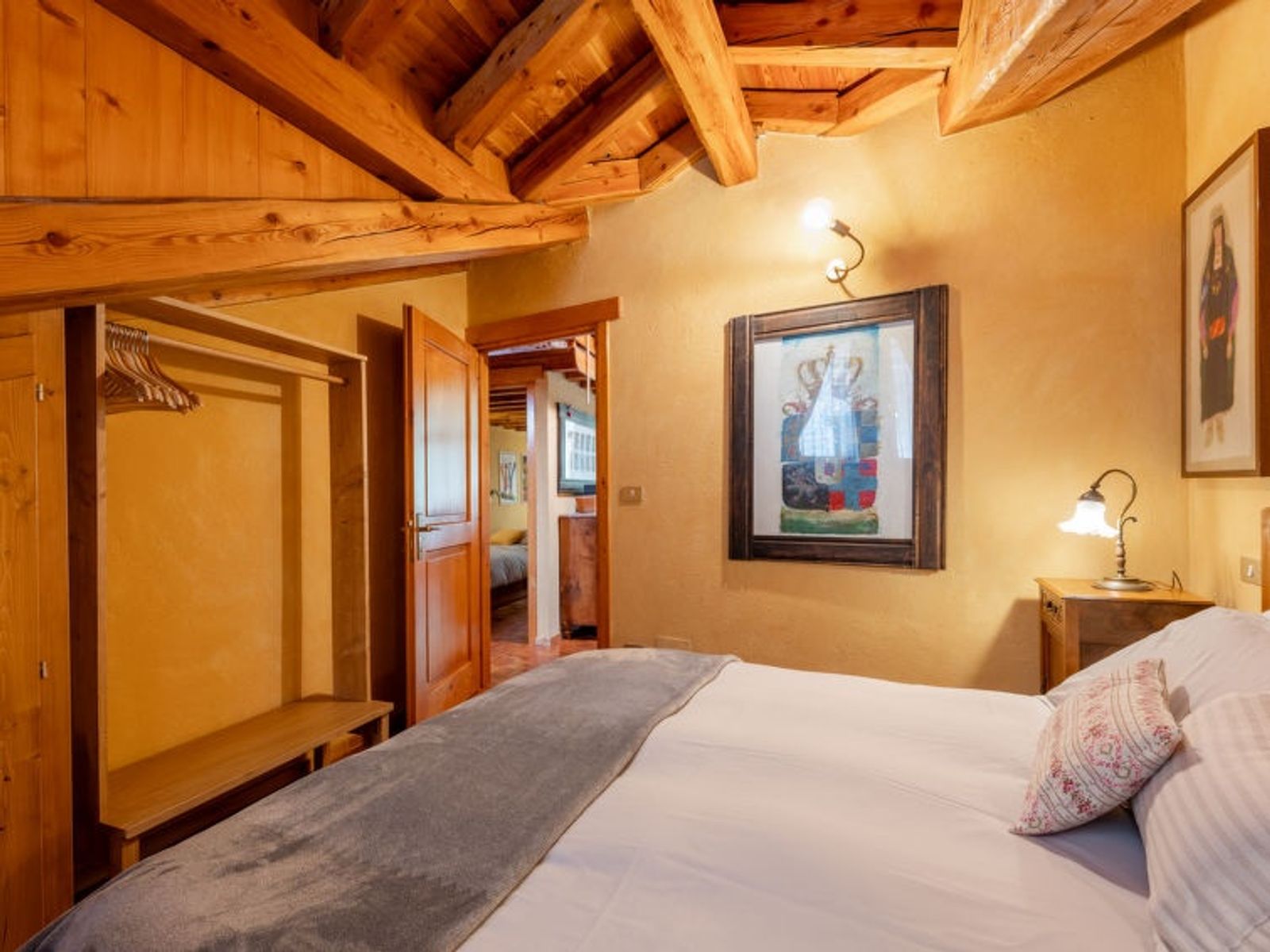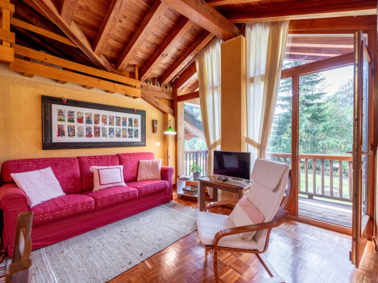 3-room apartment 80 m2 on 1st floor. Partly with sloping ceilings, beautiful and rustic furnishings: living/dining room with Scandinavian wood stove (only for decoration), dining table and TV (flat screen), radio, CD-player and hi-fi system. Exit to the balcony. 1 double bedroom with sloping ceilings, ceiling height 150 - 250 cm. 1 room with 2 beds. Kitchenette (oven, dishwasher, 4 induction hot plates, microwave). Shower/bidet/WC. Electric heating, boiler. On the lower ground floor: playroom. Balcony 5 m2. Terrace furniture. Beautiful view of the mountains. Facilities: washing machine, iron, hair dryer. Internet (WiFi, free). IT007005C2LDNCS8P7