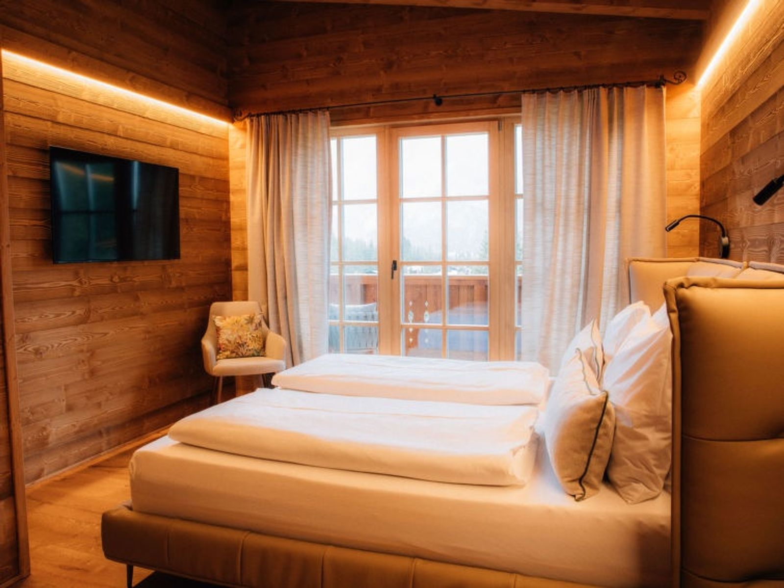 "Sissis Green Chalet Elisabeth", 4-room chalet 150 m2 on 2 levels. Luxurious and wooden furniture furnishings: entrance hall. 1 double bedroom with shower/WC, TV and digital TV (flat screen). Large kitchen-/living room (dishwasher, 4 induction hot plates, toaster, kettle, microwave, electric coffee machine, cooking island) with dining table, open-hearth fireplace, TV and digital TV (flat screen), electric shutters. Exit to the terrace. Upper floor: 2 double bedrooms, each room with bath/shower/WC, TV and digital TV (flat screen). Exit to the balcony. Wooden floors. Large terrace 25 m2. Terrace furniture, barbecue, deck chairs. Beautiful view of the mountains. Facilities: washing machine, sauna, hair dryer. Internet (WiFi). Parking. E-charging station. Please note: non-smoking house. Maximum 2 pets/ dogs allowed. Private entrance.