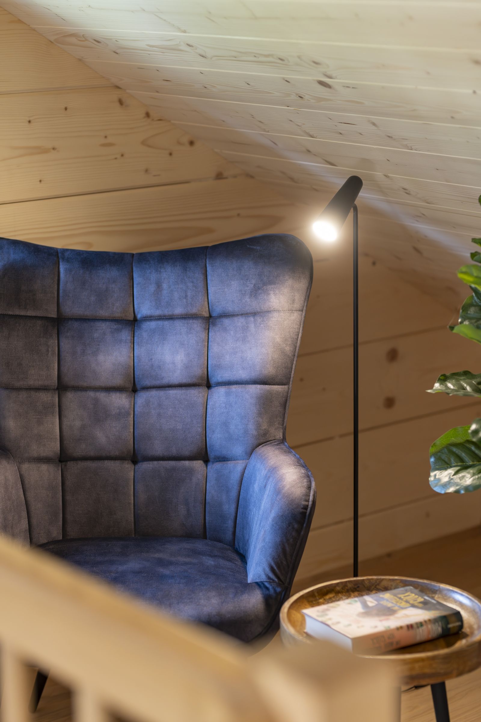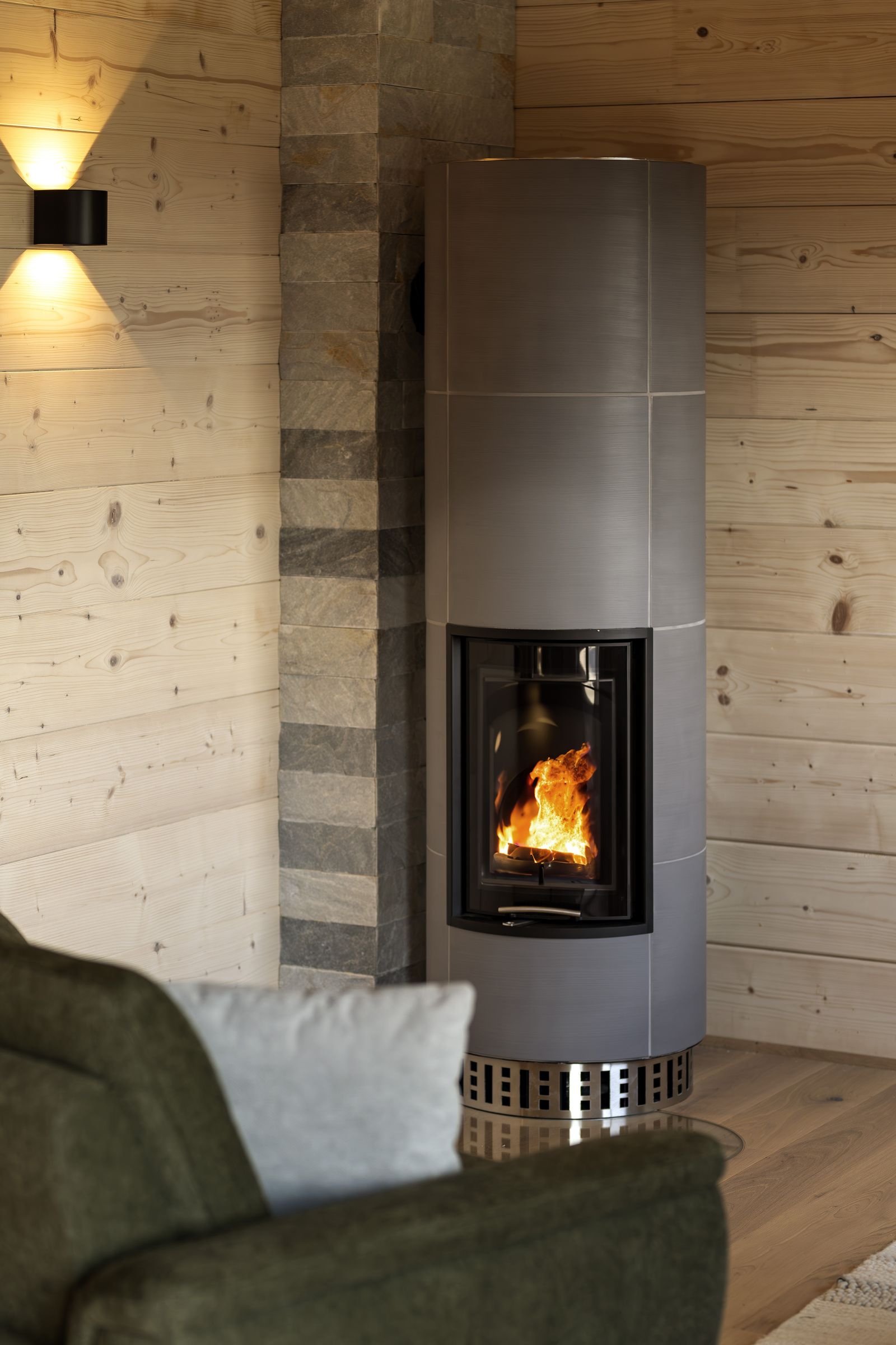 - Comfortable couch with a modern wood-burning stove