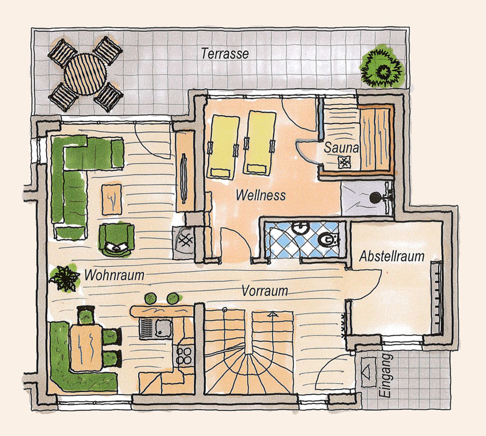 - Fully equipped kitchen-living room with 4-plate ceramic hob including oven, dishwasher, microwave, refrigerator, fully automatic coffee machine, kettle, toaster and egg cooker