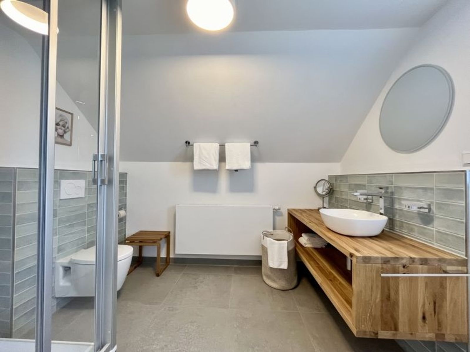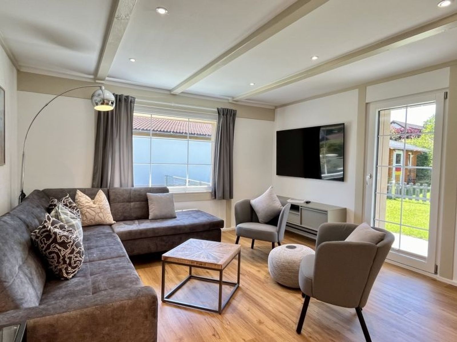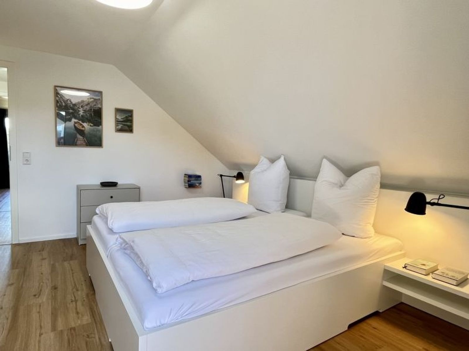 6-room house 160 m2 on 2 levels. Spacious and bright, fully renovated in 2024, very beautiful and tasteful furnishings: large entrance hall. Open living/dining room with dining table and tiled stove. Exit to the garden, to the terrace, south facing position and east facing position. Lounge with satellite TV (flat screen). Exit to the garden, to the terrace, west facing position. 1 room with 1 double bed (160 cm, length 200 cm). Open kitchen (oven, dishwasher, 4 ceramic glass hob hotplates, toaster, kettle, microwave, electric coffee machine) with dining table. Shower/WC, sep. WC. Underfloor heating. Solar power. Upper floor: 1 room with 1 double bed (180 cm, length 200 cm). Exit to the balcony. 1 room with 1 double bed (180 cm, length 200 cm). Exit to the balcony. 1 room with 1 double bed (180 cm, length 200 cm), shower/WC (private). Exit to the balcony. Shower/WC, double hand-basin. Balcony, west facing position balcony, east facing position, large terrace 50 m2, small terrace 12 m2, large garden. Terrace furniture, deck chairs, sitting area, box-room. View of the garden. Facilities: washing machine, dryer, iron, children's high chair, baby cot (extra), hair dryer. Parking (3 cars) at the house. Please note: non-smoking house. Maximum 3 pets/ dogs allowed. Smoke alarm, fire extinguisher.