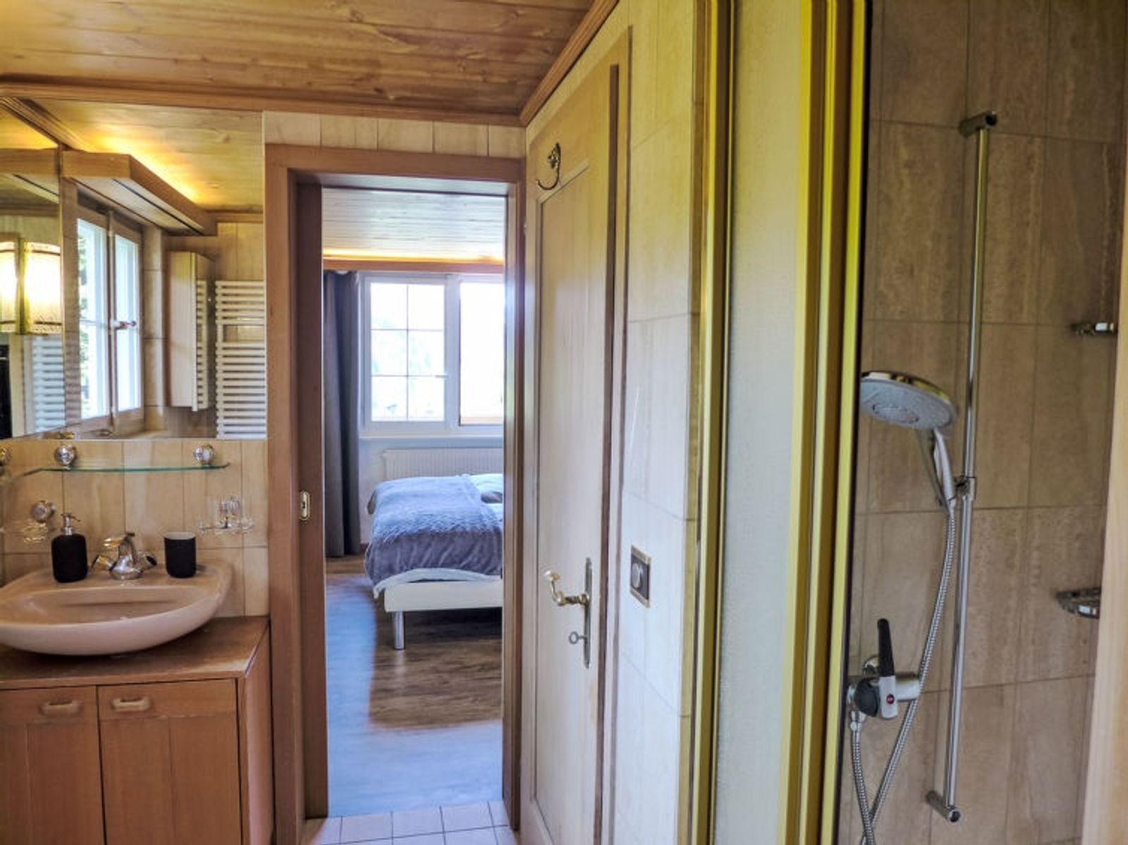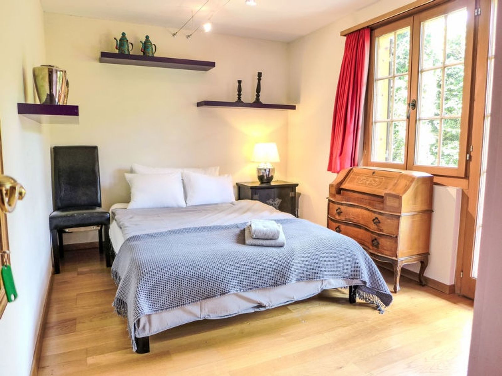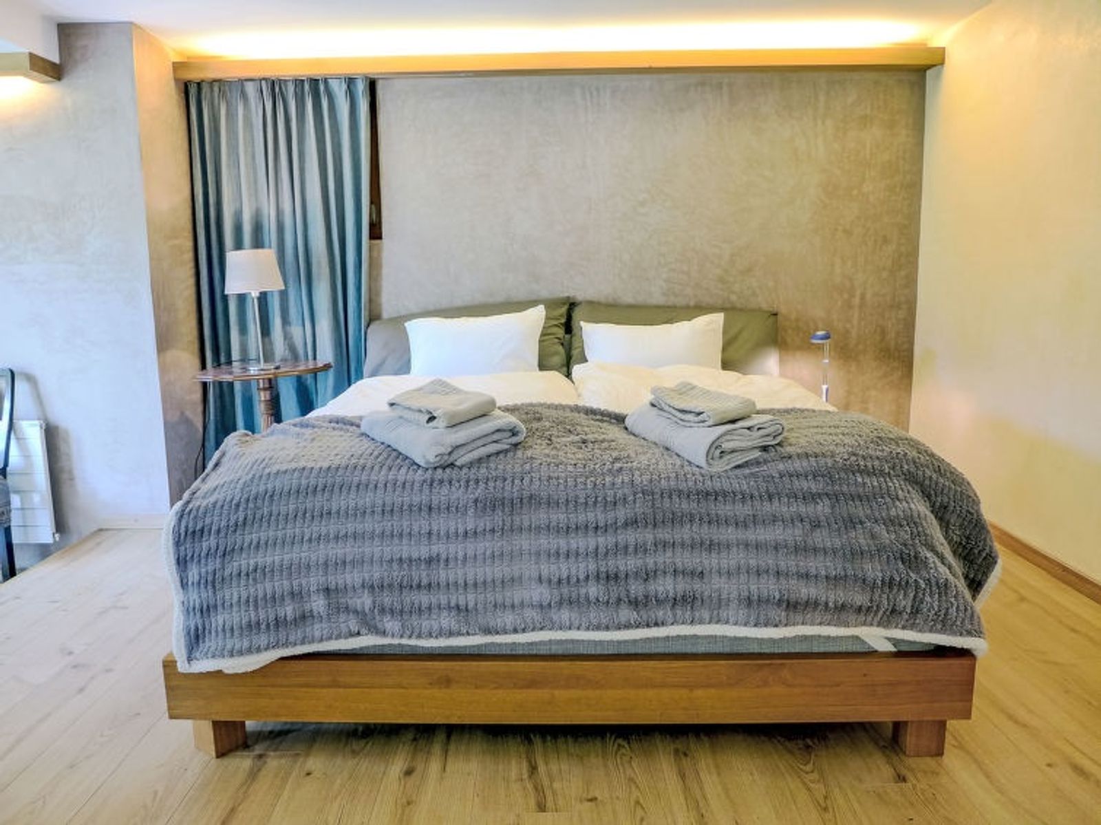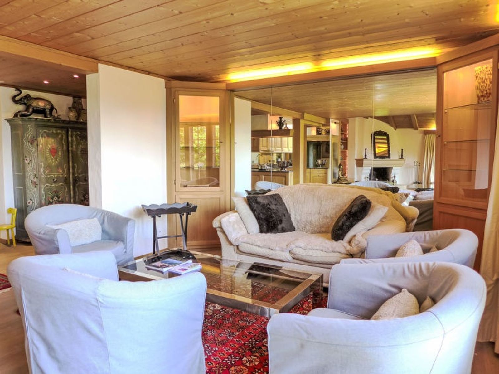 7-room chalet 280 m2 on 3 levels. Spacious and bright, very comfortable and tasteful furnishings: open large living room with open-hearth fireplace. Exit to the balcony. Open dining room with dining table. Exit to the terrace. 1 room with 1 double bed (160 cm, length 200 cm). 1 room with 1 french bed (140 cm, length 200 cm). Large, open kitchen (oven, dishwasher, 4 induction hot plates, toaster, kettle, microwave, freezer, electric coffee machine, steamer, raclette grill, cooking island, fondue Set (cheese)). Shower/WC. On the lower ground floor: 1 large room with Dressing room with 1 double bed (160 cm, length 200 cm), shower/WC and TV. Exit to the garden. 1 room with 1 double bed (160 cm, length 200 cm), bath/WC and TV. Exit to the garden. 1 small room, without window with 1 french bed (140 cm, length 200 cm), shower/WC and TV. Top floor: open gallery. 1 large room with Dressing room with 1 double bed (160 cm, length 200 cm), bath/shower/WC and TV. Exit to the balcony. Large terrace, patio. Terrace furniture. Marvellous panoramic view of the mountains, the ski run and the countryside. Facilities: washing machine, dryer, iron, hair dryer, logs (extra). Internet (WiFi, free). Please note: non-smoking house. Maximum 1 pet/ dog allowed. Smoke alarm, fire extinguisher. When there are less than the maximum number of guests staying at the property, not all of the housing units will be available for use.