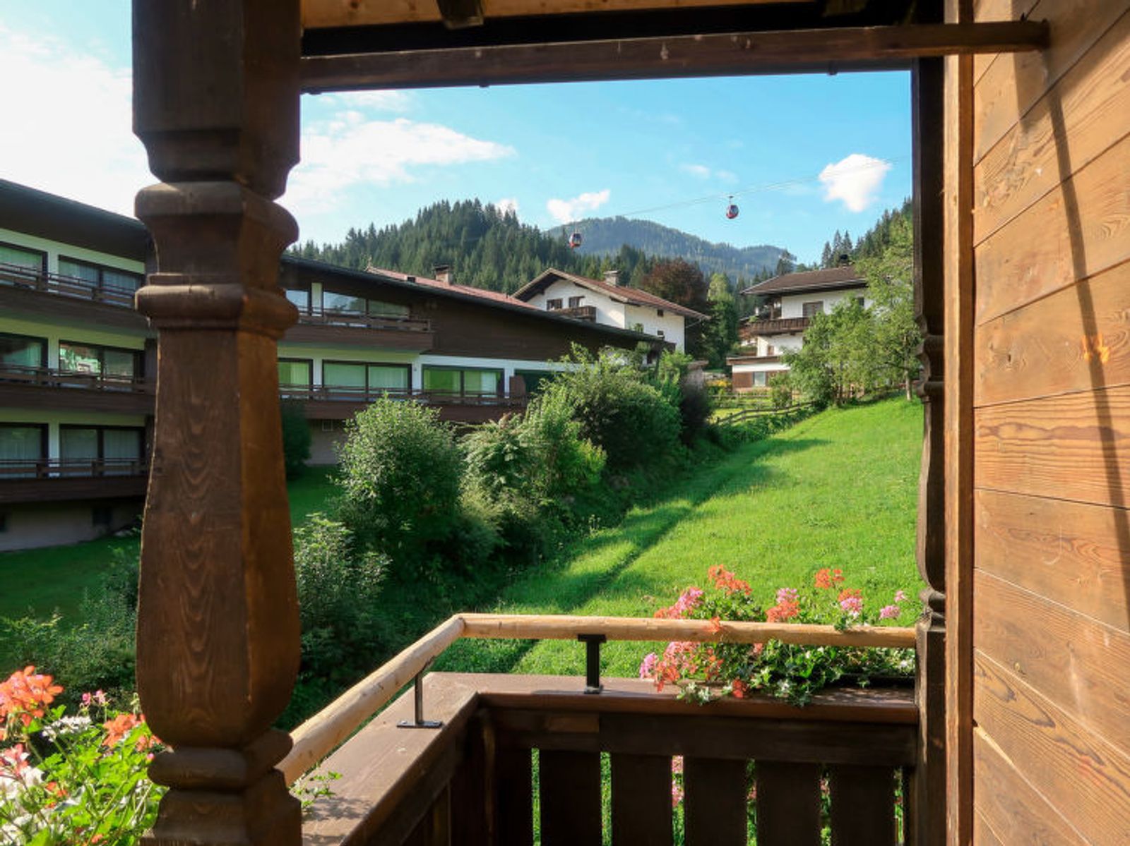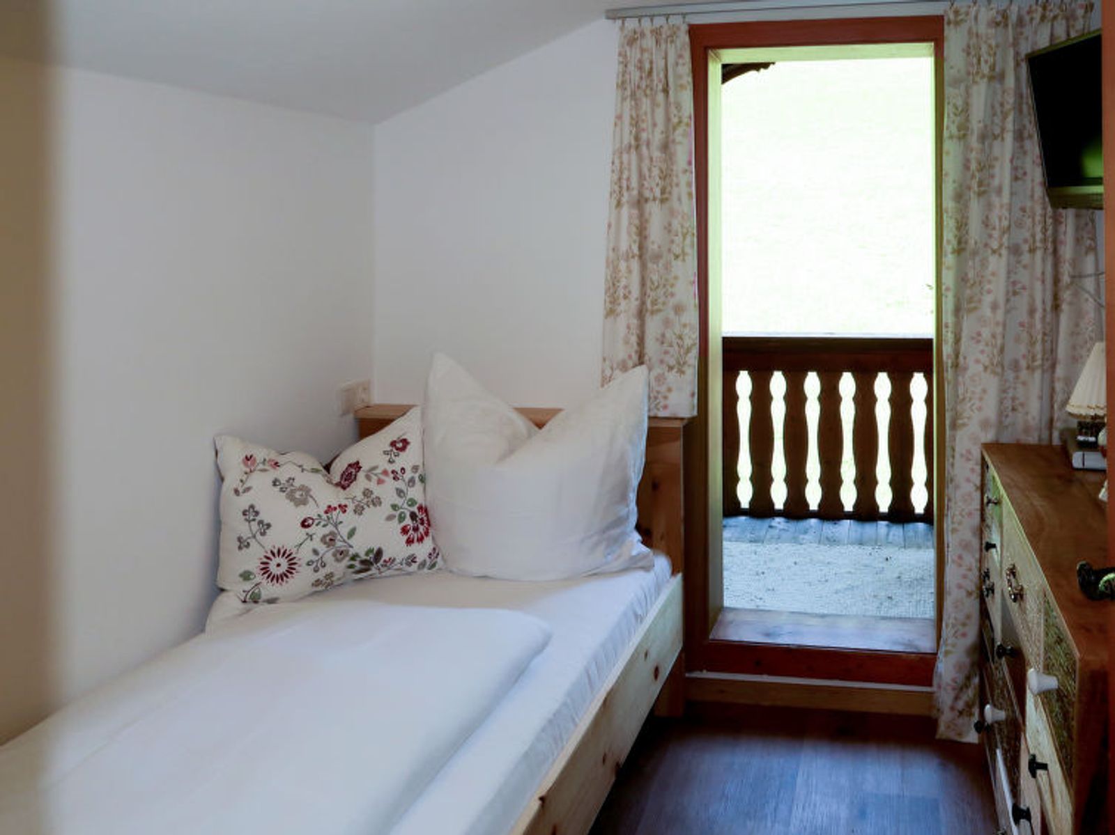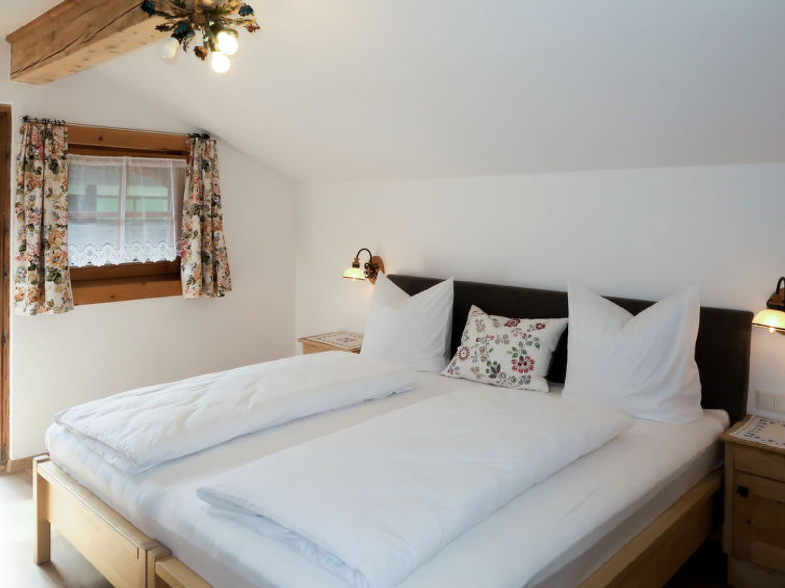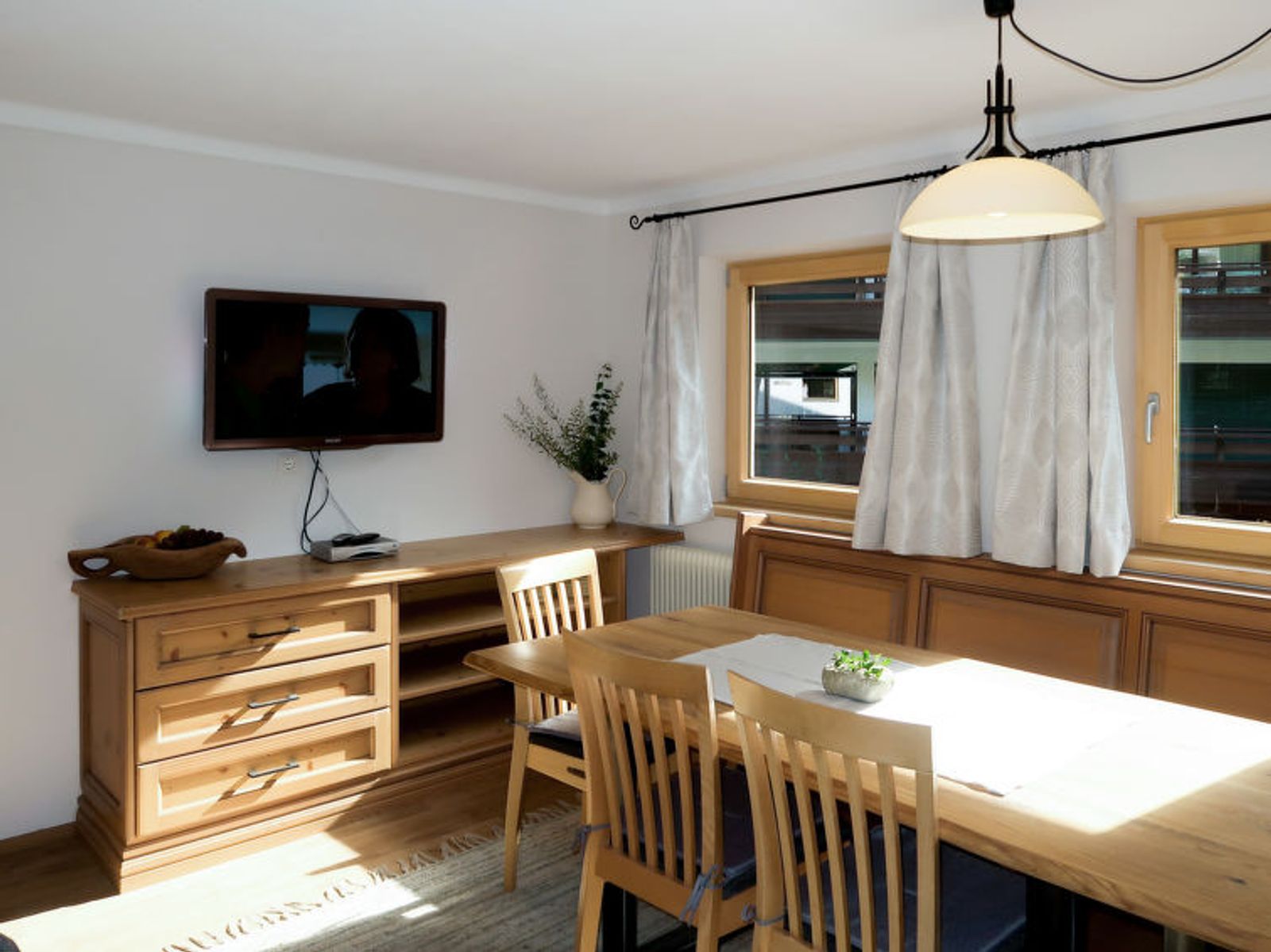 "Sonnheim", 6-room house 140 m2 on 3 levels. Spacious and bright, tasteful and cosy furnishings: living/dining room with dining nook and satellite TV (flat screen). 1 double bedroom with hand-basin and satellite TV (flat screen). Kitchen-/living room (oven, dishwasher, 4 ceramic glass hob hotplates, toaster, kettle, microwave, electric coffee machine) with dining nook. Exit to the terrace. Sep. WC. Upper floor: 1 double bedroom with satellite TV. Exit to the balcony. 1 double bedroom with satellite TV. 2 showers, sep. WC, double hand-basin. 2nd upper floor: 1 room with sloping ceilings with 1 bed, 1 double bed and satellite TV. Exit to the balcony. 1 small room with sloping ceilings with 1 bed. Exit to the balcony. Oil heating. 2 balconies, large terrace partly roofed. Terrace furniture, balcony furniture, electric barbecue, deck chairs (2), box-room. View of the mountains. Facilities: baby cot, hair dryer. Internet (WiFi, free). Please note: non-smoking house. Fire extinguisher. When there are less than the maximum number of guests staying at the property, not all of the housing units will be available for use.