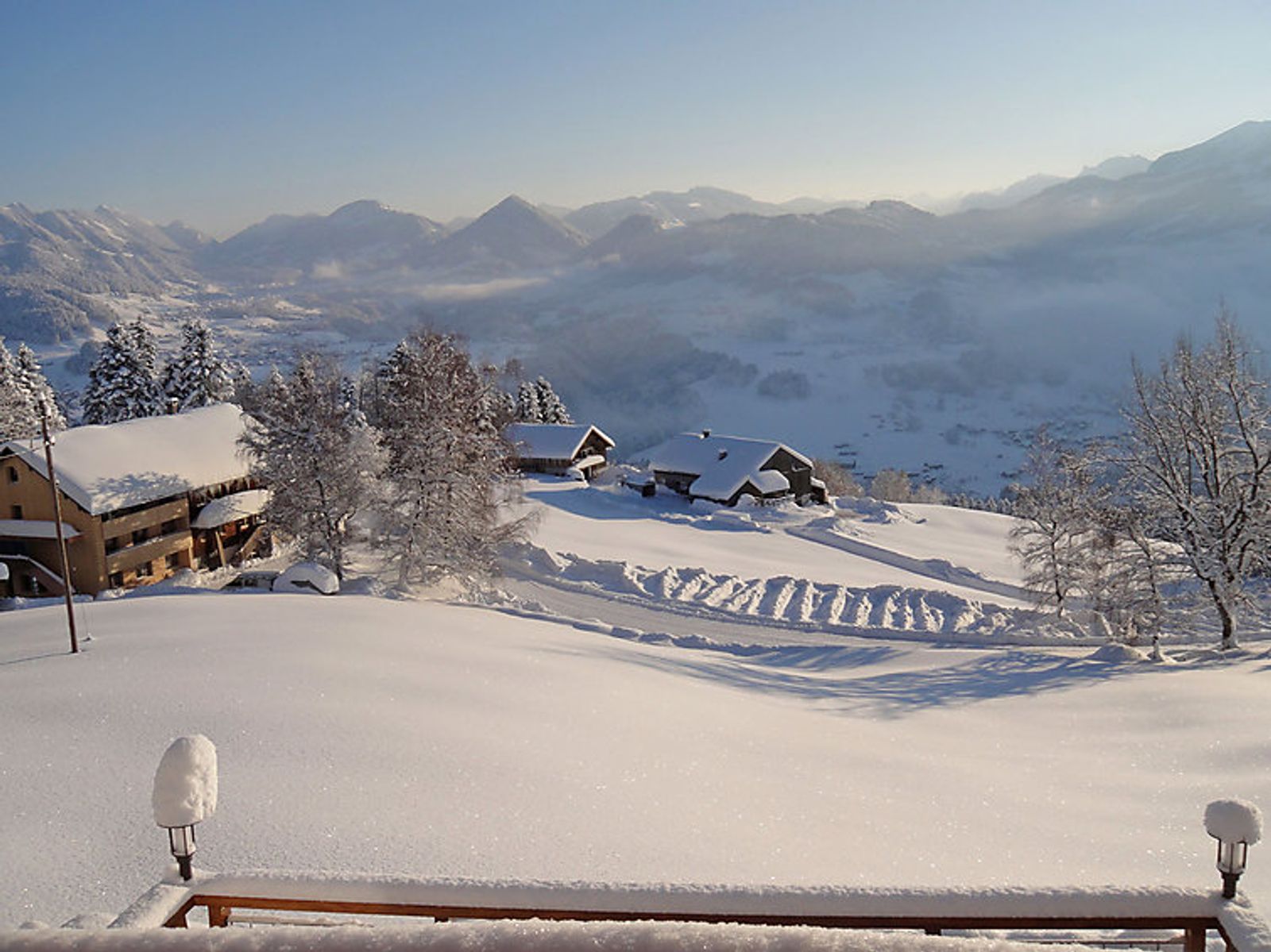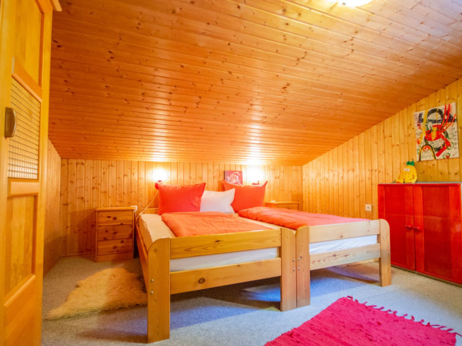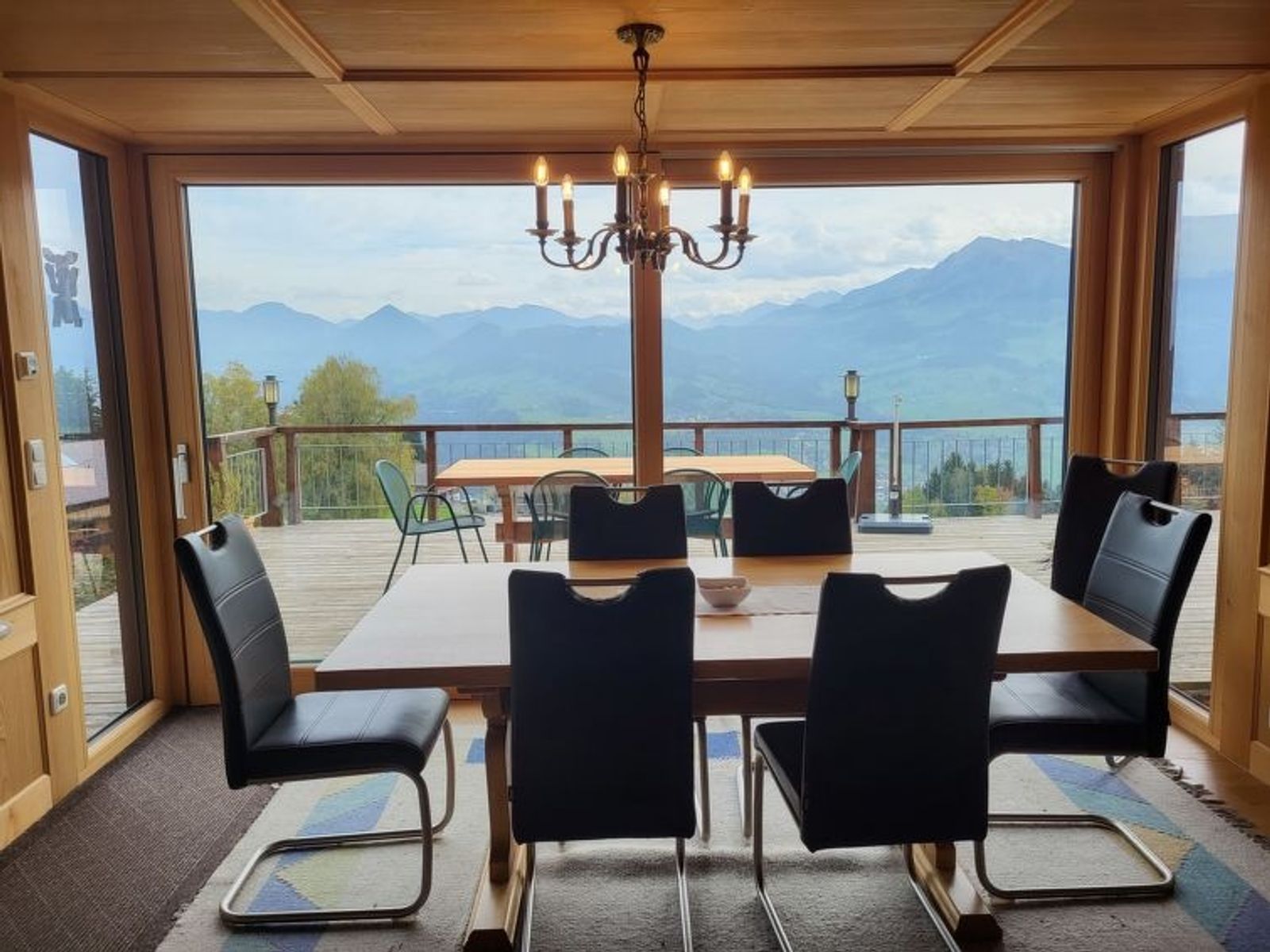 6-room chalet 190 m2. Stylish and cosy furnishings: entrance hall. Large living room with panoramic window with cable TV, hi-fi system, DVD and tiled stove. Exit to the garden, to the terrace. Open lounge with winter garden. Kitchen (oven, dishwasher, 4 ceramic glass hob hotplates, microwave, freezer) with dining table. Shower/WC, double hand-basin. Underfloor heating. Upper floor: 3 double bedrooms. 1 room with sloping ceilings with 2 beds. Gallery with satellite TV. Bath/WC. Large terrace 44 m2. Terrace furniture, barbecue, deck chairs. Marvellous panoramic view of the mountains and the countryside. Facilities: washing machine, baby cot, hair dryer. Internet (WiFi, free). Please note: non-smoking house. Smoke alarm.