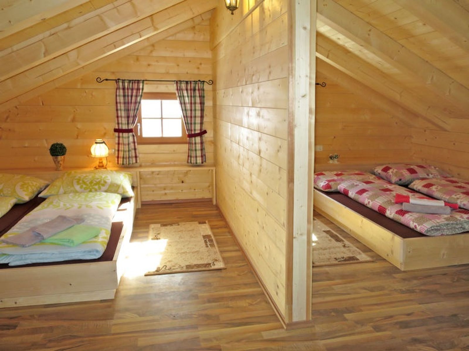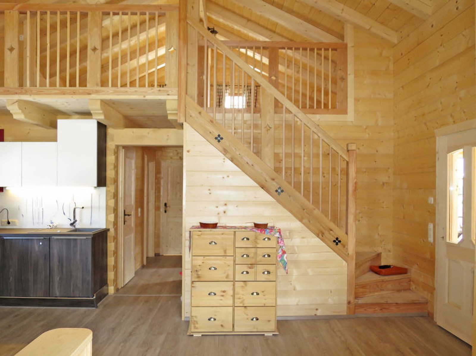 2-room house 73 m2 on 2 levels. Cosy and wooden furniture furnishings: living/sleeping room with 1 double sofabed, dining table, satellite TV, electric heating and wood-burning stove. 1 double bedroom. Open gallery with sloping ceilings with 1 double bed. Open gallery with sloping ceilings with 1 double beds. Open kitchen (oven, dishwasher, 4 ceramic glass hob hotplates, toaster, kettle, electric coffee machine). Shower, sep. WC. Electric heating, wood heating. Wooden floors. Terrace. Terrace furniture, barbecue, deck chairs, box-room. Panoramic view. Facilities: washing machine, baby cot. Internet (WiFi, free). Please note: non-smokers only. Maximum 2 pets/ dogs allowed. Instead of an enclosed bedroom, some sleeping areas are located in an open-plan area (gallery, alcove, etc.). 50604-002008-2020