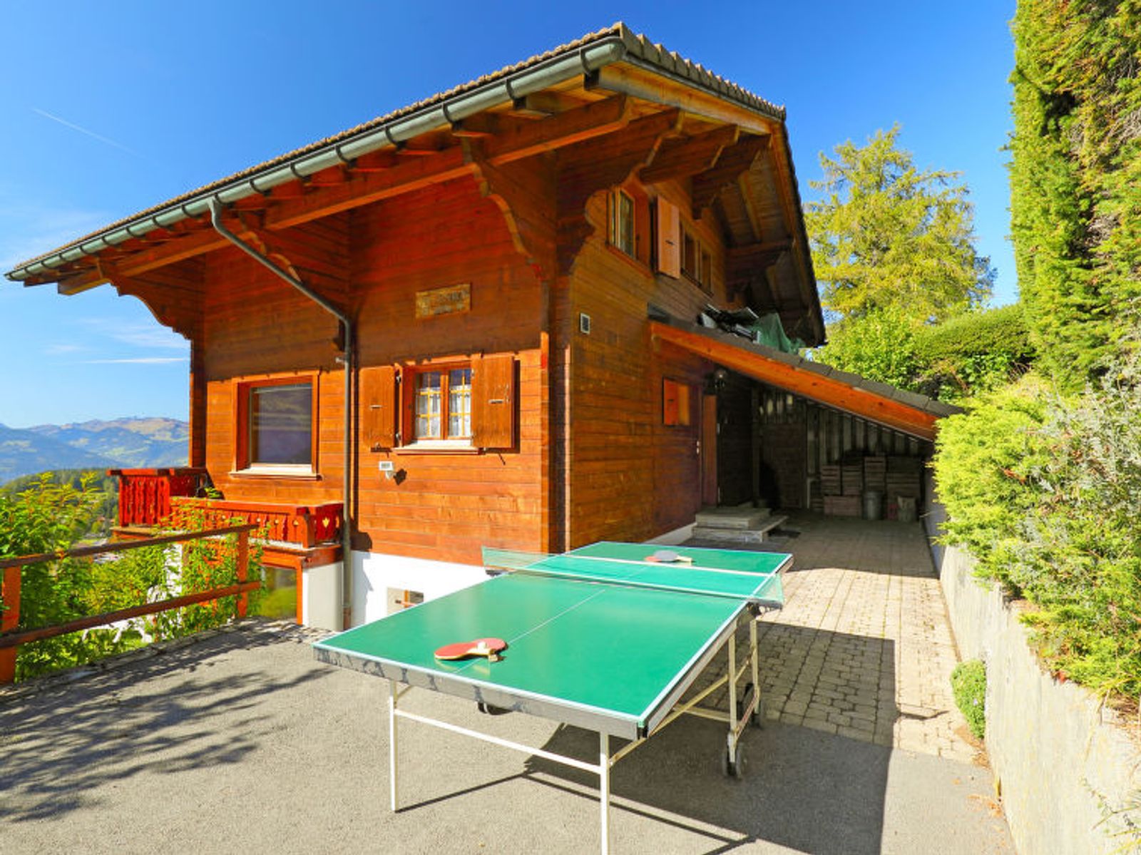 "Chalet Zan-Fleuron", 5-room chalet 150 m2 on 3 levels, south facing position. Comfortable and beautiful furnishings: large living/dining room with open-hearth fireplace, dining table and TV (flat screen), CD-player and DVD. Exit to the balcony, south facing position and west facing position. Open kitchen (oven, dishwasher, 4 ceramic glass hob hotplates, microwave, electric coffee machine, Capsules for coffee machine (Nespresso) extra, raclette grill, fondue Set (cheese)). Sep. WC. Electric heating. On the lower ground floor: large living/sleeping room with 1 pull-out bed (2 x 90 cm), hi-fi system. Exit to the terrace, south facing position. Shower/WC. Electric heating. Upper floor: 1 room with 2 beds (90 cm). Exit to the balcony, south facing position. 1 room with 1 double bed (2 x 90 cm). Exit to the balcony, south facing position. 1 small room 8 m2, without wardrobe with 2 beds (90 cm). Bath/WC. Electric heating. Large balcony 15 m2, south facing position and west facing position, small balcony 5 m2, south facing position, large terrace 25 m2. Terrace furniture. Very beautiful panoramic view of the mountains and the valley. Facilities: washing machine, dryer. Internet (WiFi, free). Parking (roofed). Please note: non-smoking house.