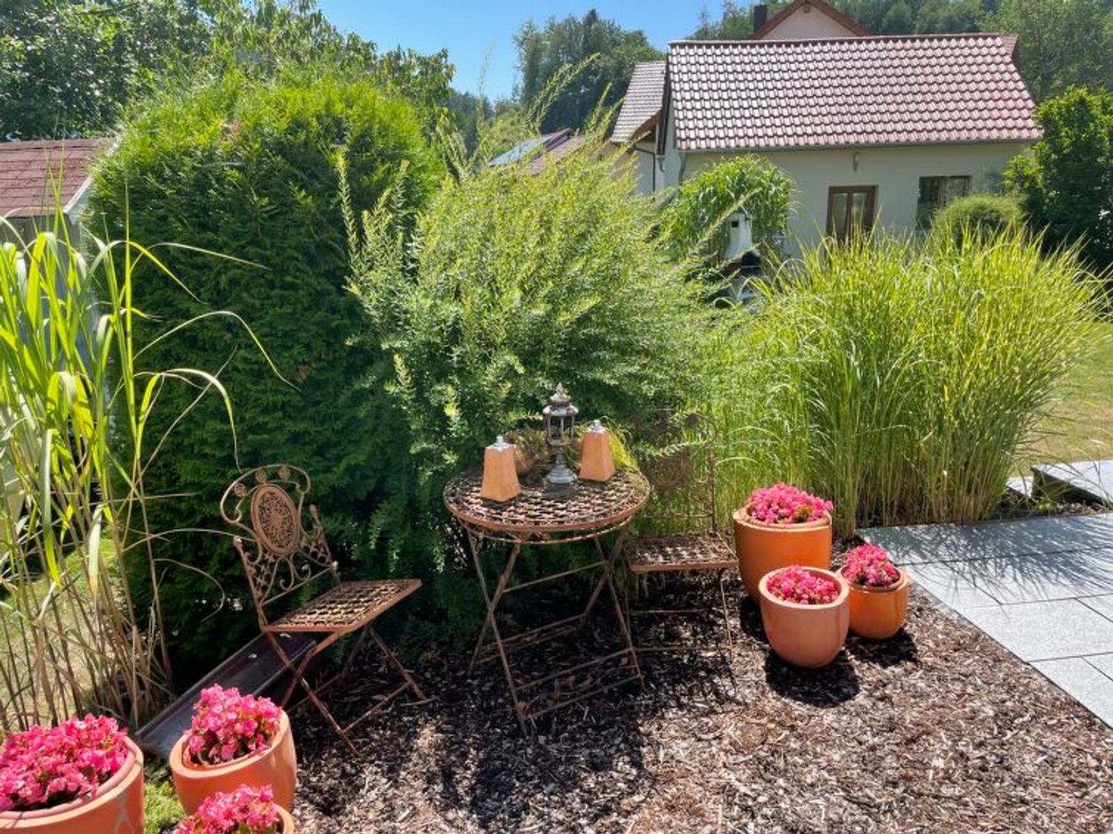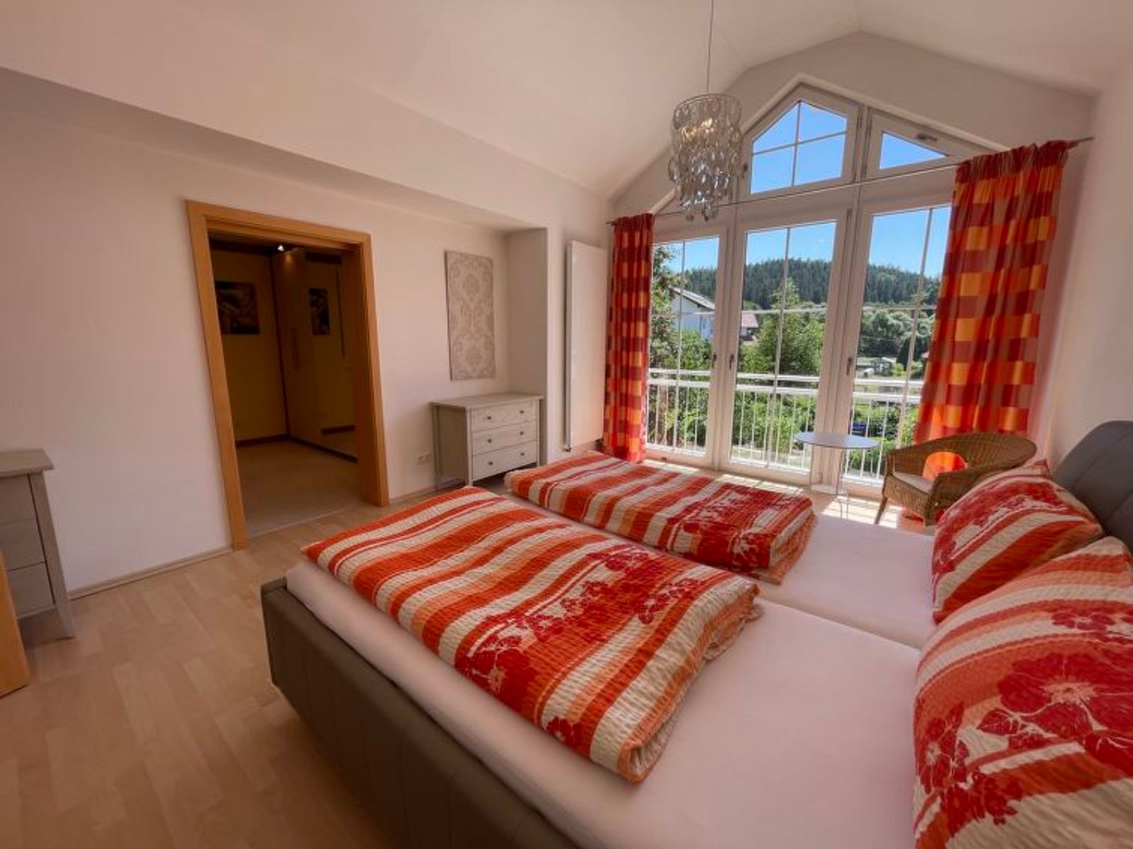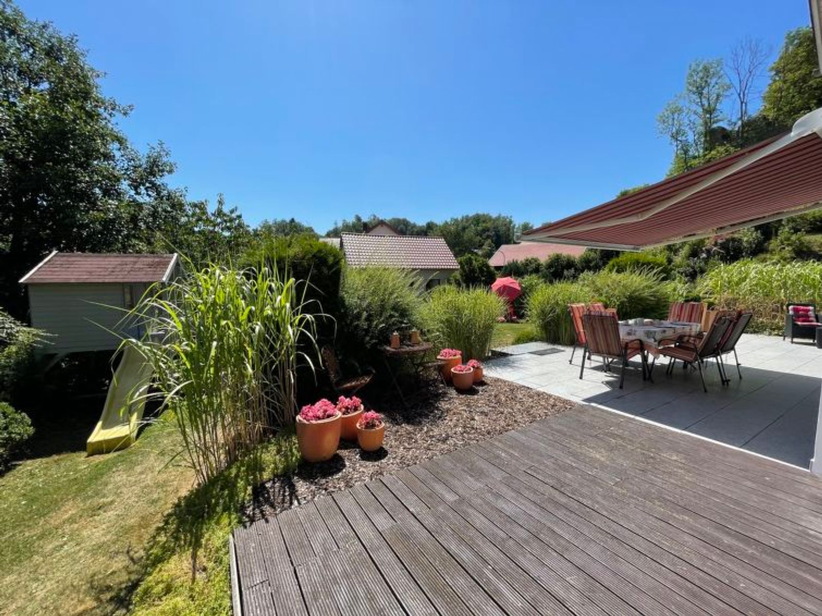 House "Ederer", semi-detached. In the district of Neuhaus 3 km from the centre of Schorndorf, 11 km from the centre of Cham, 50 km from the centre of Regensburg, 100 m from the edge of the forest, in the countryside. Private: property 1'000 m2, well-kept garden (not fenced) with wildlife garden, lawn for sunbathing. Children's playground (swing, sandbox), parking on the premises, single garage. Shop 3 km, supermarket 11 km, bus stop "Obergoßzell, Traitsching" 2.4 km, outdoor swimming pool 3.7 km. A separate apartment in the annex is temporarily rented out on a long-term basis.