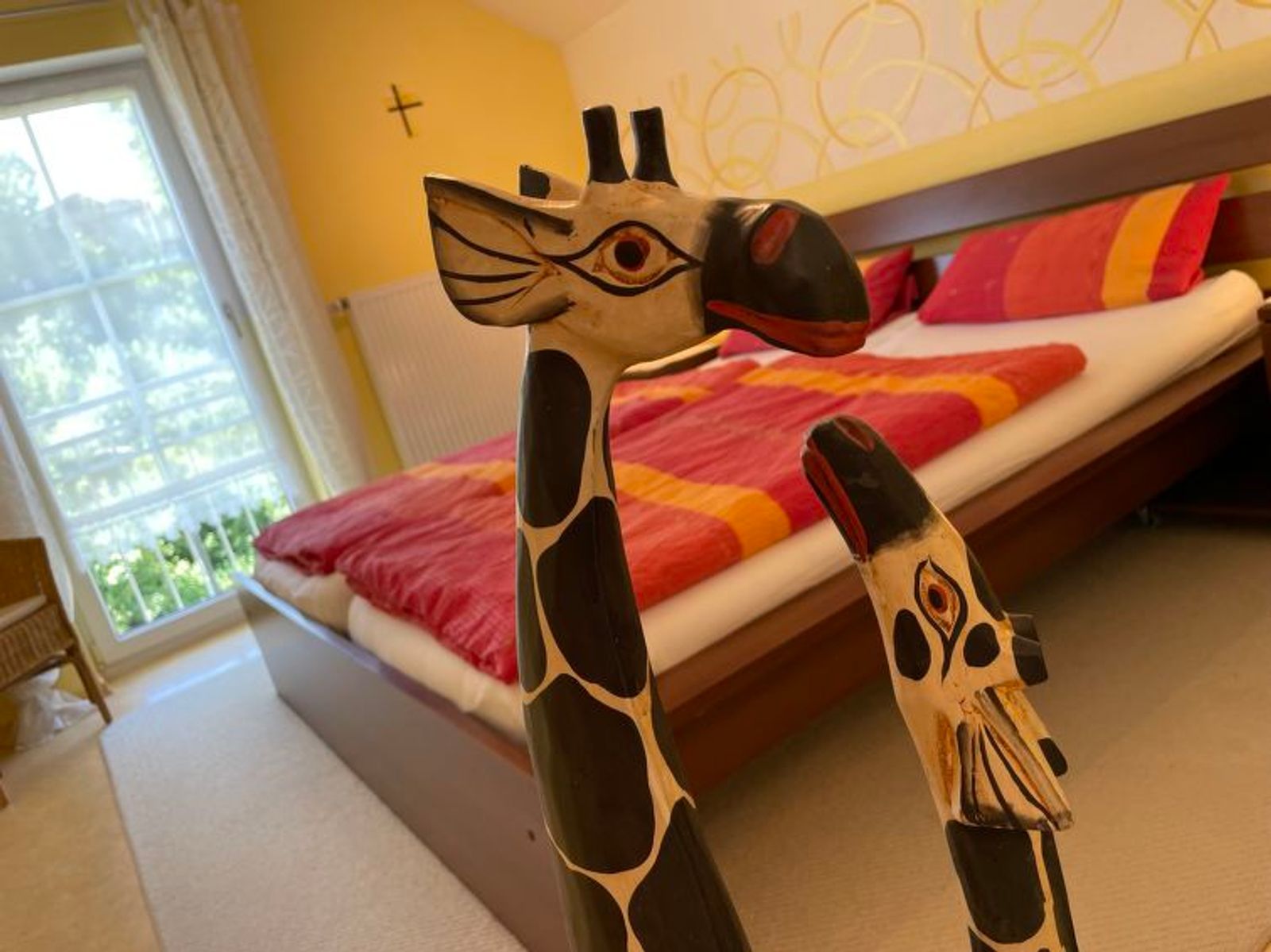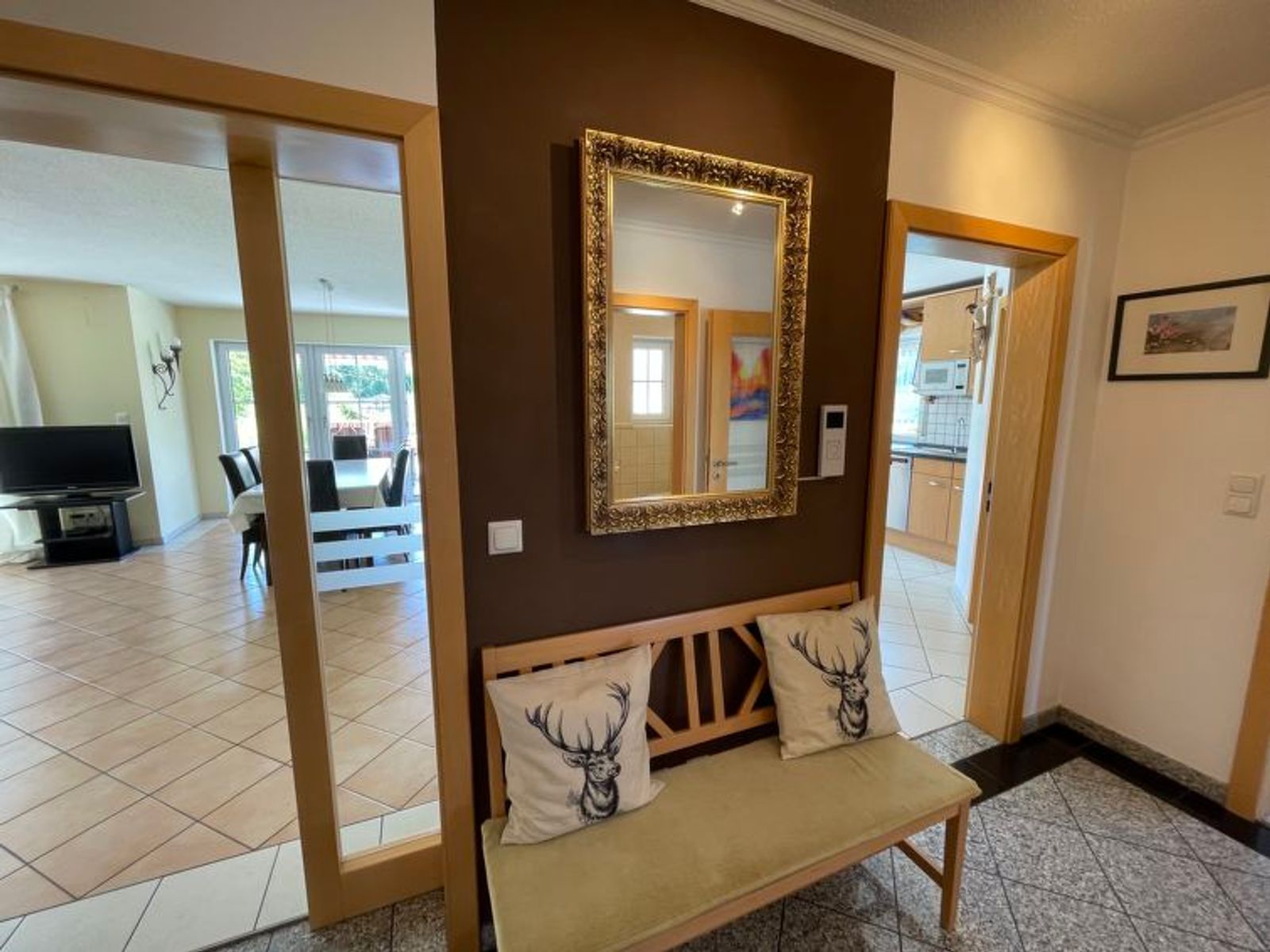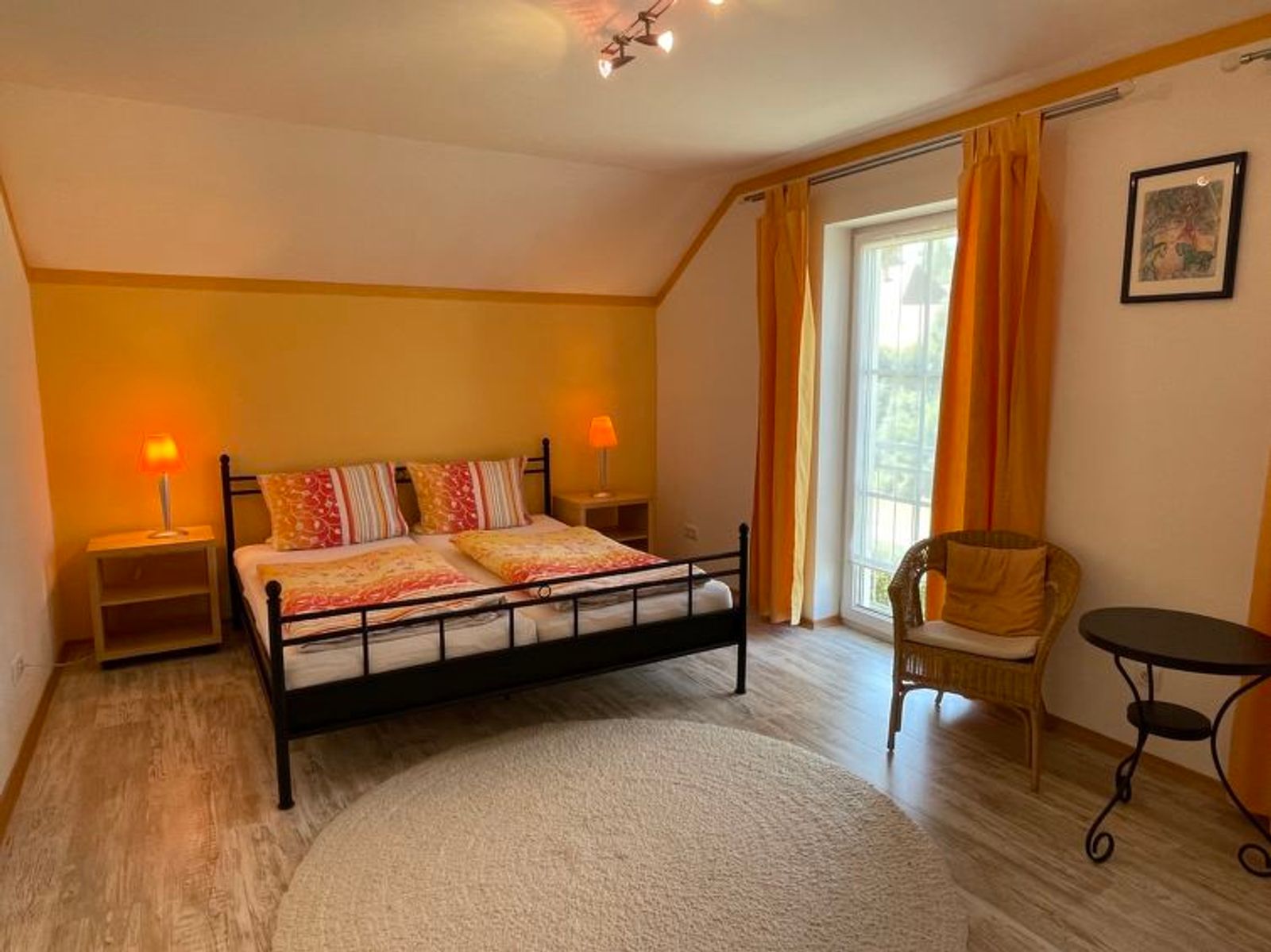 House "Ederer", semi-detached. In the district of Neuhaus 3 km from the centre of Schorndorf, 11 km from the centre of Cham, 50 km from the centre of Regensburg, 100 m from the edge of the forest, in the countryside. Private: property 1'000 m2, well-kept garden (not fenced) with wildlife garden, lawn for sunbathing. Children's playground (swing, sandbox), parking on the premises, single garage. Shop 3 km, supermarket 11 km, bus stop "Obergoßzell, Traitsching" 2.4 km, outdoor swimming pool 3.7 km. A separate apartment in the annex is temporarily rented out on a long-term basis.