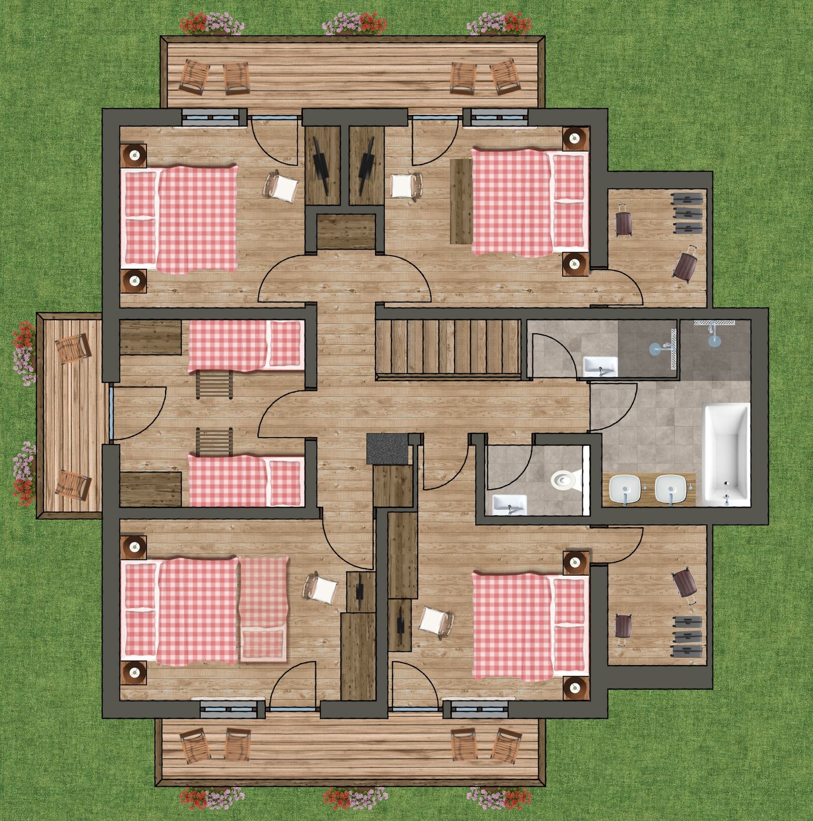 - 5x bedrooms with double beds