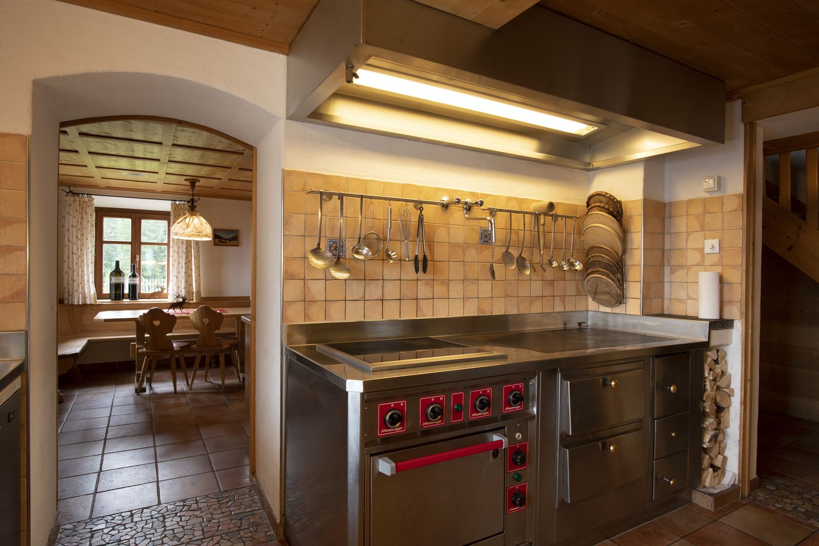 The 240 square meters of living area offers enough space for up to 17 guests. The living space is spread over three floors. In the basement there is the well-equipped kitchen, two adjoining dining rooms and access to the furnished terrace. The ski room and wood storage are also in the basement.