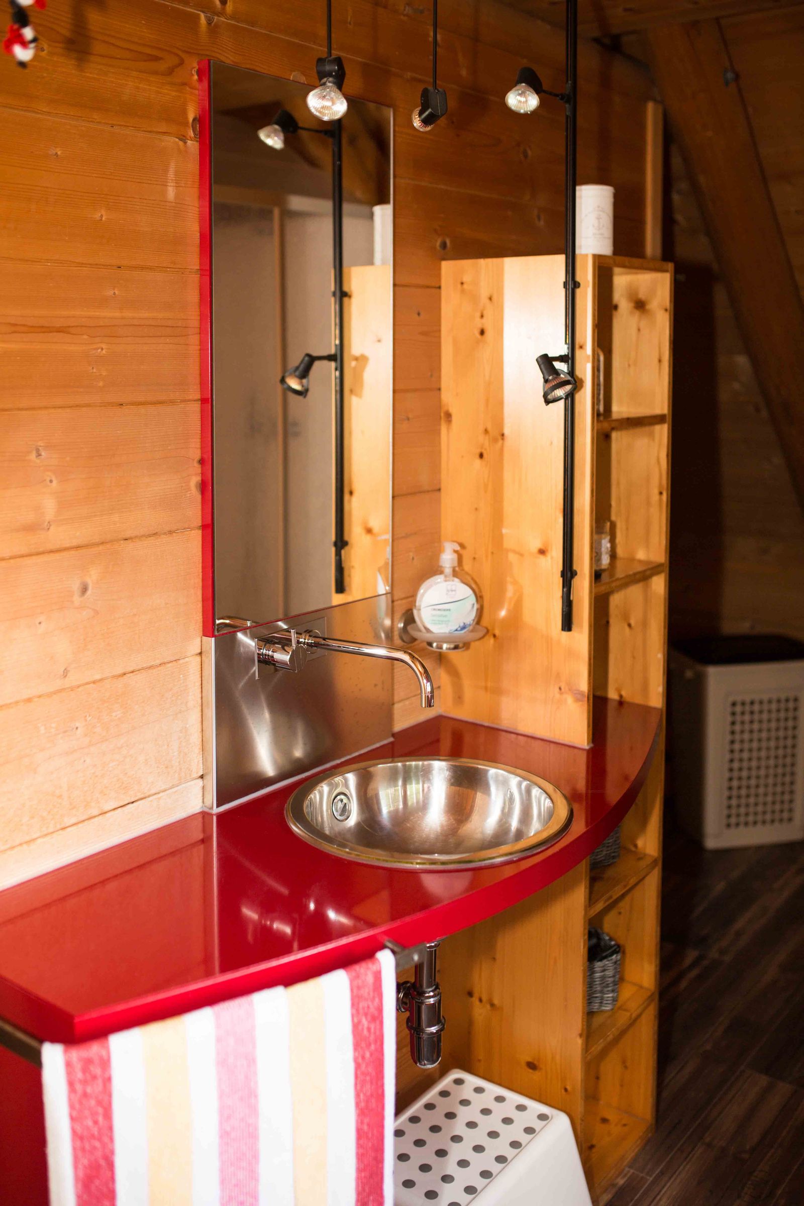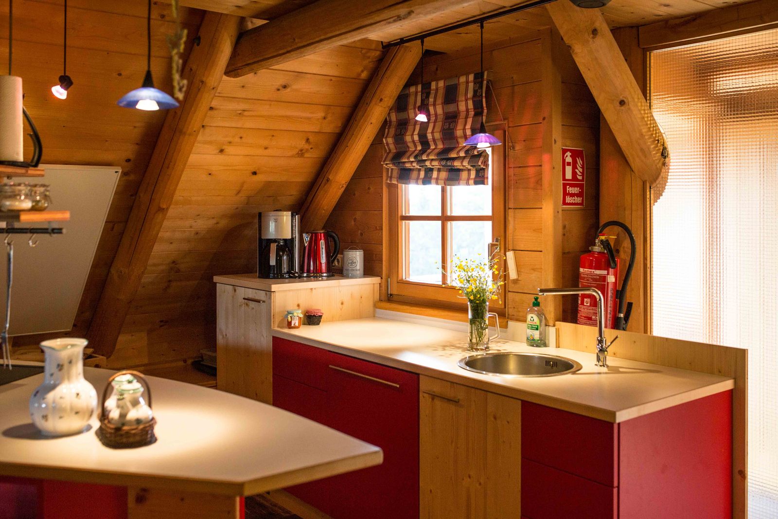 - Living area with kitchen on the upper floor: refrigerator with freezer compartment, electric stove with oven, dishwasher, blender, kettle, coffee machine, microwave and toaster