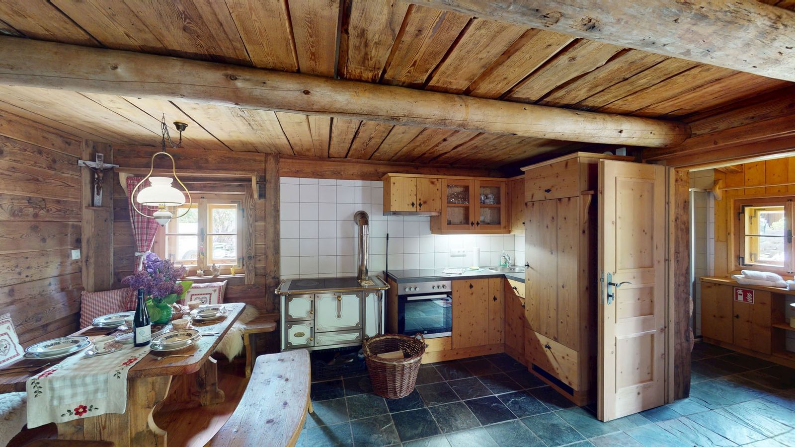 - Fitted kitchen with electric stove and oven, wood-burning stove, refrigerator with freezer compartment, dishwasher, coffee machine and kettle