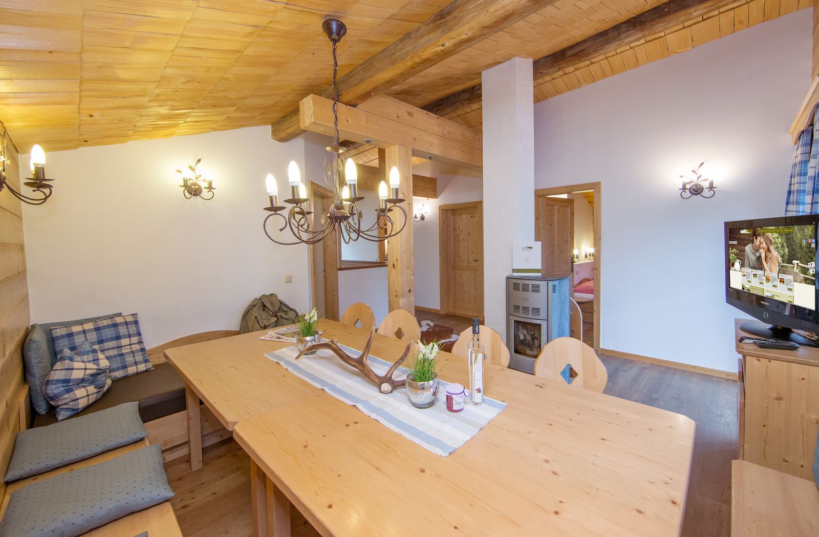- Living room with dining table and Swedish stove as well as flat screen TV on the upper floor