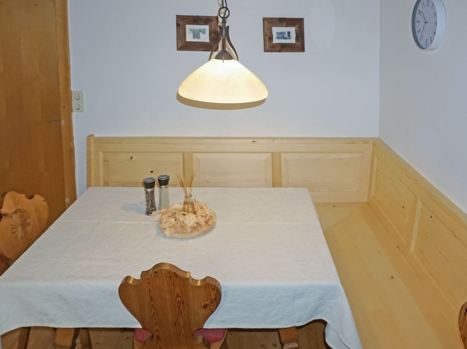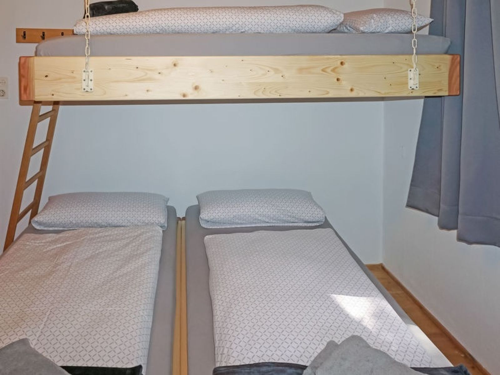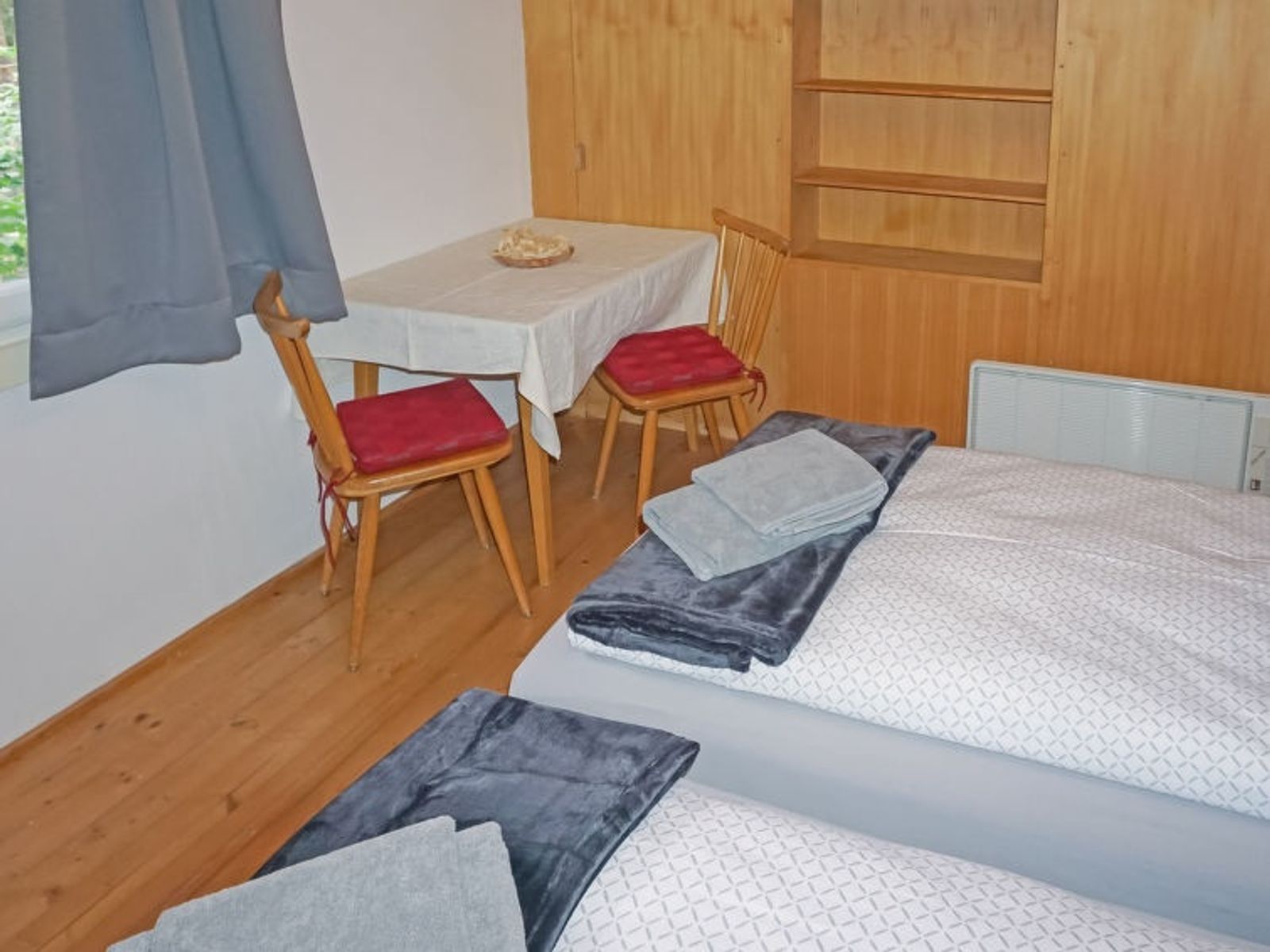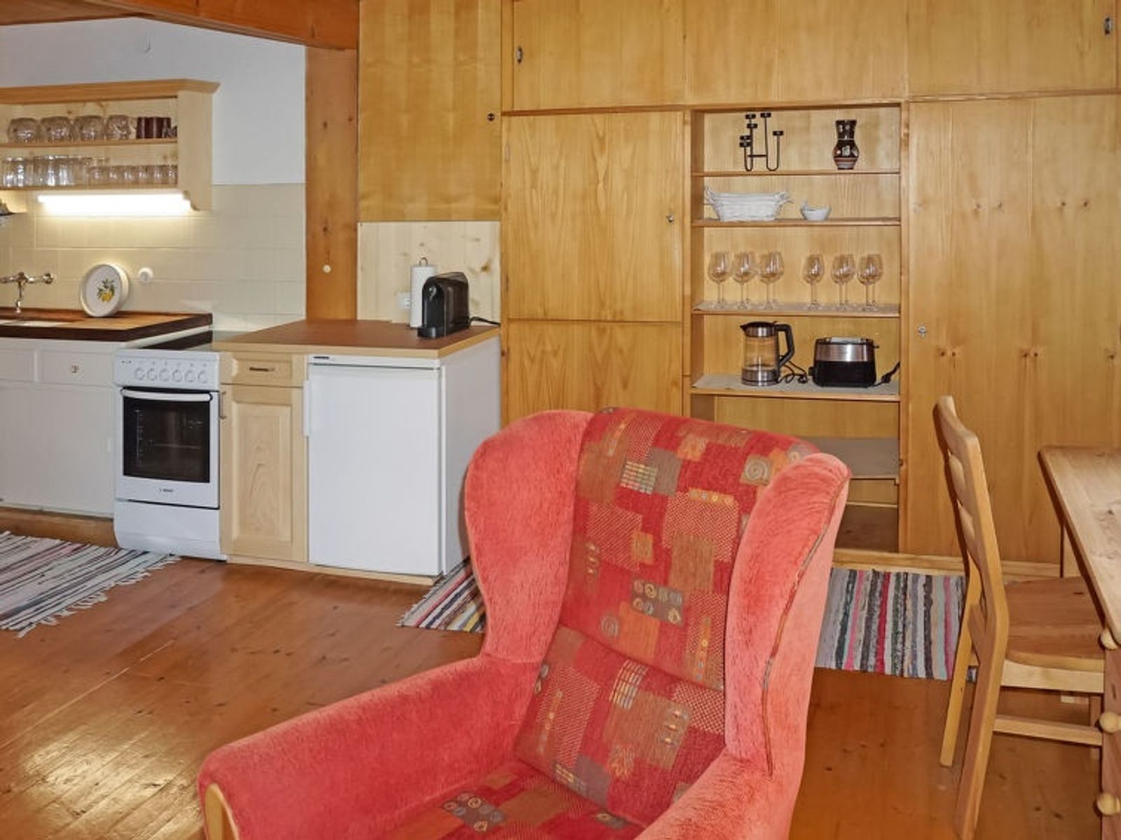 3-room house 80 m2. Rustic and wooden furniture furnishings: entrance hall. 1 room with 2 beds. 1 room with 1 x 1 bunk beds, 1 double bed. Large kitchen-/living room (oven, 4 ceramic glass hob hotplates, toaster, kettle, microwave, electric coffee machine, Capsules for coffee machine (Erstausstattung) free) with 1 double sofabed (1 x 150 cm, length 180 cm), dining nook and TV (flat screen), hi-fi system and electric heating. Shower, sep. WC. Electric heating. Wooden floors. Large terrace, east facing position. Terrace furniture. Please note: non-smoking house. Smoke alarm, fire extinguisher. Attention: TV and WiFi must be paid extra on site (Netflix). House suitable for 4 adults and 3 children (bed size)!