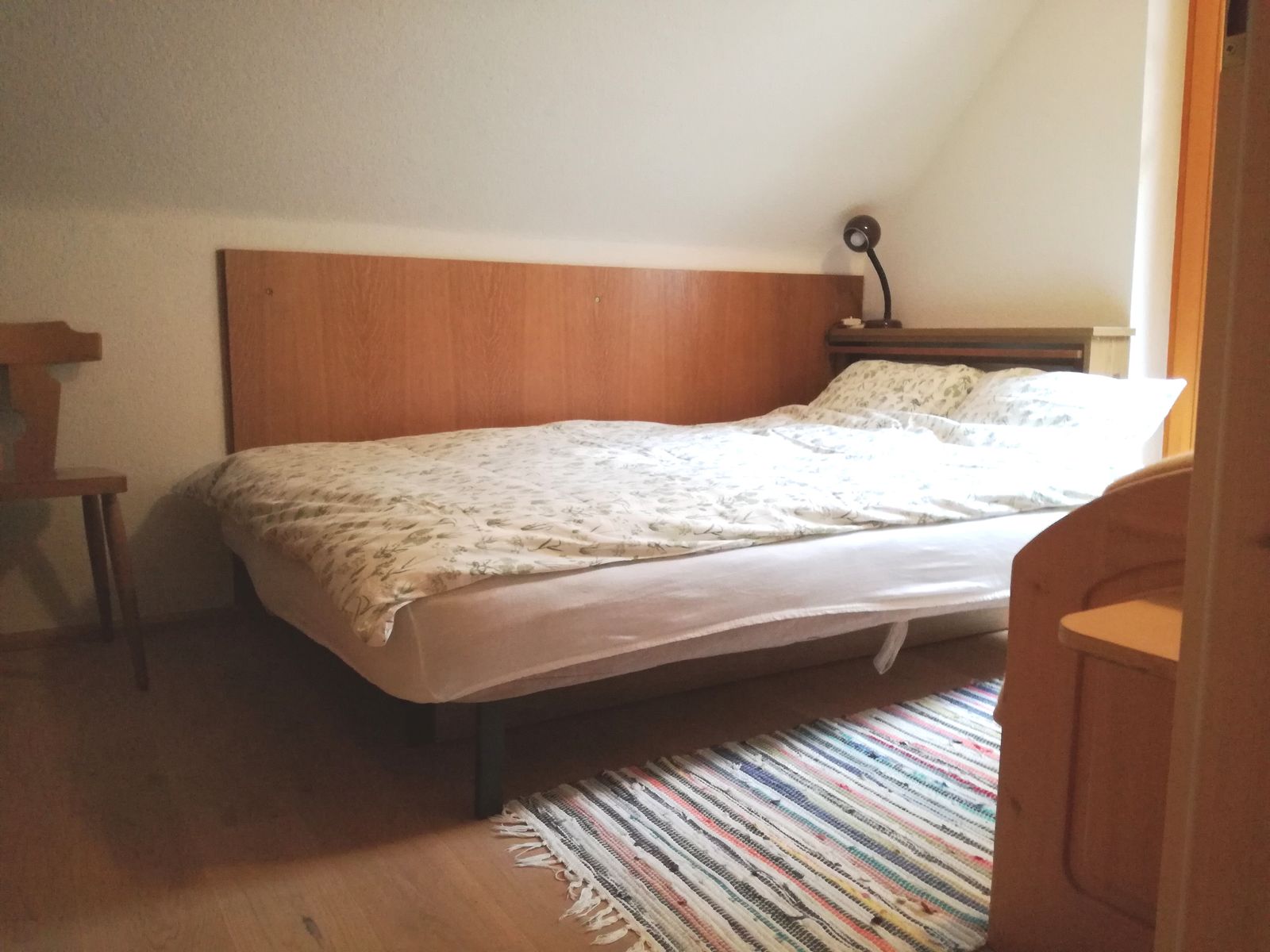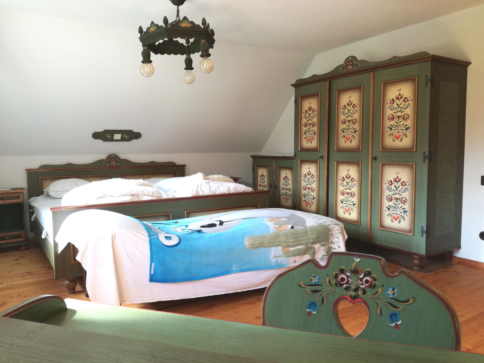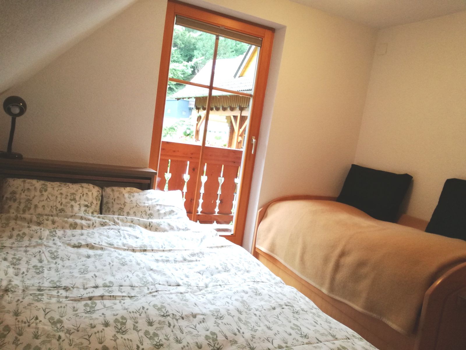 - 2 bedrooms upstairs: 1 bedroom with large double bed and single bed and 1 bedroom with double bed and small extra bed for children