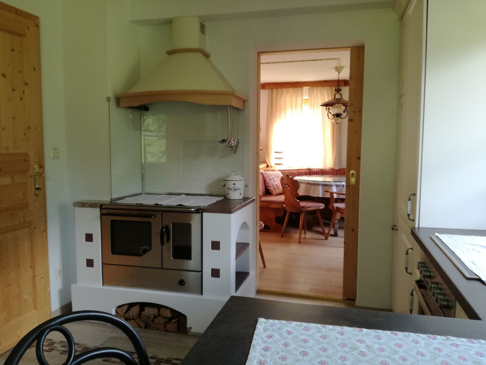 - Living room with dining area and tiled stove