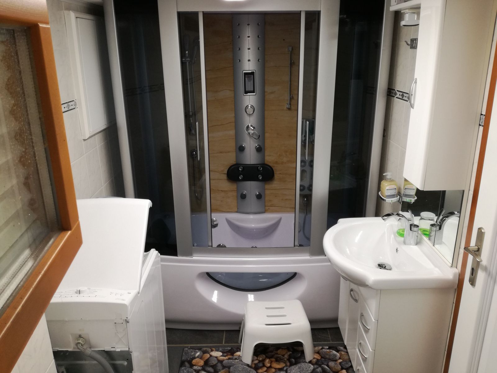 - 1 large bathroom with whirlpool shower temple, bathtub with steam function, washing machine and toilet in the basement