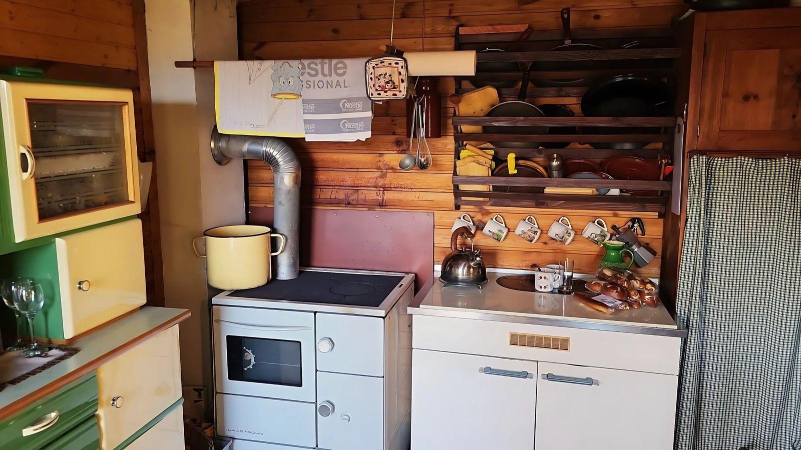 - Living room with wood stove with integrated oven, mocha or espresso pot, slicer