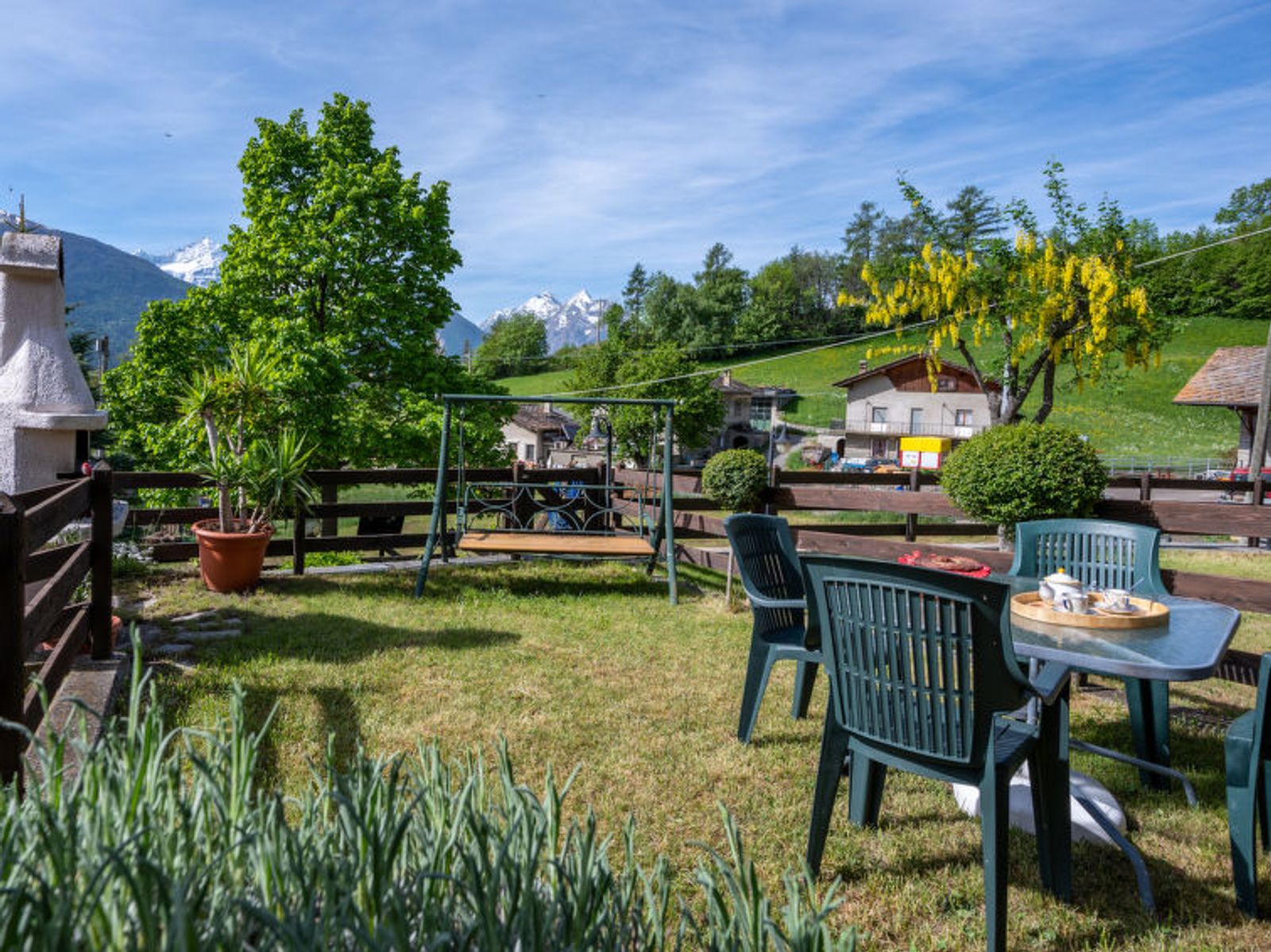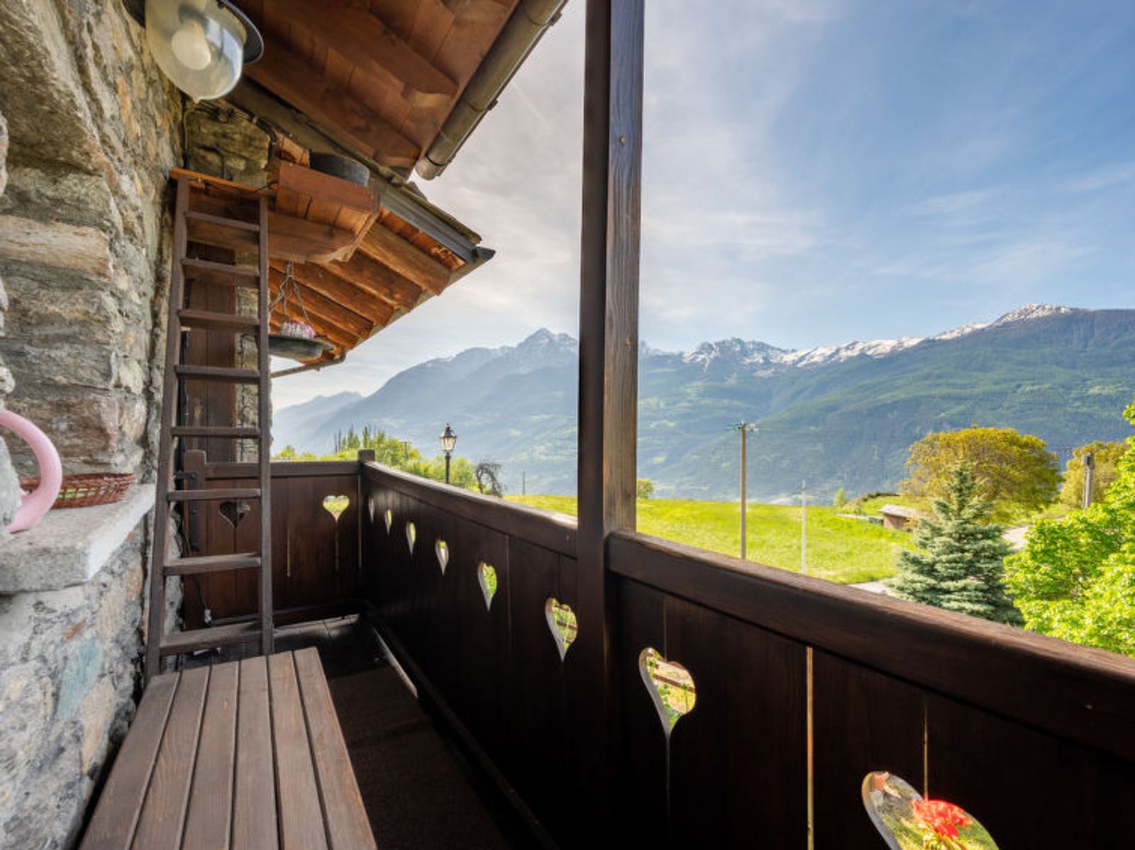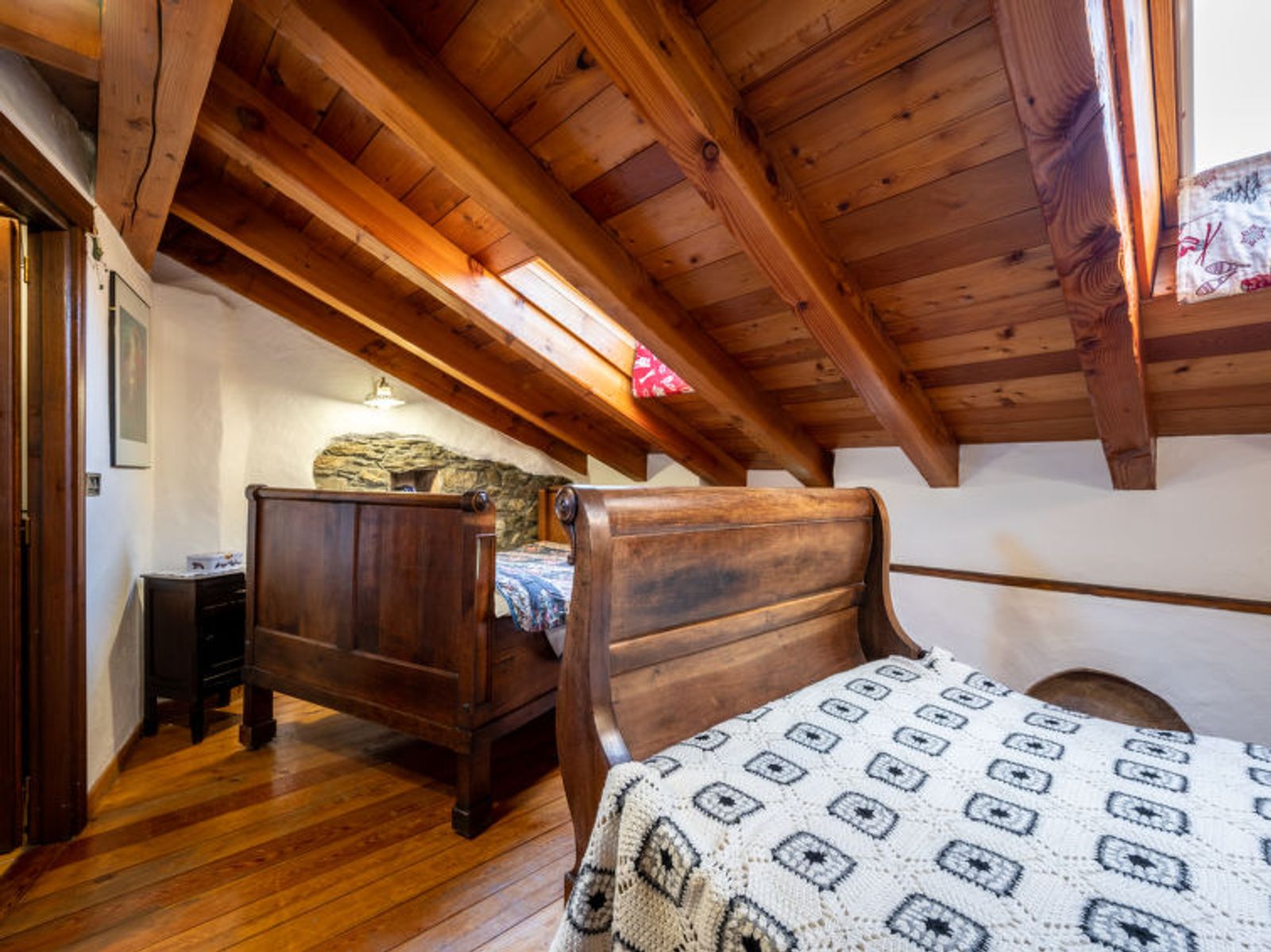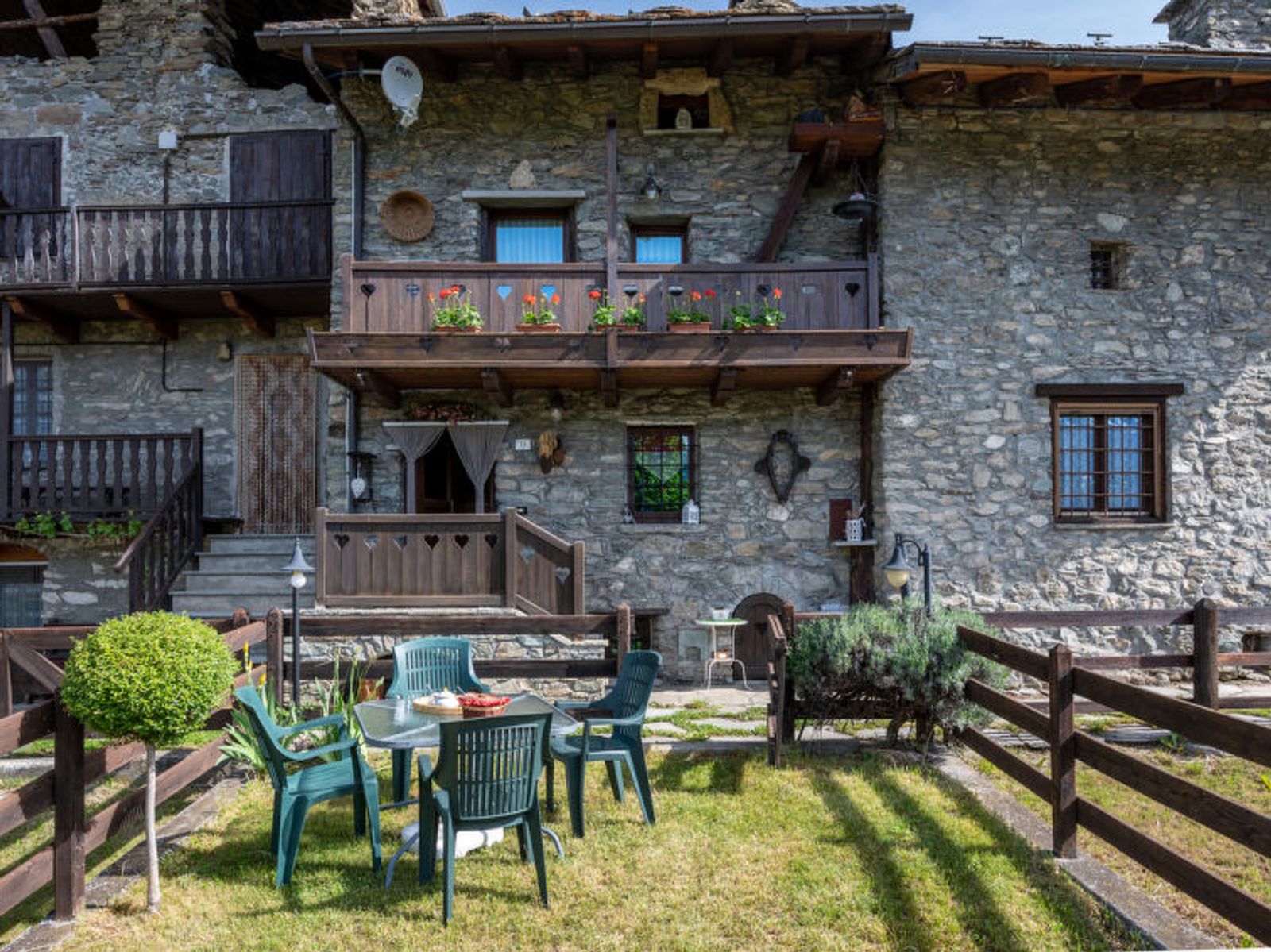 Rustic, historical terraced house "Maison Meynet", 1'200 m a.s.l., 3 storeys, semi-detached. In the hamlet Ville sur Sarre 8 km from the centre of Sarre, in a quiet position, south-east facing position. Private: garden (fenced) with lawn. Garden furniture, barbecue. In the house: storage room for bicycles, storage room for skis. In Winter: please take snow chains. Parking, public parking on the road. Supermarket 8 km, restaurant 8 km, bar 8 km, bus stop "Sarre" 8 km, thermal baths "Pre'-Saint-Didier" 36 km. Nearby attractions: Courmayeur Mont Blanc 36 km, Ovovia Aosta-Pila 12 km, pista di fondo Saint Nicholas 13 km. Please note: car recommended.