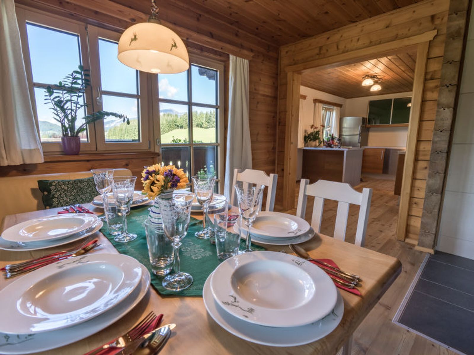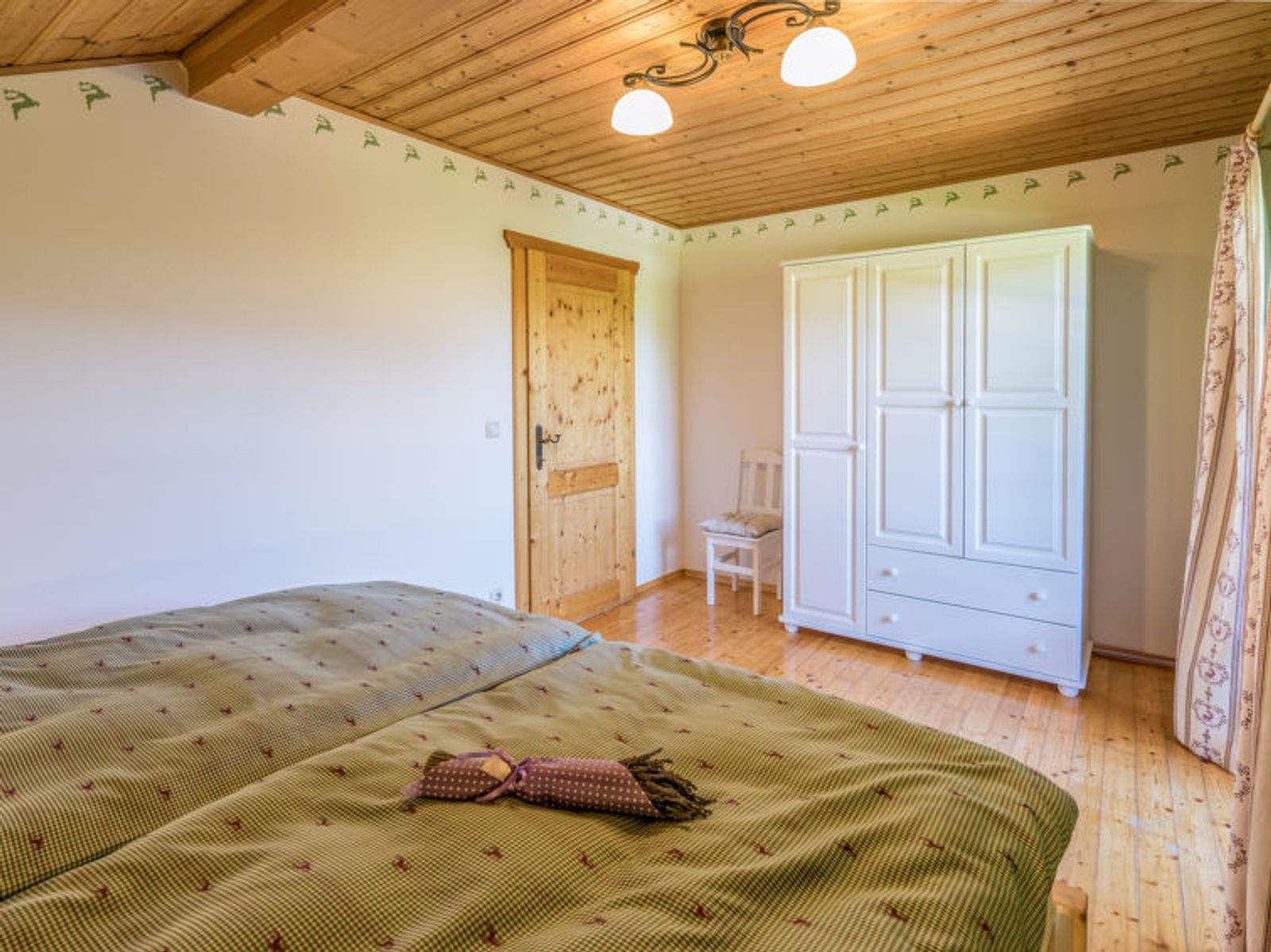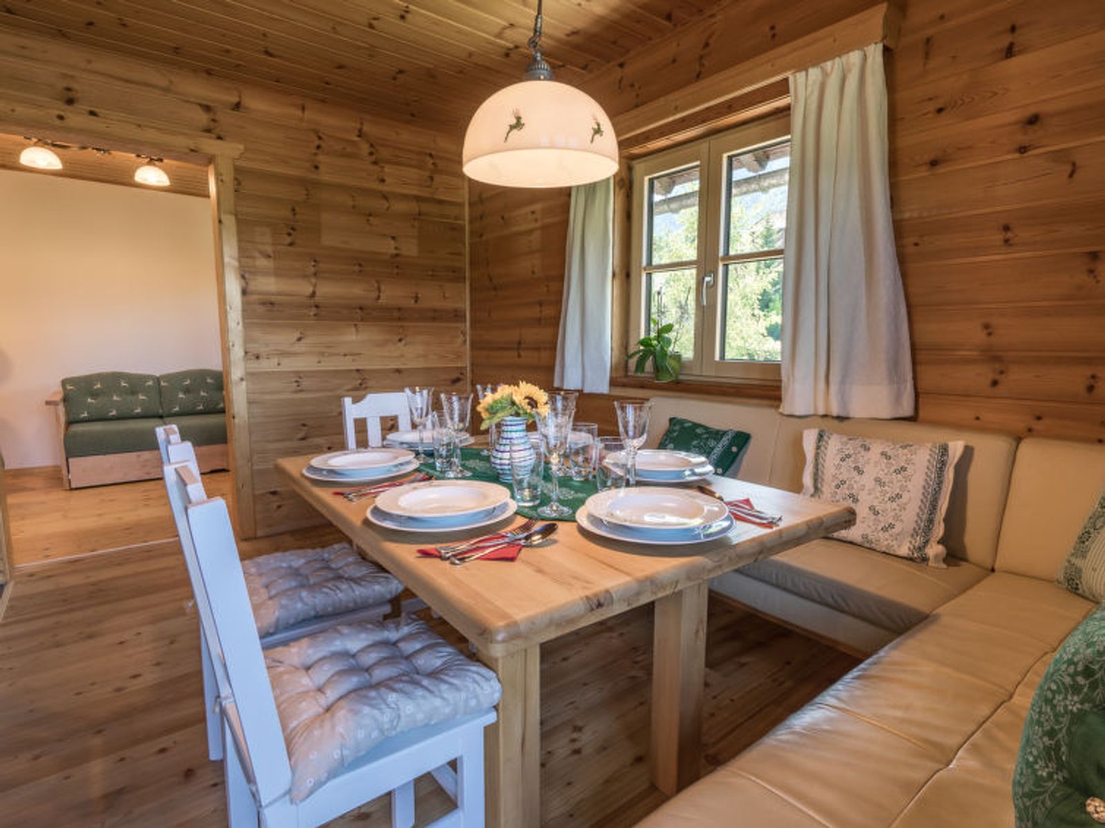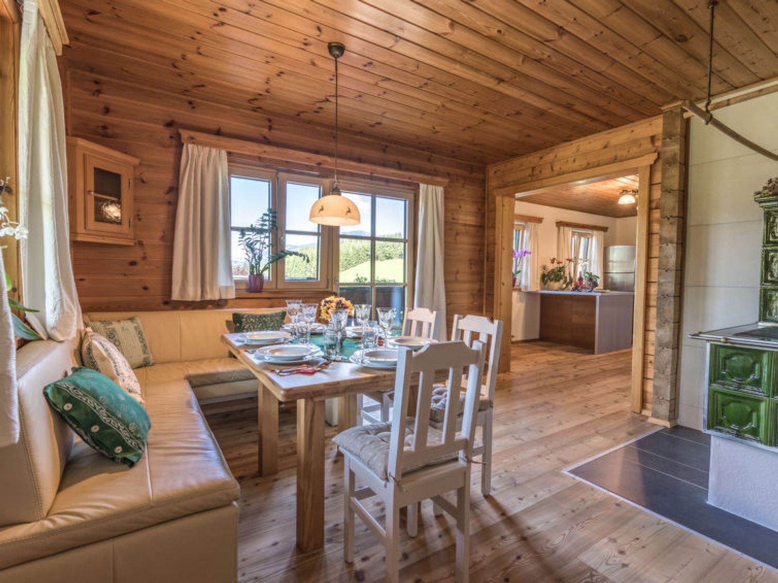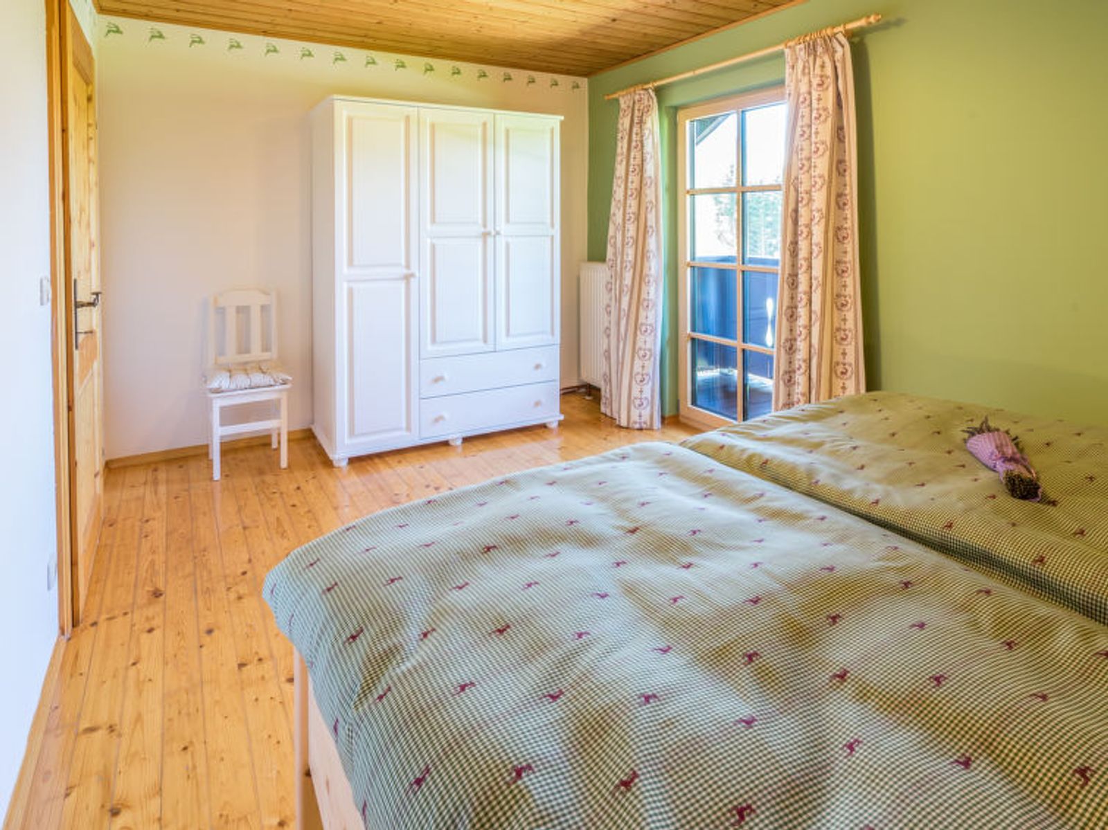 6-room chalet 160 m2. Spacious, partly with sloping ceilings, comfortable and stylish furnishings: dining room with dining nook, cable TV and tiled stove. Exit to the terrace. Living room. Open kitchen (oven, dishwasher, 4 ceramic glass hob hotplates, freezer, electric coffee machine). Shower/bidet/WC, sep. WC, double hand-basin. On the lower ground floor: 1 double bedroom with shower/WC. 1 room with 2 beds. Upper floor: 1 double bedroom. Exit to the balcony. 1 room with 2 beds. Large terrace, south facing position. Terrace furniture, balcony furniture, deck chairs, box-room. Marvellous panoramic view of the mountains and the countryside. Facilities: washing machine, safe, iron, children's high chair, baby cot, hair dryer, logs (free). Internet (WiFi, free). Please note: non-smoking house. Smoke alarm, fire extinguisher. Beds made of fine pine wood together with high-quality mattresses and bedding from local production guarantee a good and restful sleep. When there are less than the maximum number of guests staying at the property, not all of the housing units will be available for use.
