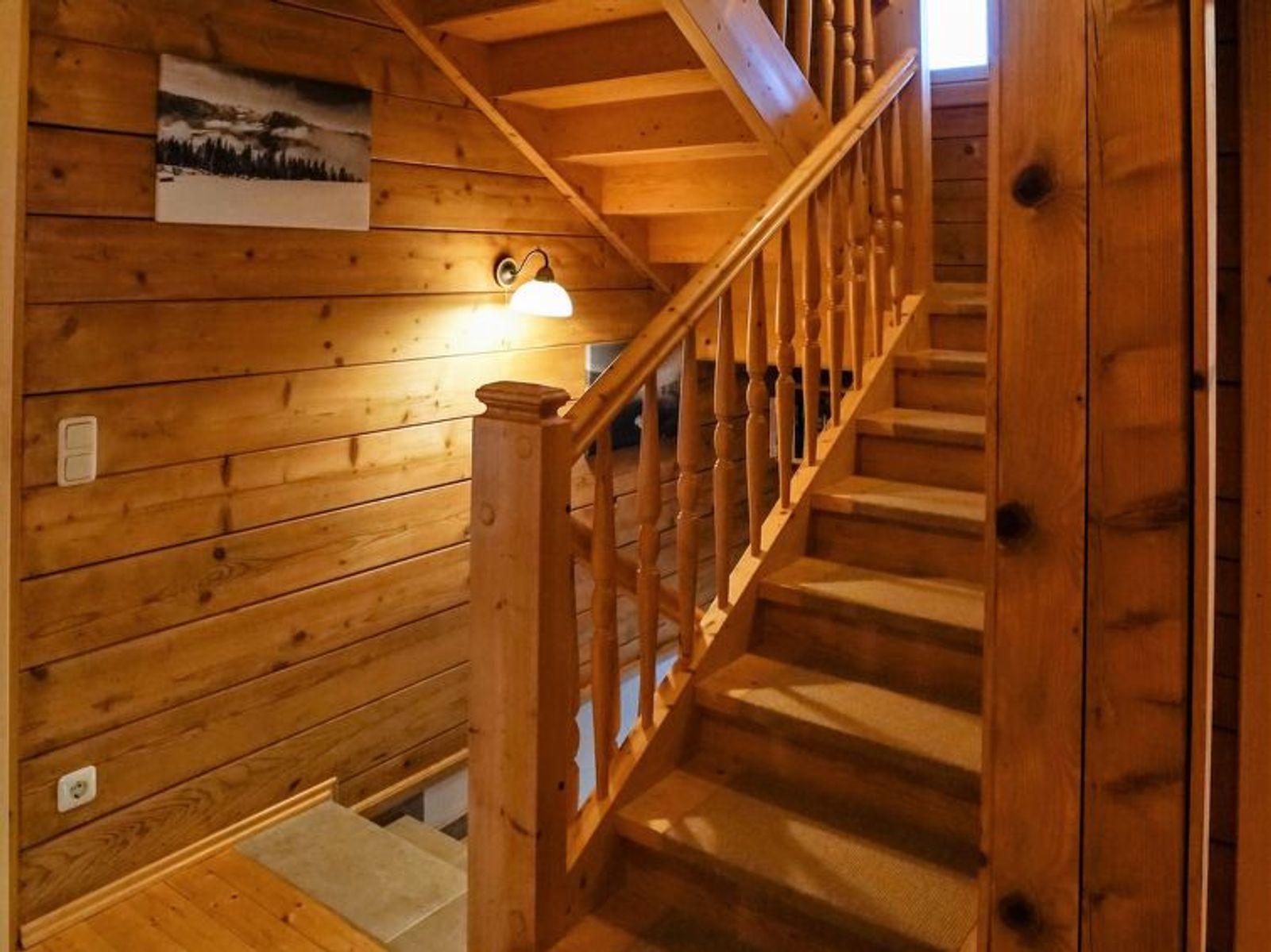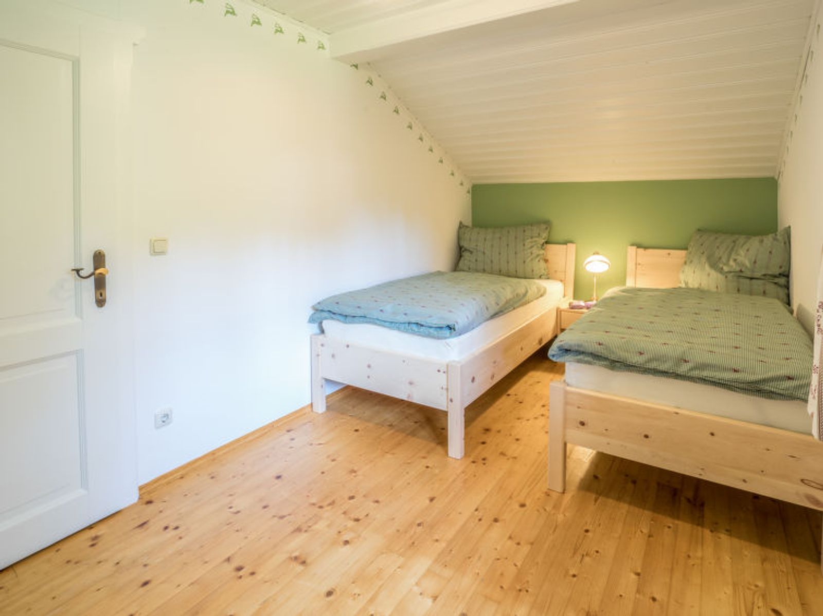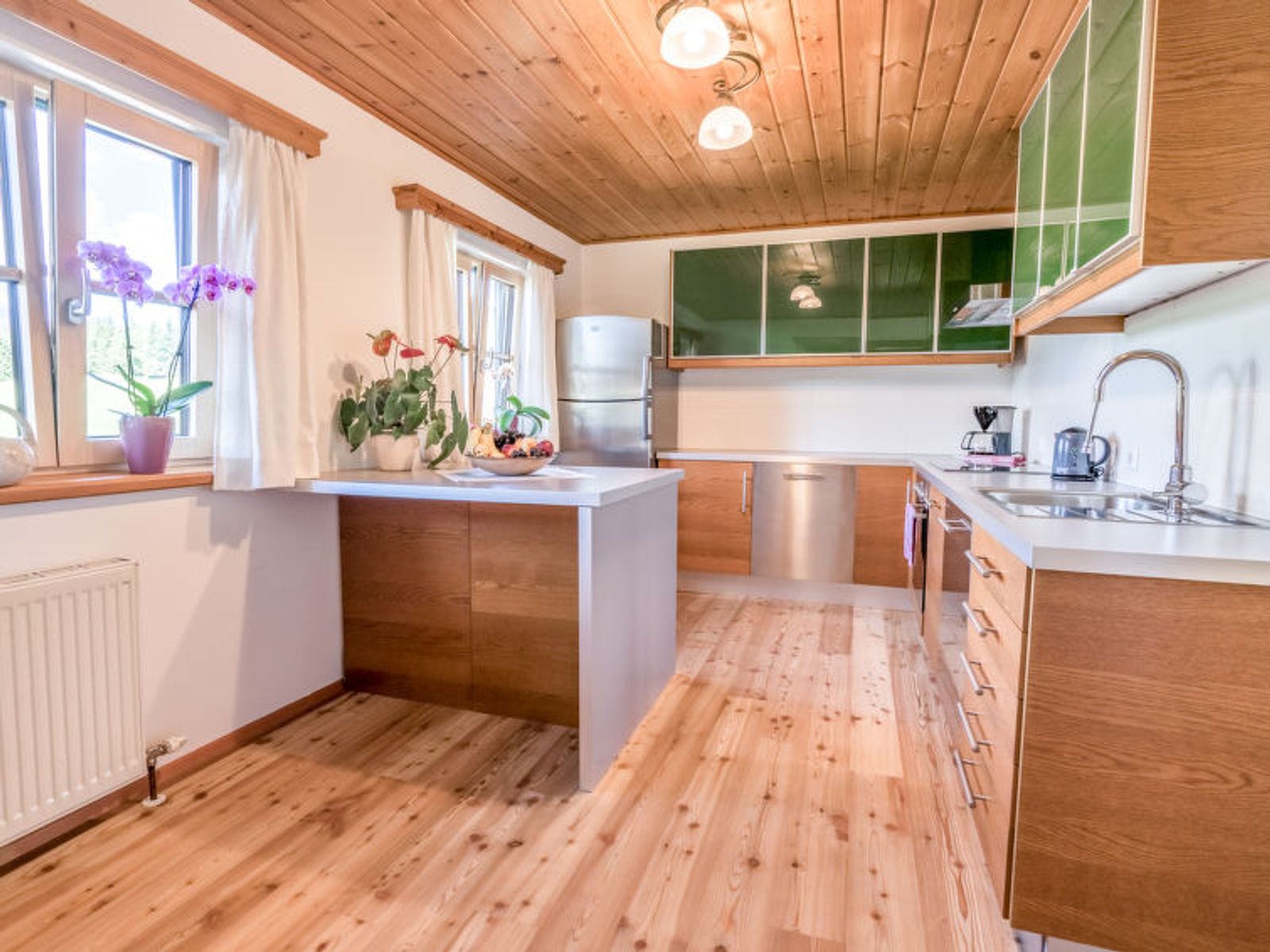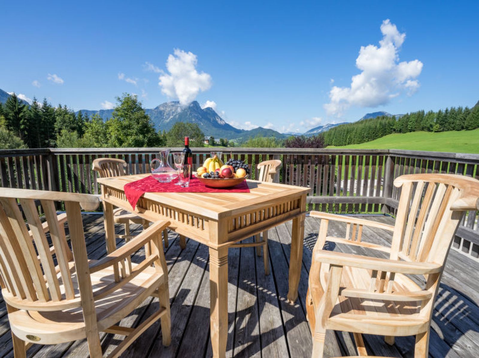 6-room chalet 160 m2. Spacious, partly with sloping ceilings, comfortable and stylish furnishings: dining room with dining nook, cable TV and tiled stove. Exit to the terrace. Living room. Open kitchen (oven, dishwasher, 4 ceramic glass hob hotplates, freezer, electric coffee machine). Shower/bidet/WC, sep. WC, double hand-basin. On the lower ground floor: 1 double bedroom with shower/WC. 1 room with 2 beds. Upper floor: 1 double bedroom. Exit to the balcony. 1 room with 2 beds. Large terrace, south facing position. Terrace furniture, balcony furniture, deck chairs, box-room. Marvellous panoramic view of the mountains and the countryside. Facilities: washing machine, safe, iron, children's high chair, baby cot, hair dryer, logs (free). Internet (WiFi, free). Please note: non-smoking house. Smoke alarm, fire extinguisher. Beds made of fine pine wood together with high-quality mattresses and bedding from local production guarantee a good and restful sleep. When there are less than the maximum number of guests staying at the property, not all of the housing units will be available for use.