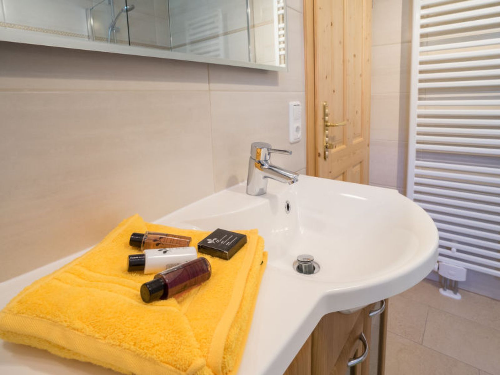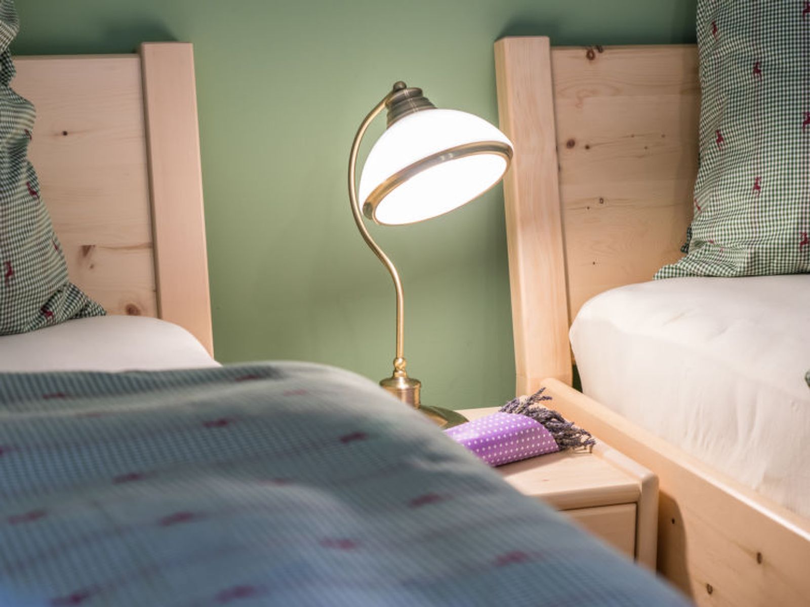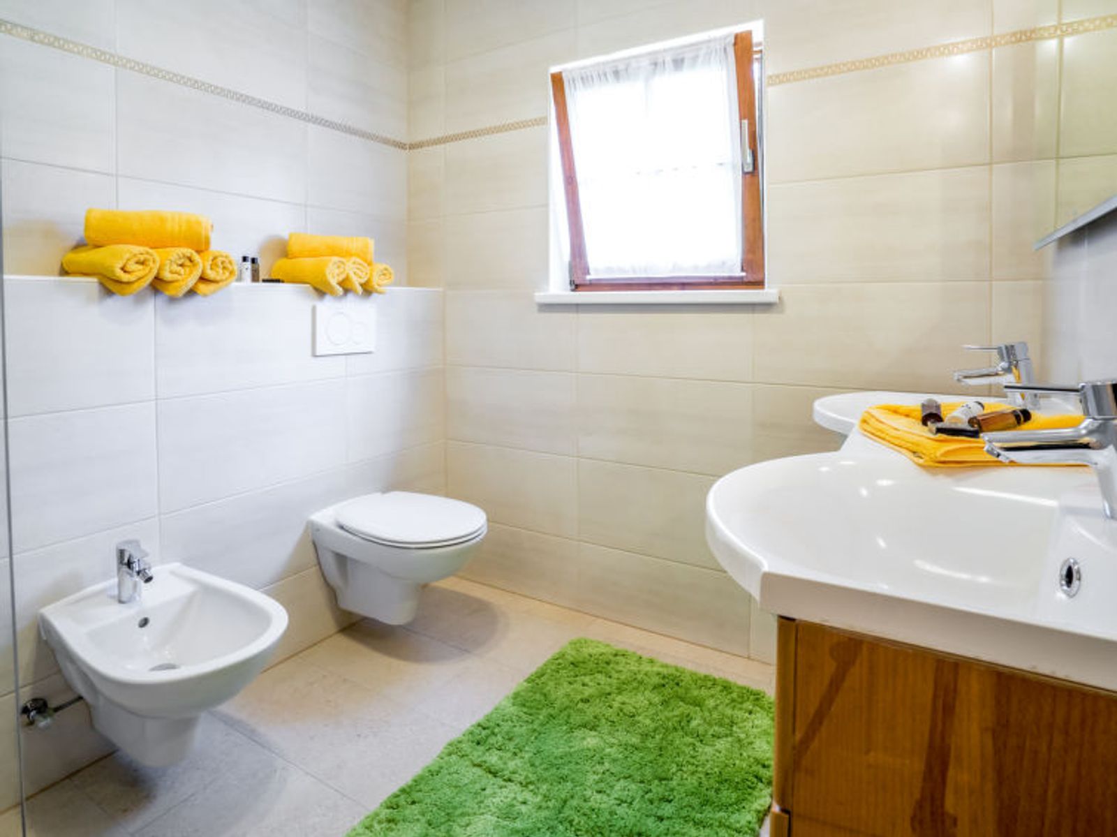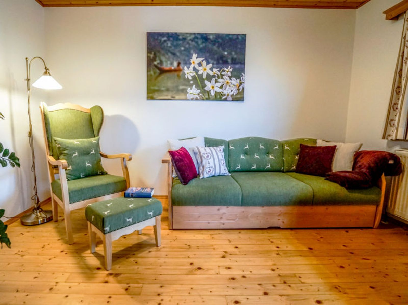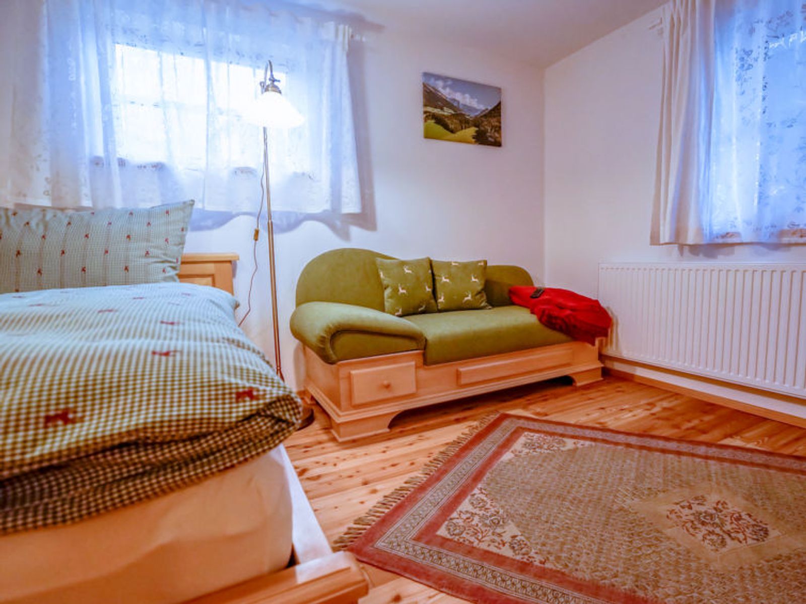 6-room chalet 160 m2. Spacious, partly with sloping ceilings, comfortable and stylish furnishings: dining room with dining nook, cable TV and tiled stove. Exit to the terrace. Living room. Open kitchen (oven, dishwasher, 4 ceramic glass hob hotplates, freezer, electric coffee machine). Shower/bidet/WC, sep. WC, double hand-basin. On the lower ground floor: 1 double bedroom with shower/WC. 1 room with 2 beds. Upper floor: 1 double bedroom. Exit to the balcony. 1 room with 2 beds. Large terrace, south facing position. Terrace furniture, balcony furniture, deck chairs, box-room. Marvellous panoramic view of the mountains and the countryside. Facilities: washing machine, safe, iron, children's high chair, baby cot, hair dryer, logs (free). Internet (WiFi, free). Please note: non-smoking house. Smoke alarm, fire extinguisher. Beds made of fine pine wood together with high-quality mattresses and bedding from local production guarantee a good and restful sleep. When there are less than the maximum number of guests staying at the property, not all of the housing units will be available for use.