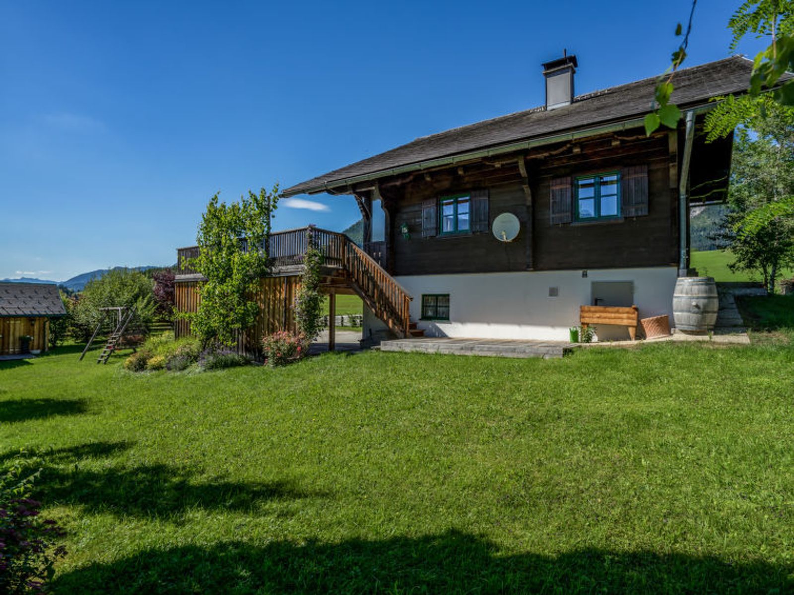 Impressive mountain panorama, beautiful flower meadows, crystal-clear mountain lakes or dreamy snow landscapes in the heart of Austria. All this awaits you in this authentic Ausseer-House, a haven of peace with upscale amenities. Cosy cottage "Bad Aussee", detached, surrounded by meadows and fields. 1.5 km from the centre, in a quiet, sunny position, 3 km from the lake, 9 km from the skiing area. Private: beautiful, well-kept garden 900 m2 with meadow. Arbour, terrace (30 m2), garden furniture, barbecue, children's playground (swing). In the house: WiFi, sun terrace, storage room for skis, ski boot dryer. In Winter: please take snow chains. Roofed, parking (for 2 cars) at the house. Shop 1.5 km, restaurant 1.5 km, café 1.5 km, bicycle rental 3 km, bus stop 200 m, thermal baths "Narzissen Vital Resort", bathing lake "Grundlsee" 3 km. Golf course (18 hole) 5 km, surf school 7 km, riding stable 3 km, sports centre 3 km, walking paths from the house 10 m, ski lift 3 km, chair lift 9 km, ski rental 7 km, ski school 7 km, children's ski school 9 km, sled run 3 km, cross country ski track 2 km. Nearby attractions: Naturerlebnis Alpengarten 6 km, Salzwelten Altaussee 8 km, Loser Panoramastrasse 9 km, UNESCO Weltkulturerbe Hallstatt 19 km. Well-known ski regions can easily be reached: Loser 9 km, Tauplitzalm 20 km. Hiking paths: Tresselsteinwarte, rund um den Grundlsee 3 km, Blaa Alm 10 km. Please note: baby equipment (included). Neighbourhood highly sensitive to noise. Quietness and good behaviour expected.