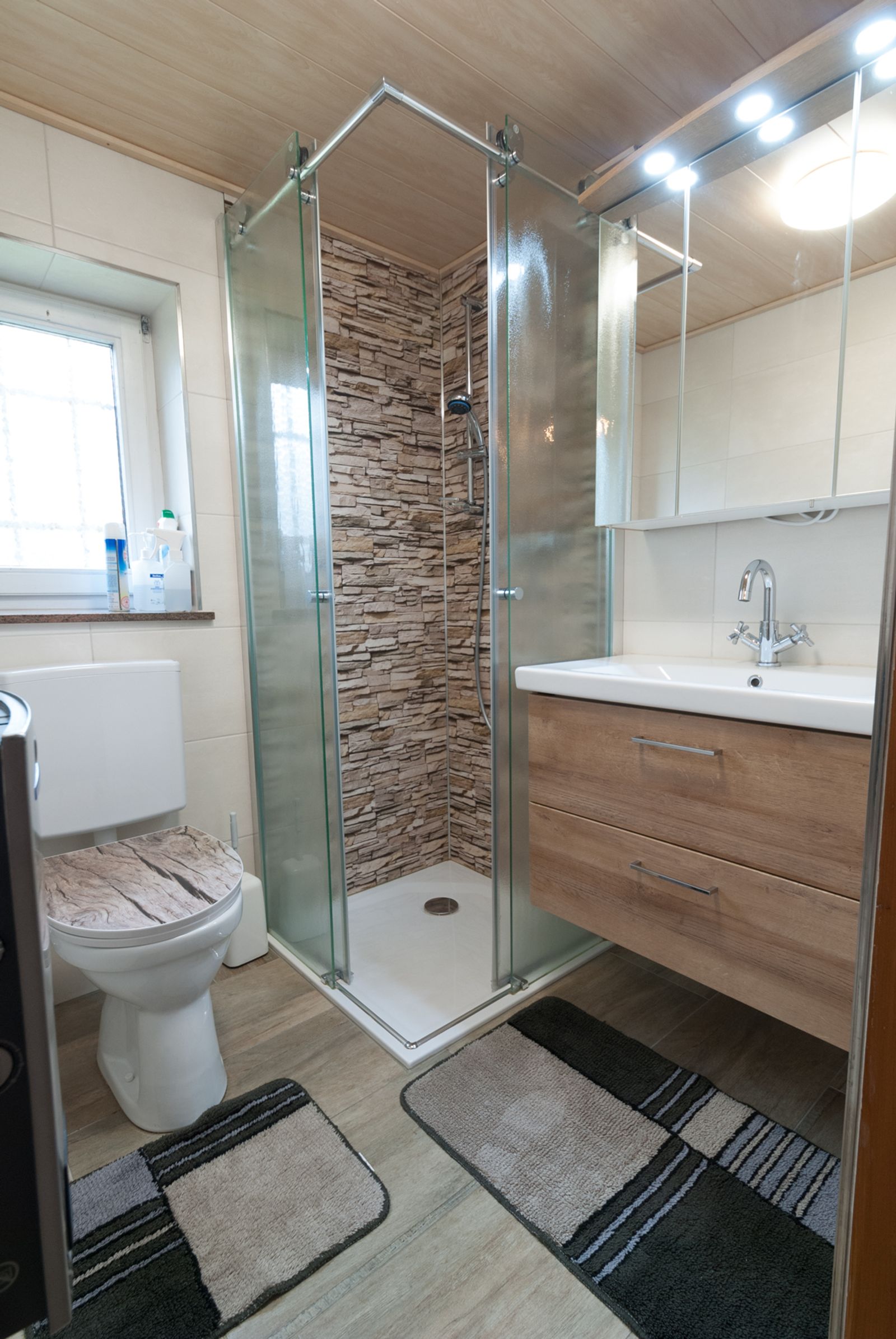 - 1 bathroom with shower, washbasin, toilet