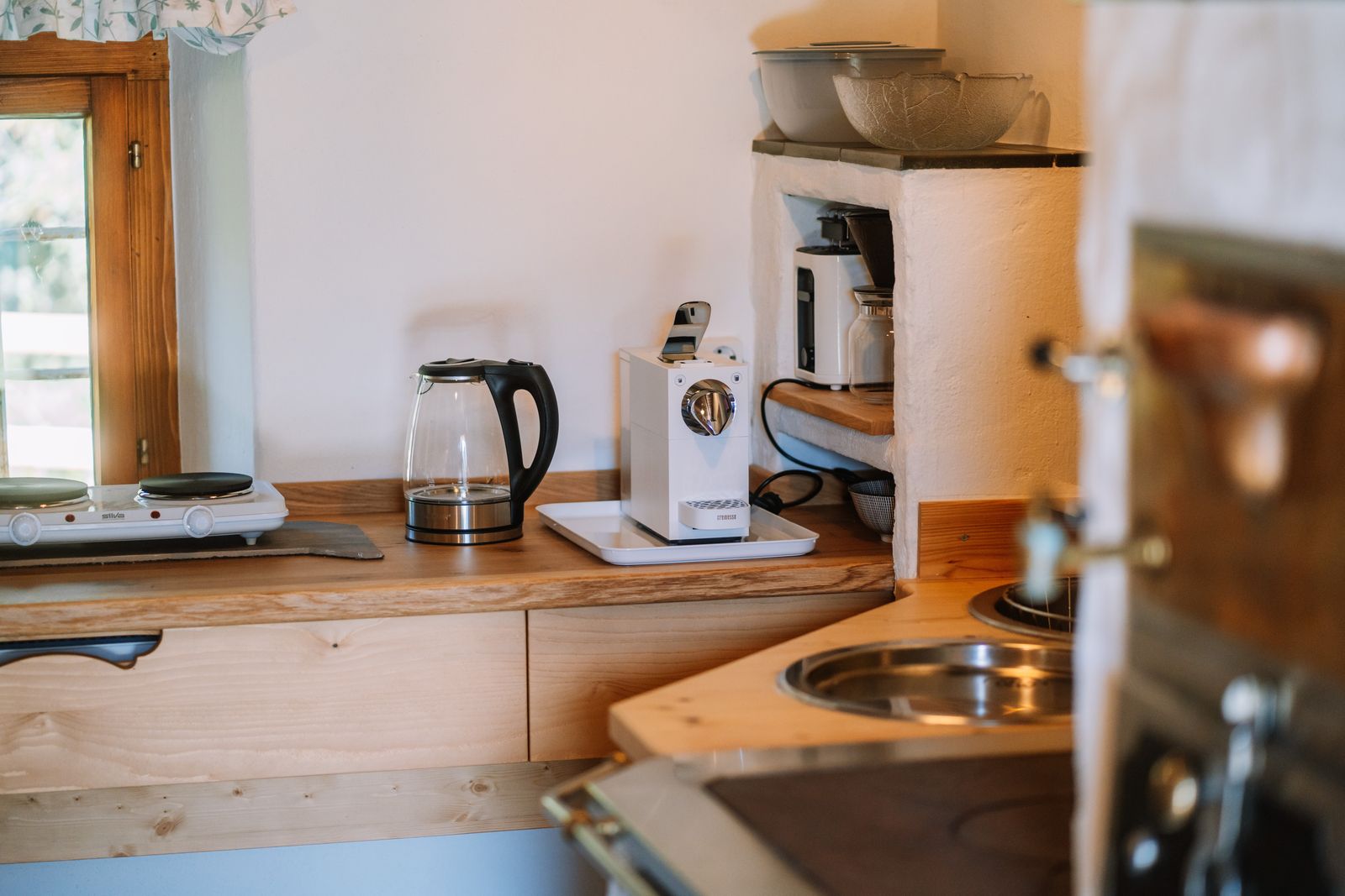 - Kitchen-diner with wood stove, refrigerator, coffee machine, hotplate with 2 burners and kettle