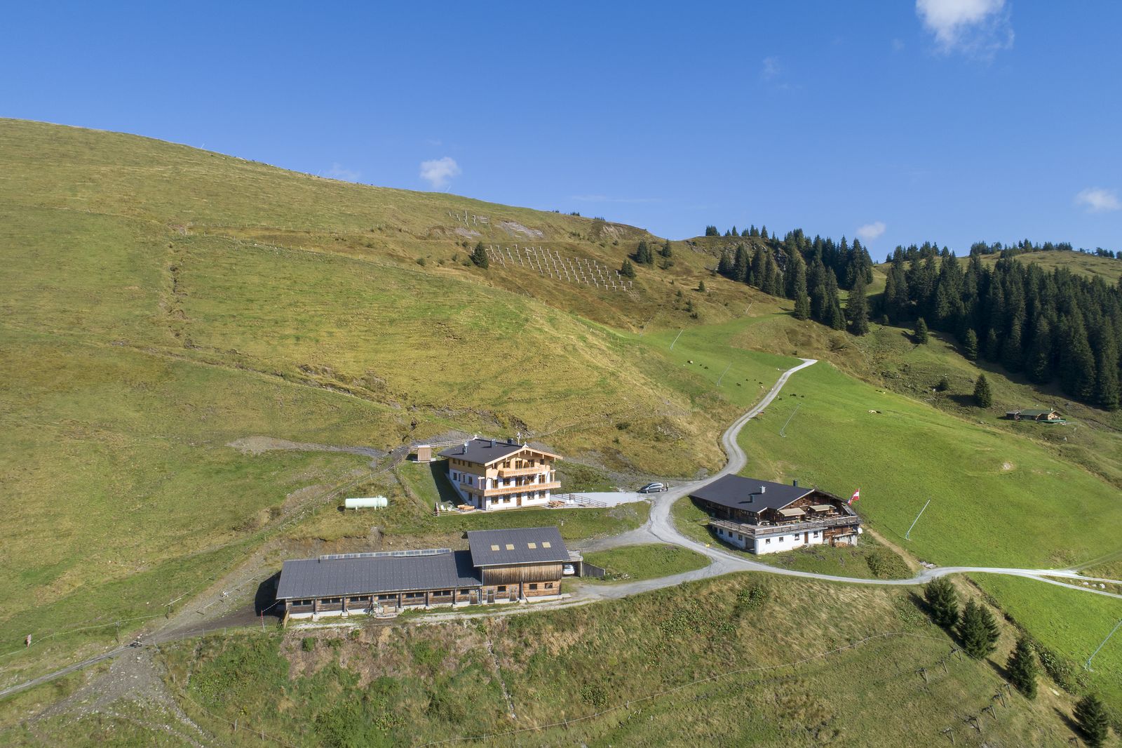 At an altitude of 1,650 meters with a spectacular view of the Kitzbühel Alps, the Trattenbach Chalet Bärenbadkogel is available for an unforgettable vacation. Each apartment offers a rustic and alpine feel-good ambience made from high-quality local wood and materials. In winter you can head straight to the slopes, in summer to the countless hiking trails. The nearest supermarket is in Jochberg and is about 10 km away. In the nearby Trattenbachalm - one of the oldest huts in this region - you can indulge in culinary delicacies. If you order in advance, you can also buy fresh pastries in the morning. In summer, cows and sheeps roam the alpine pastures and contribute to the typical landscape.