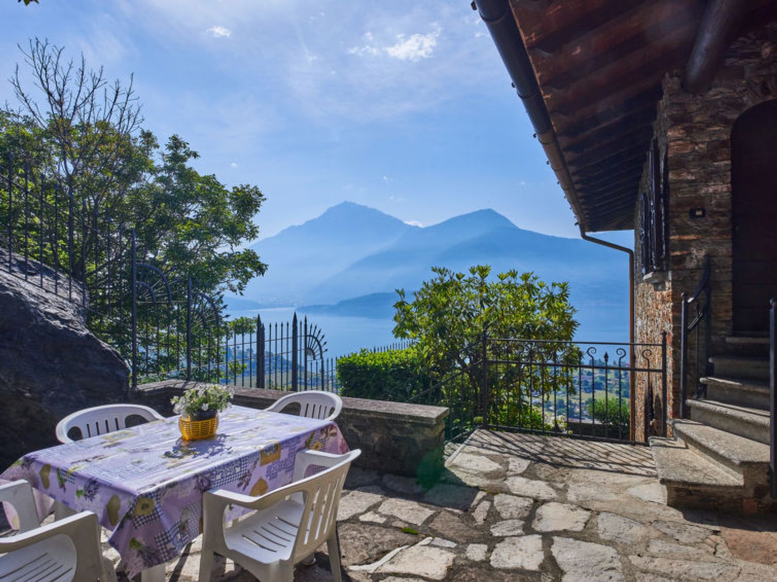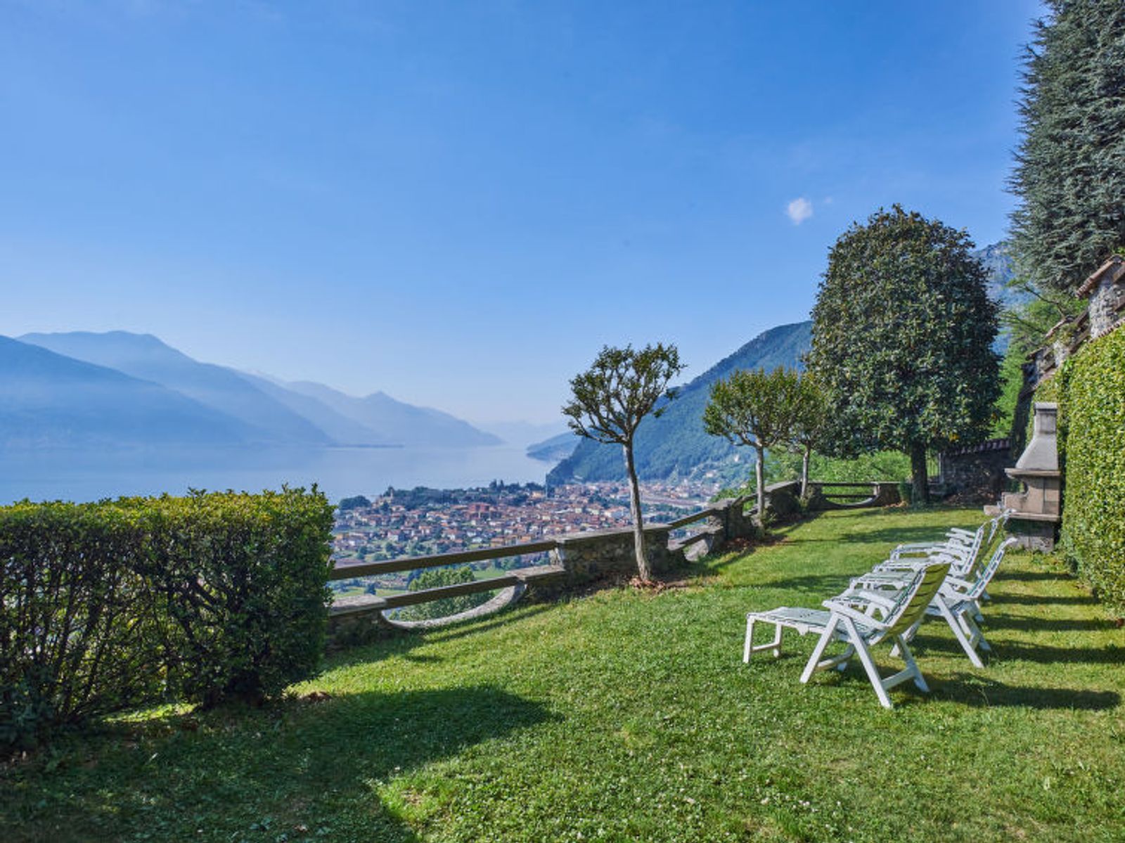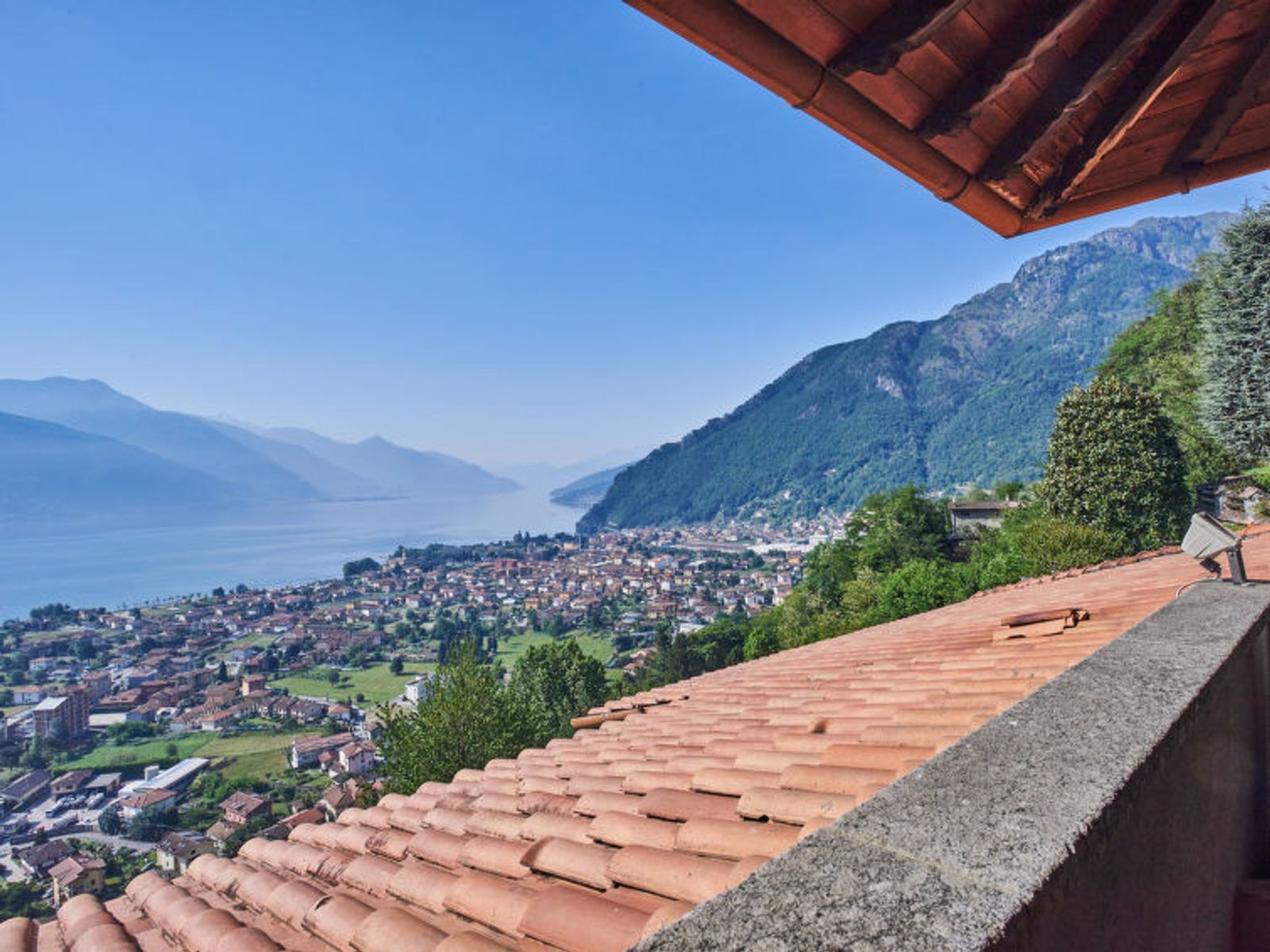 7-room house 180 m2 on 3 levels, south-east facing position. Beautiful and rustic furnishings: large living/dining room with dining table and satellite TV. Exit to the terrace. 1 room with 1 french bed (160 cm). 1 room with 2 beds. Kitchen (oven, dishwasher, 4 induction hot plates, freezer, electric coffee machine). Shower/WC. Upper floor: (exterior staircase) living/sleeping room with 1 double sofabed, dining table and satellite TV. Exit to the terrace. 1 room with 1 french bed (160 cm). Exit to the terrace. 1 room with 2 beds. Open kitchen (oven, 4 induction hot plates, electric coffee machine). Bath/WC, shower/WC. 2nd upper floor: 1 room with sloping ceilings, - 175 cm with rooflight with 2 beds. Heating. Wooden floors. 2 large terraces covered terrace. Terrace furniture, barbecue, deck chairs (4). Very beautiful panoramic view of the lake and Monte Legnone (2609 m). Facilities: children's high chair, baby cot for up to 2 year olds. Internet (WiFi, free). Parking (2 cars), garage (1 car). No internal connecting door between the separated properties. When booking this property you make a reservation for the whole house. Facilities for shared use are then for private use. IT013218C2ZM62UCFG