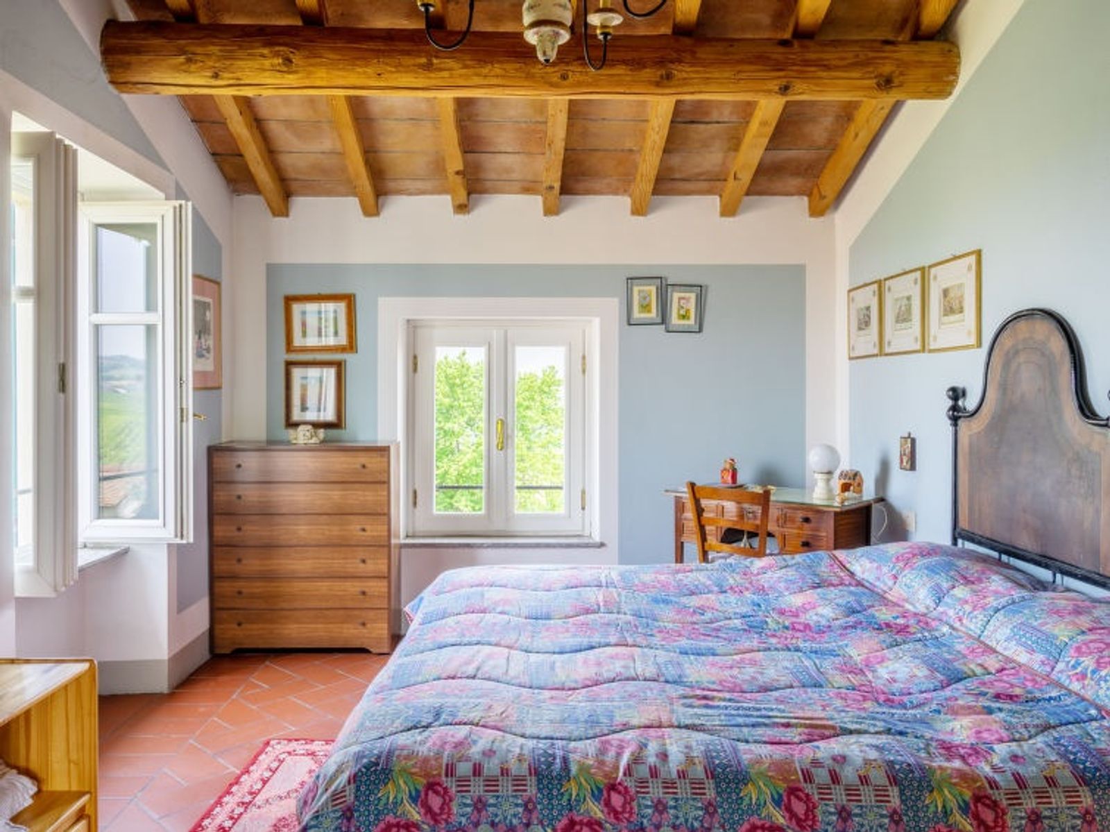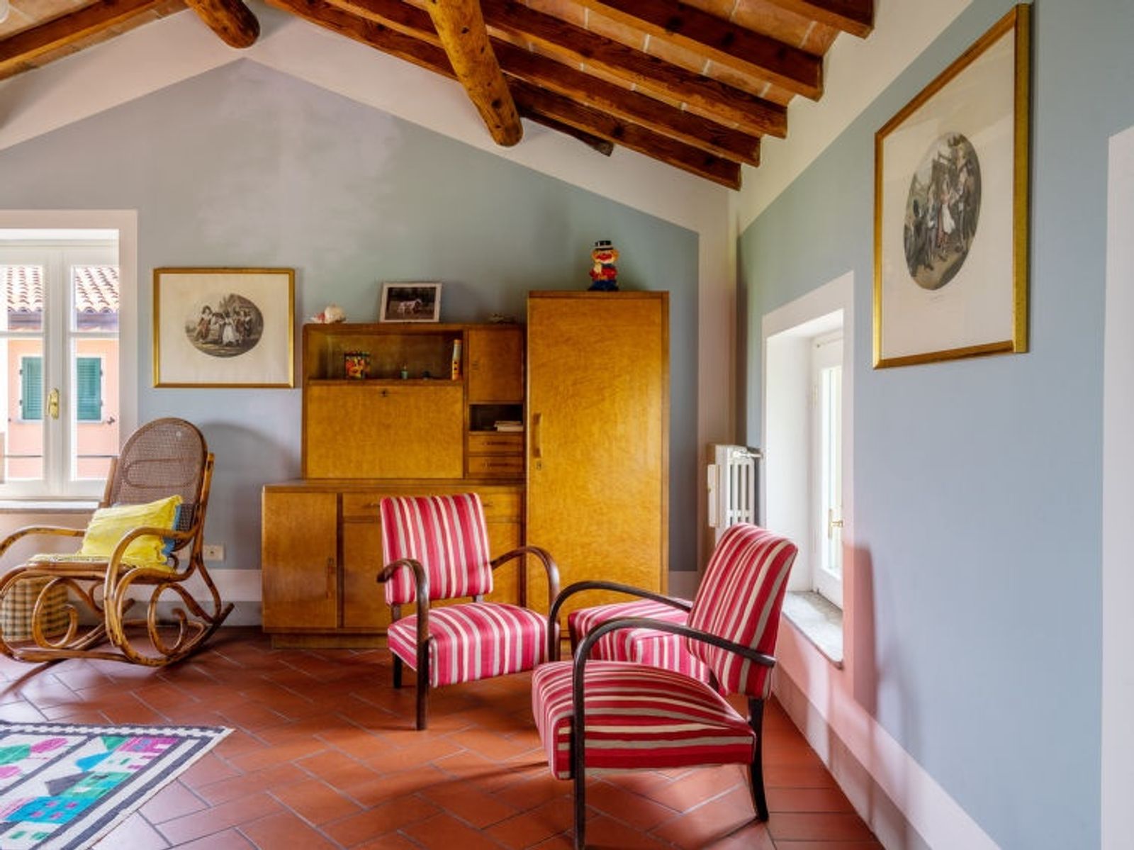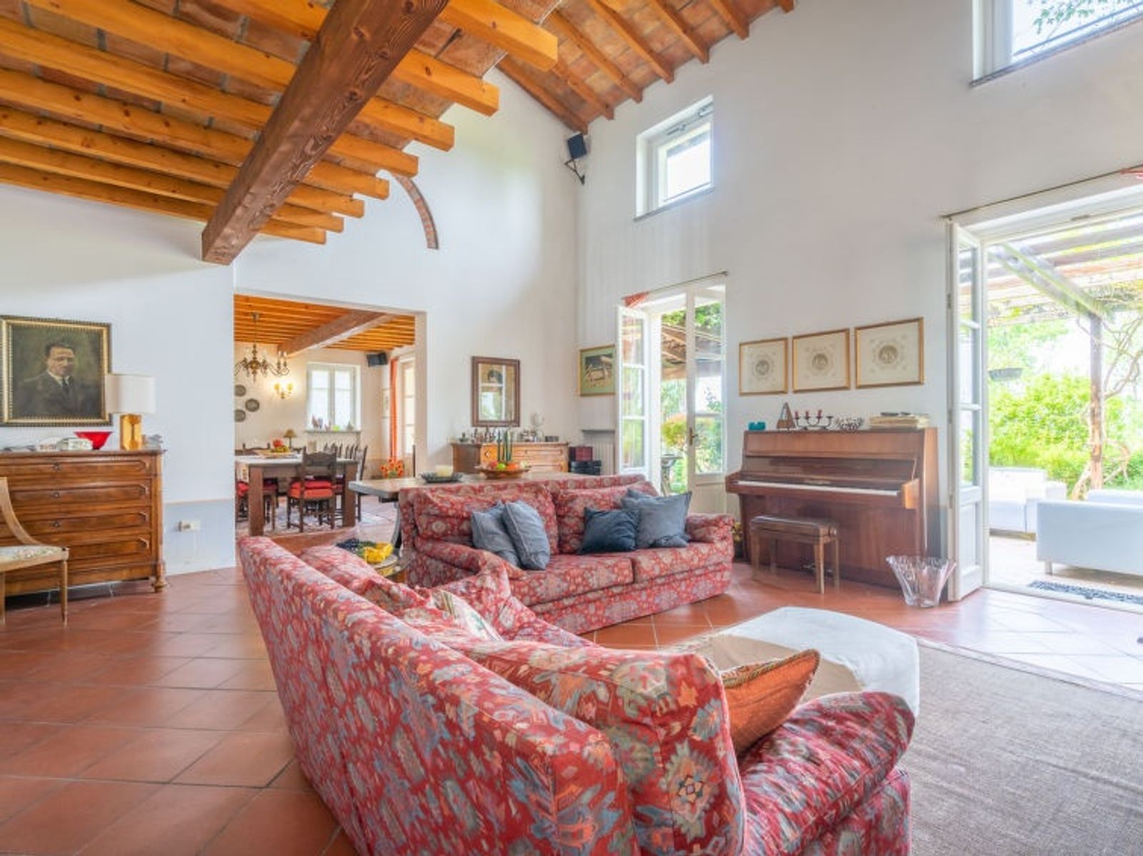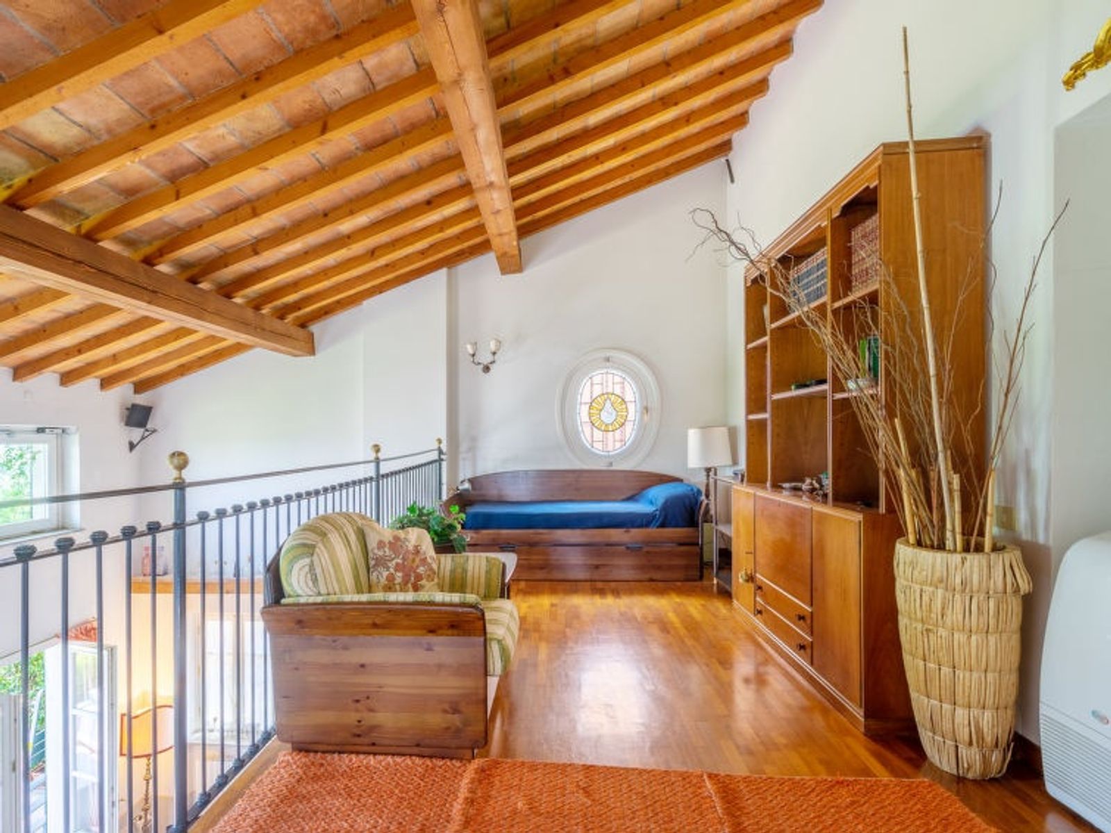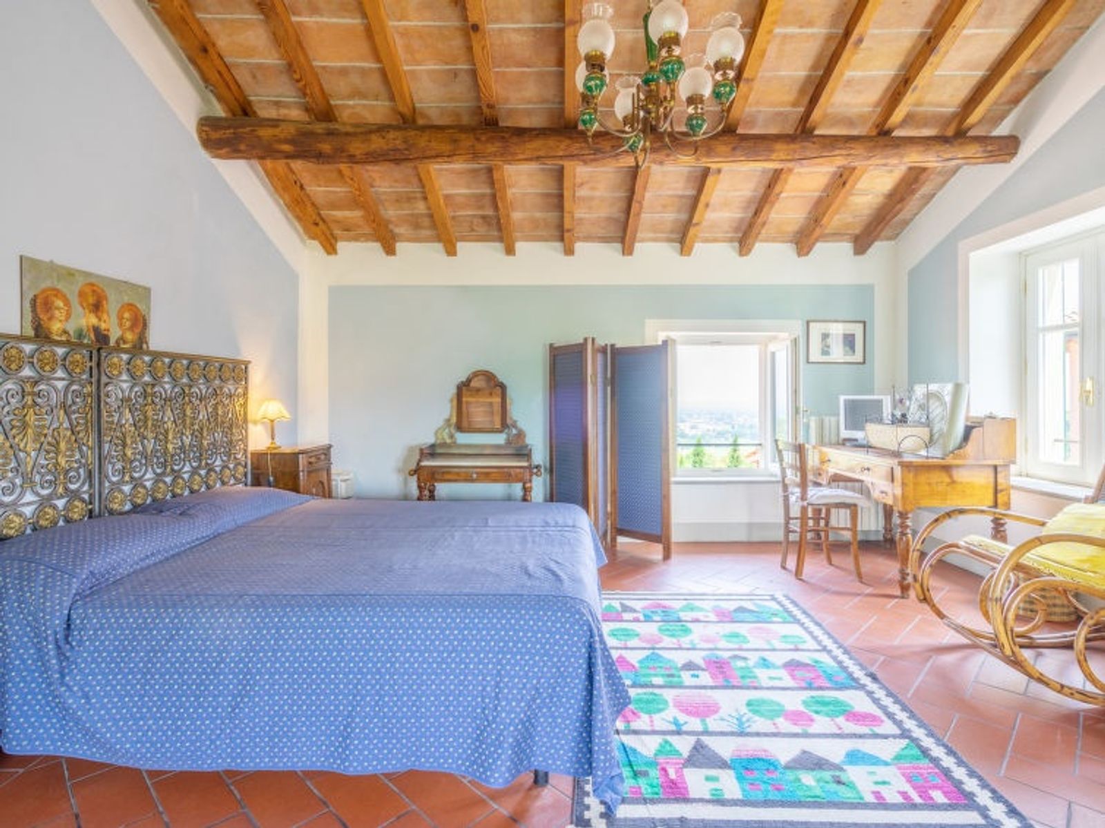 "Ca' del Vento", 7-room villa 450 m2 on 4 levels. Spacious, partly with sloping ceilings, comfortable and antique furnishings: open large living/dining room with open-hearth fireplace, dining table, satellite TV, radio, CD-player and hi-fi system. Exit to the terrace, pergola. Large kitchen (oven, dishwasher, 4 gas rings, toaster, kettle, freezer, grill, electric coffee machine, pizza oven) with small dining table. Exit to the garden. Sep. WC. Upper floor: open gallery with 1 bed. 1 room with sloping ceilings with 1 bed and air conditioning. 1 room with 2 beds, shower/WC and air conditioning. 2nd upper floor: 1 double bedroom with 1 french bed (160 cm), air conditioning. Bath/bidet/WC. 3nd upper floor: 1 double bedroom with sloping ceilings with 1 french bed (160 cm), air conditioning. 1 large double bedroom with sloping ceilings with 1 double bed and air conditioning. Shower/WC. Gas heating (extra). Parquet floors, natural stone floors. Small terrace, large terrace partly roofed. Terrace furniture, deck chairs (10), covered balcony, sitting area. Beautiful panoramic view of the valley and the countryside. Facilities: washing machine, iron, children's high chair, baby cot for up to 2 year olds, hair dryer. Internet (WiFi, free). Please note: non-smoking house. Maximum 2 pets/ dogs allowed. Private entrance. IT018187C2XIO5BEKE