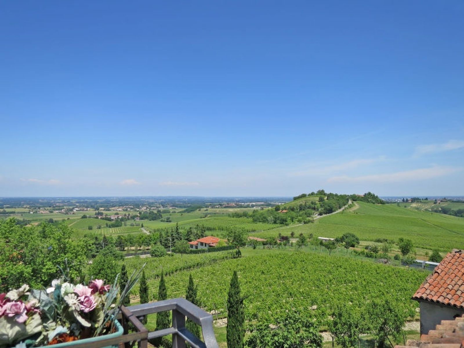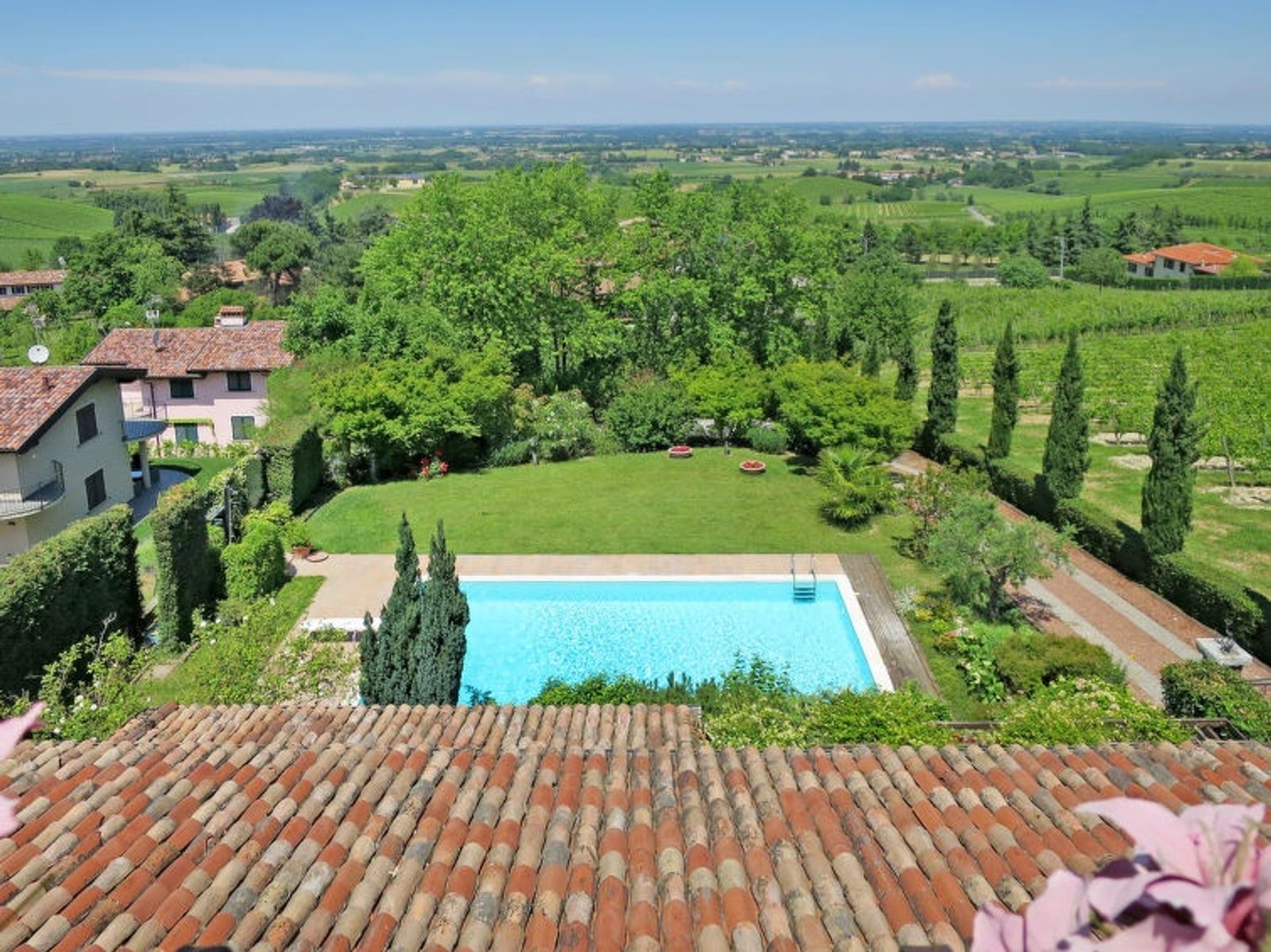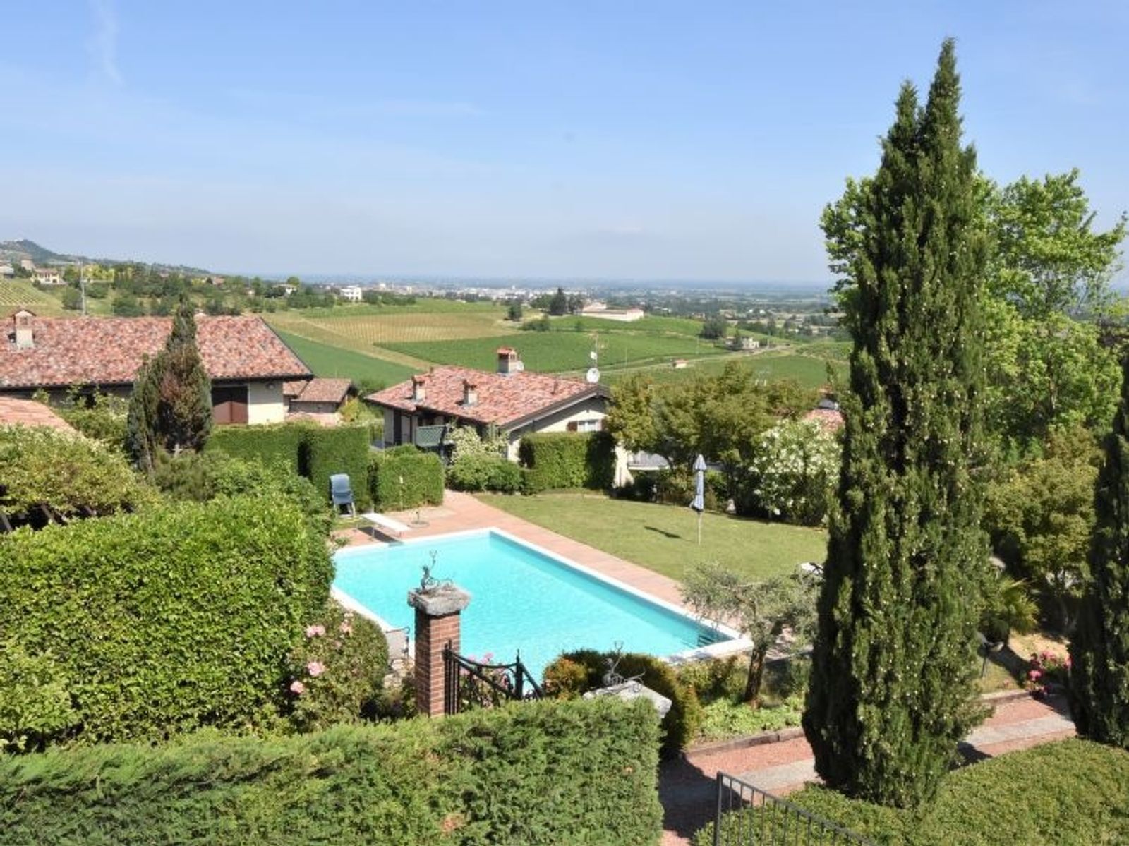 Large, beautiful villa "Ca' del Vento", 300 m a.s.l., detached from the 19th century, renovated, surrounded by fields and vineyards. In the hamlet Orzola 1 km from the centre of Zenevredo, 24 km from the centre of Pavia, 70 km from the centre of Milano, in a sunny position on top of a hill, residential area (villas), 120 km from the sea, in the countryside. Private: property 2'000 m2, terraced garden (not fenced) with lawn and trees, lawn for sunbathing, swimming pool with privacy (11 x 5 m, depth 150 - 300 cm, seasonal availability: 16.May. - 15.Oct.). Outdoor shower, pergola, garden furniture, barbecue, pool maintenance by the owner/gardener. 50 m long motor access (via unmade road). Parking (for 4 cars) at the house. Supermarket 7 km, restaurant 1.8 km, bar 1.2 km, railway station "Stradella" 3 km, thermal baths "Salice Terme" 42 km. Golf course (18 hole) 27 km. Please note: suitable for families. The owner does not accept any youth groups.