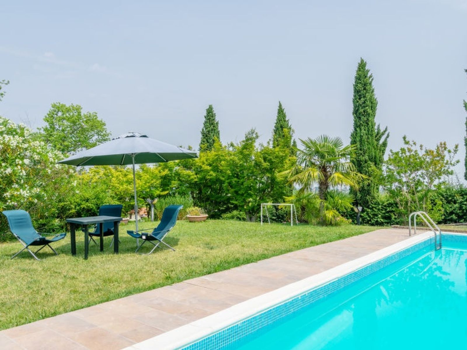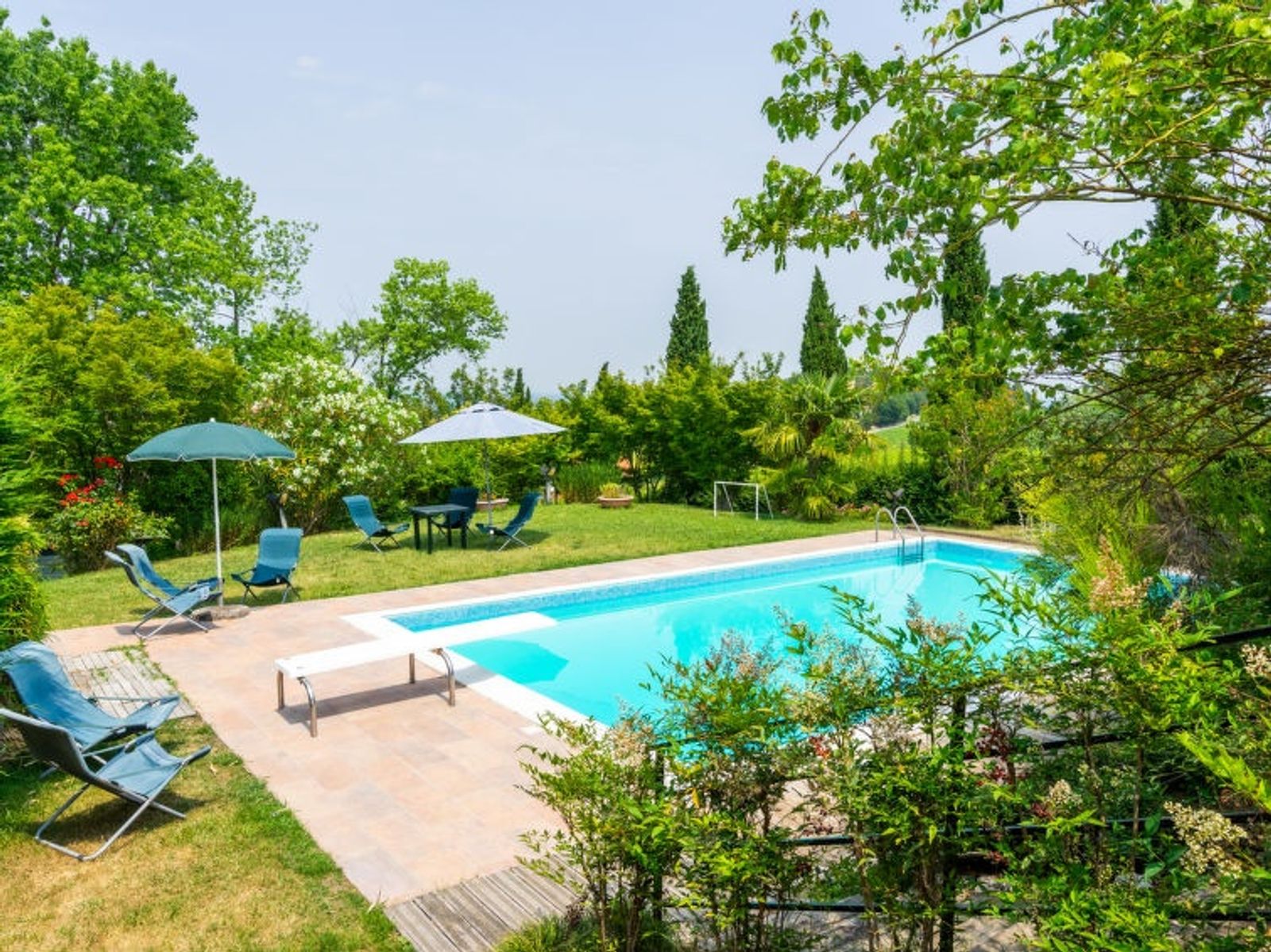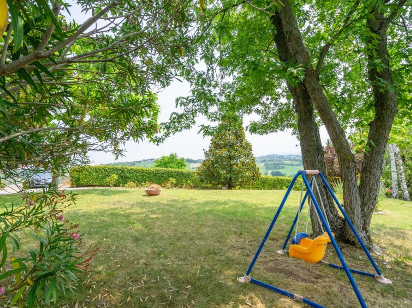 Large, beautiful villa "Ca' del Vento", 300 m a.s.l., detached from the 19th century, renovated, surrounded by fields and vineyards. In the hamlet Orzola 1 km from the centre of Zenevredo, 24 km from the centre of Pavia, 70 km from the centre of Milano, in a sunny position on top of a hill, residential area (villas), 120 km from the sea, in the countryside. Private: property 2'000 m2, terraced garden (not fenced) with lawn and trees, lawn for sunbathing, swimming pool with privacy (11 x 5 m, depth 150 - 300 cm, seasonal availability: 16.May. - 15.Oct.). Outdoor shower, pergola, garden furniture, barbecue, pool maintenance by the owner/gardener. 50 m long motor access (via unmade road). Parking (for 4 cars) at the house. Supermarket 7 km, restaurant 1.8 km, bar 1.2 km, railway station "Stradella" 3 km, thermal baths "Salice Terme" 42 km. Golf course (18 hole) 27 km. Please note: suitable for families. The owner does not accept any youth groups.