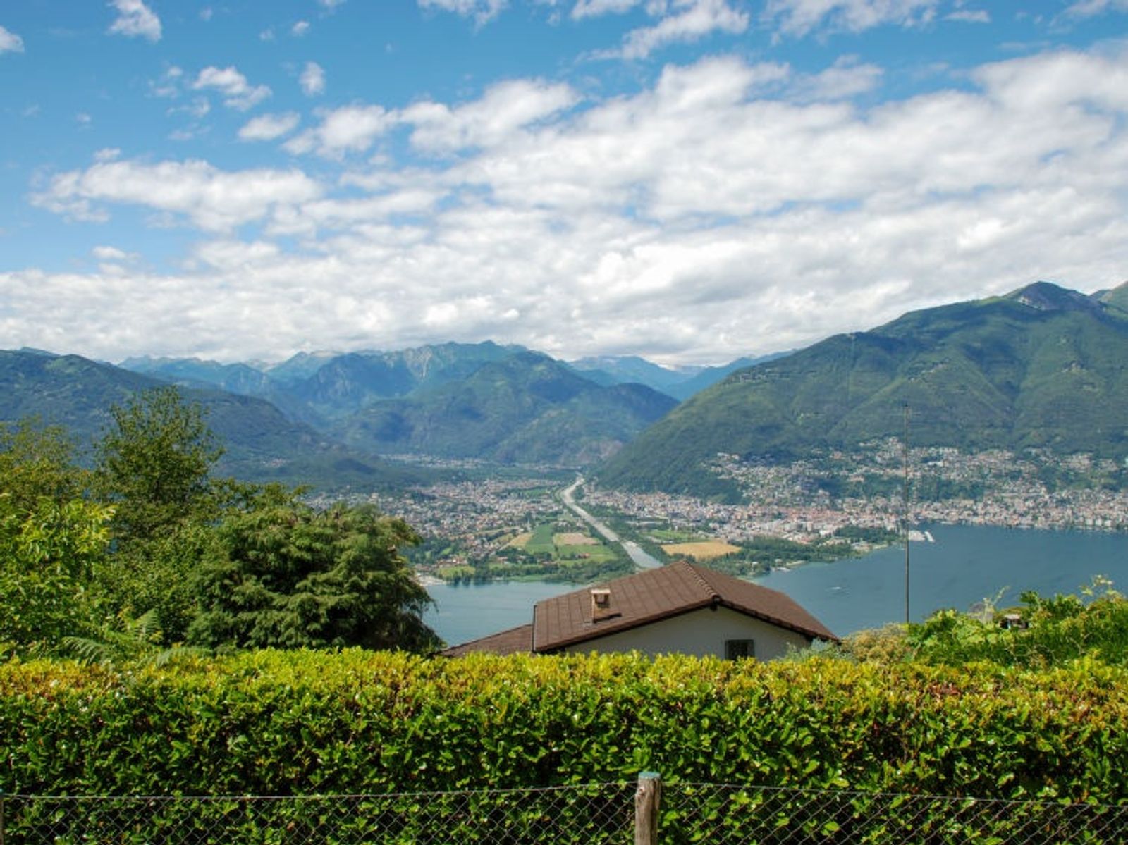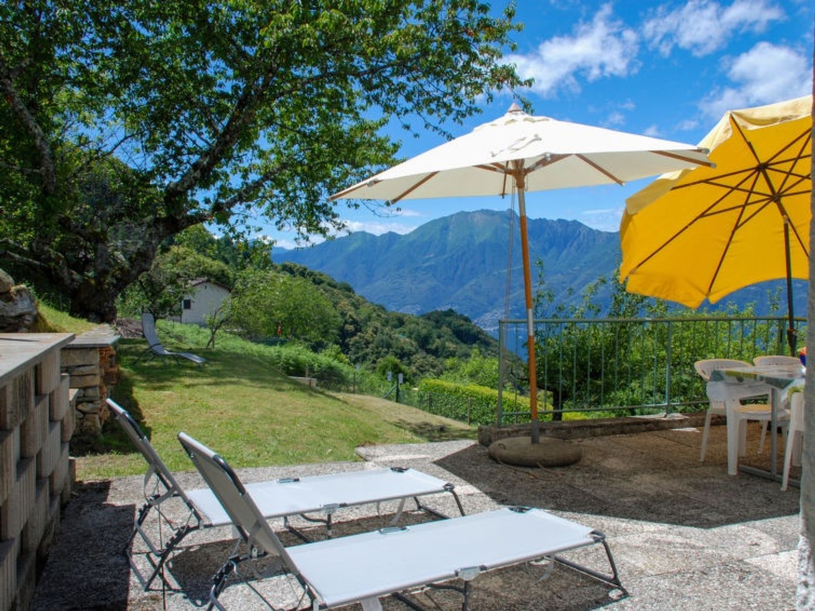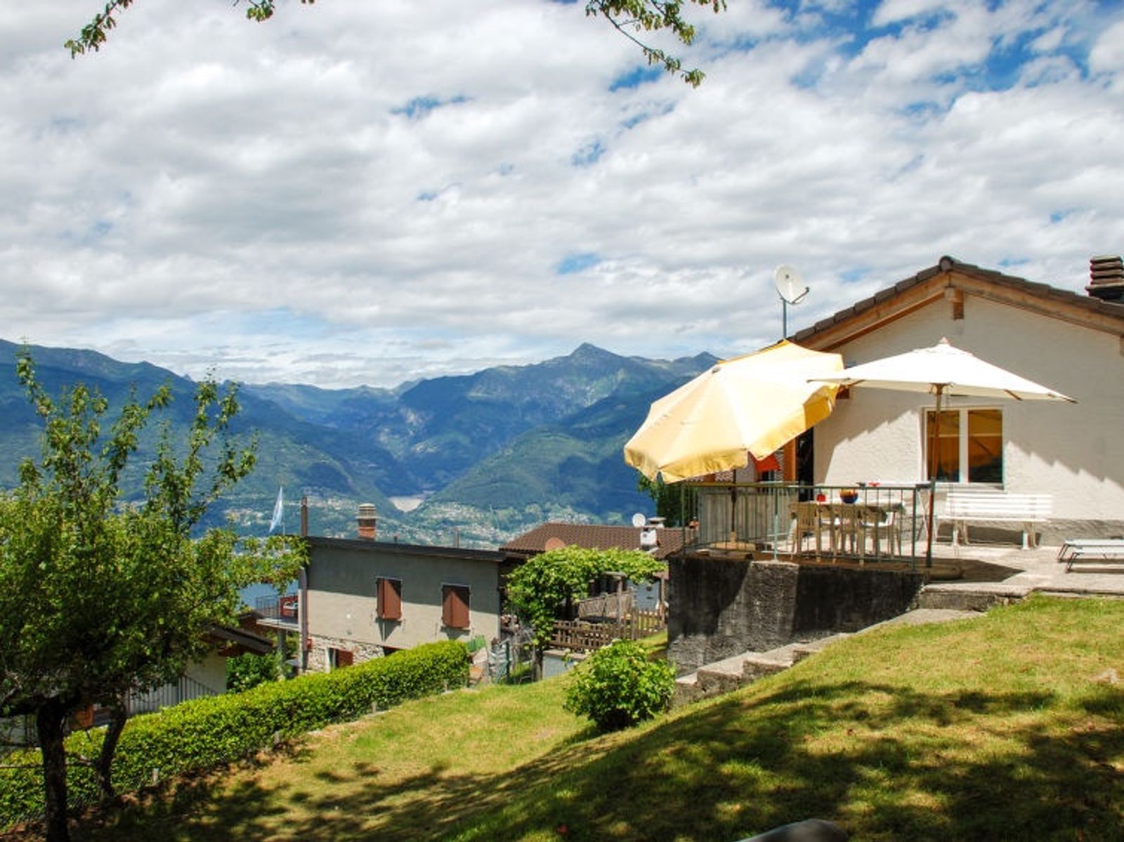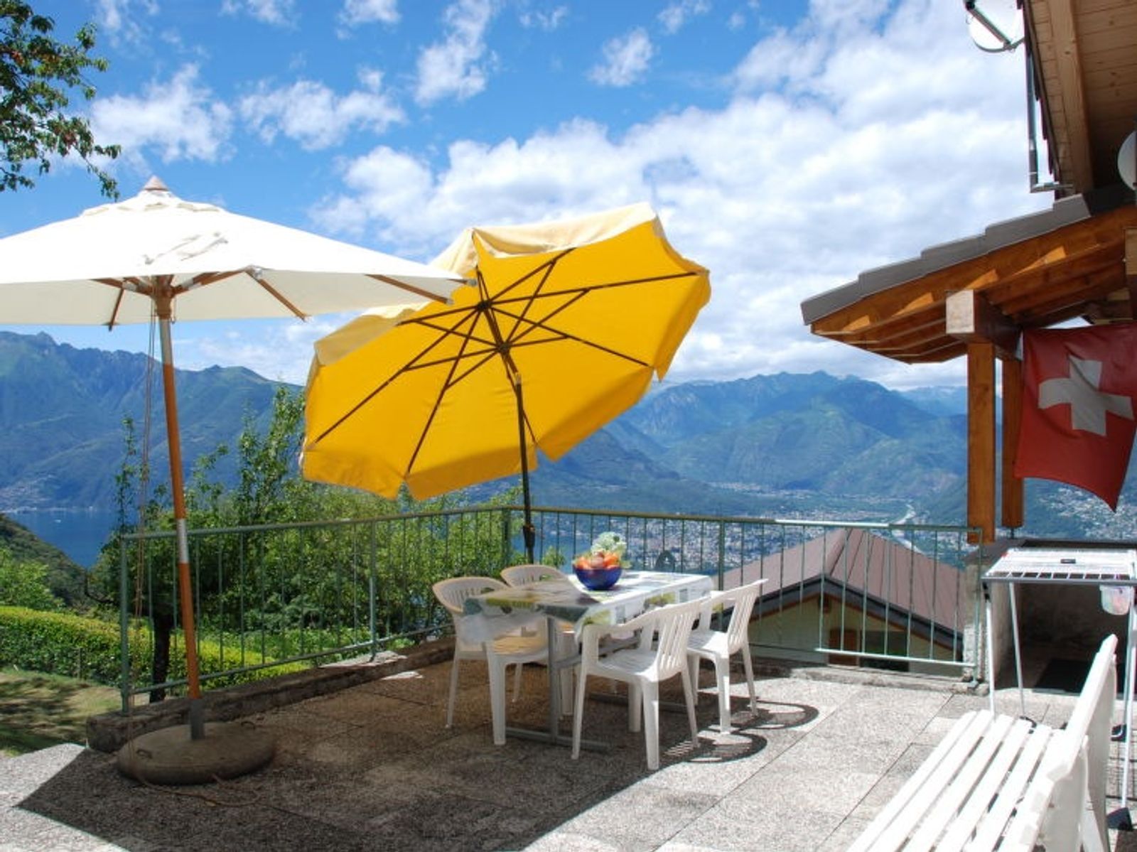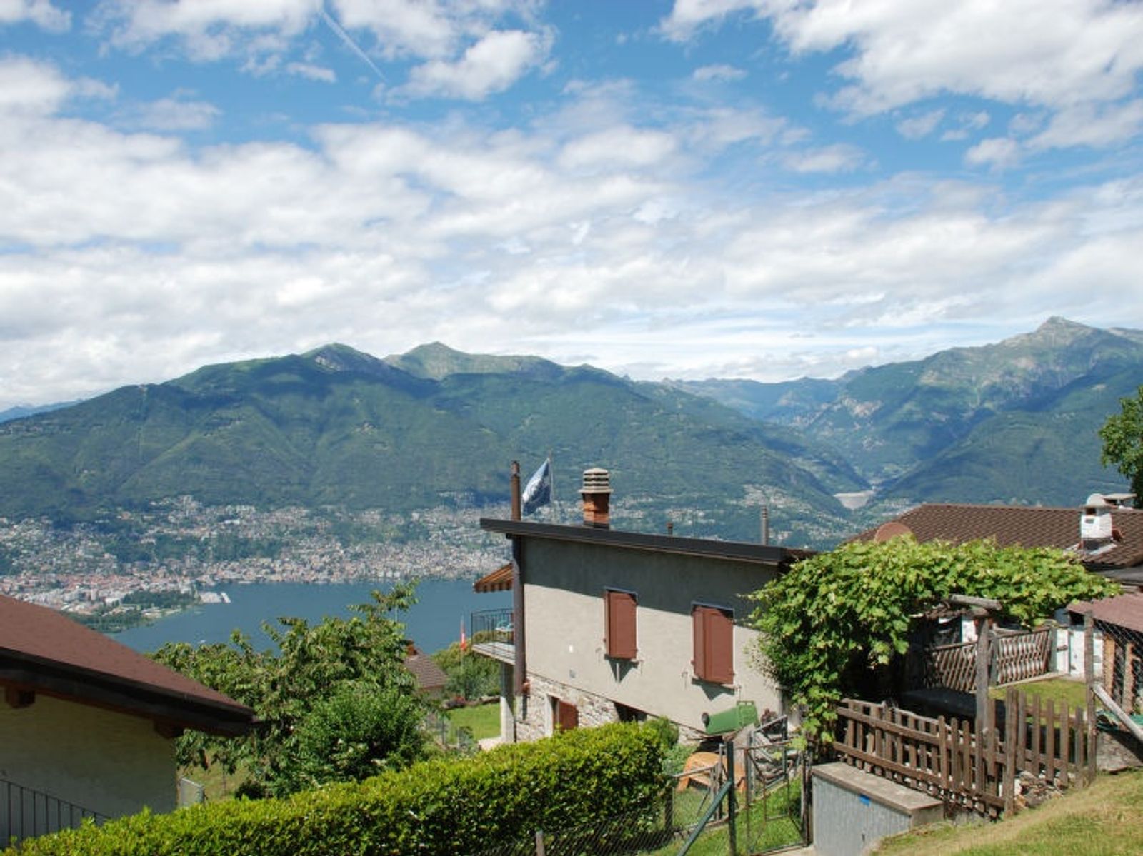 "Baita Monti di Piazzogna", 3-room house 55 m2. Object suitable for 2 adults + 2 children. Practical and cosy furnishings: open large living/dining room with open-hearth fireplace and Scandinavian wood stove (only for decoration), dining table and satellite TV (flat screen). Exit to the garden, to the terrace. 1 small double bedroom with 1 double bed (160 cm, length 200 cm). 1 room with 1 x 2 bunk beds (90 cm, length 200 cm). Open kitchen (oven, 4 ceramic glass hob hotplates, toaster, kettle, electric coffee machine, Capsules for coffee machine (Dolce Gusto) extra, raclette grill, fondue Set (cheese)). Shower/WC. Electric heating. Large patio partly roofed. Terrace furniture, barbecue, deck chairs (3), sitting area. Marvellous panoramic view of the lake, the mountains and the countryside. Facilities: hair dryer. Internet (WiFi). Suitable for families. Maximum 1 pet/ dog allowed. Fantastic view of the dam, Locarno / Ascona and the wonderful landscape, Lake Maggiore with the Brissago Islands. Baby equipment, you can bring your own. NL-00005892